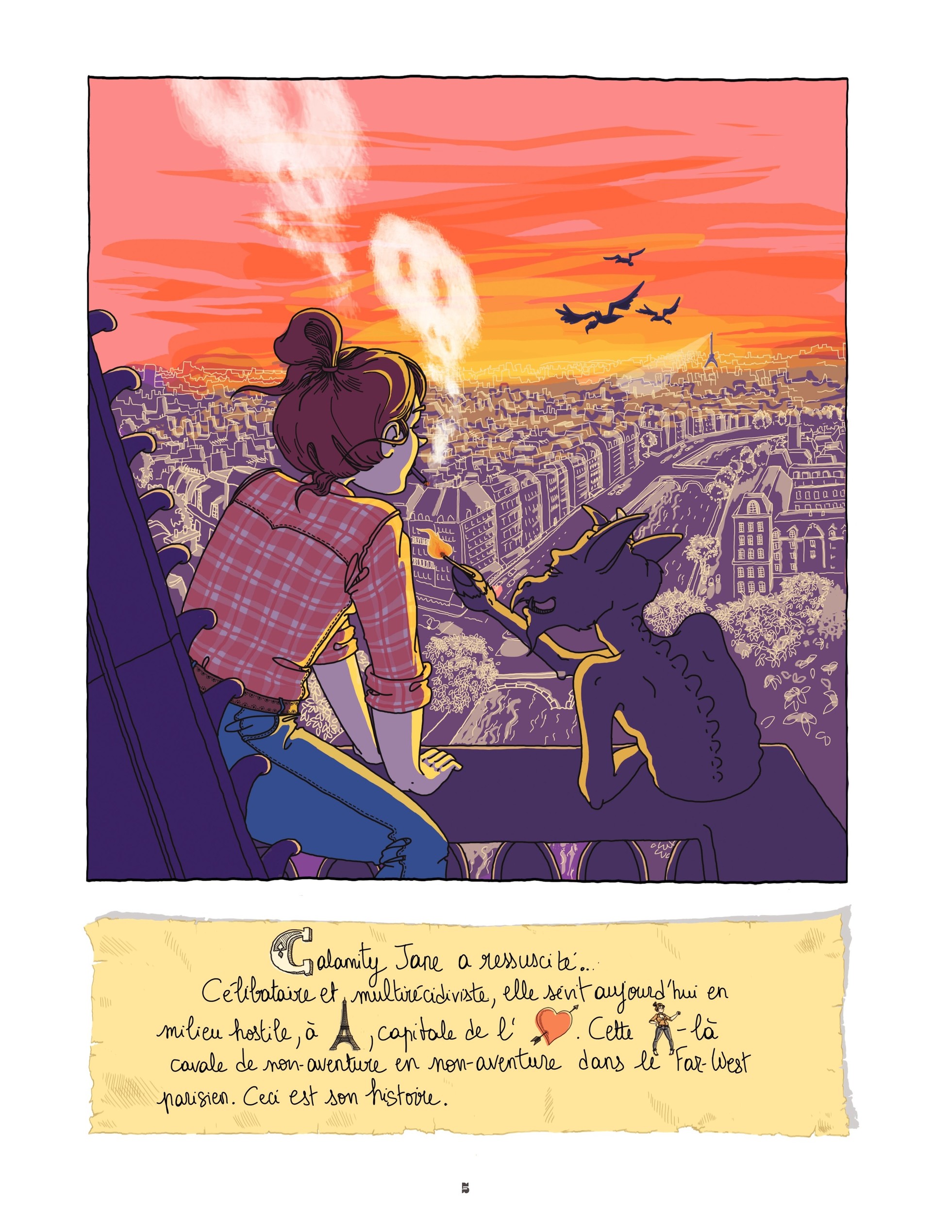 Calamity Jane a ressuscité. Elle poursuit la légende de son homonyme et ancêtre adoptive dans le Paris d’aujourd’hui. Mais modernité ne rime pas toujours avec bonnes manières. Dans ce Far West contemporain, notre héroïne évolue de non-aventure en non-aventure où son quotidien devient un véritable combat pour s’imposer. Recherche d’un colloque version Wanted, beuverie à la taverne branchouille du coin, duel avec sa banquière… Les scènes de la vie de tous les jours sont revisitées par cet esprit original très loin des clichés de « la Parisienne ».