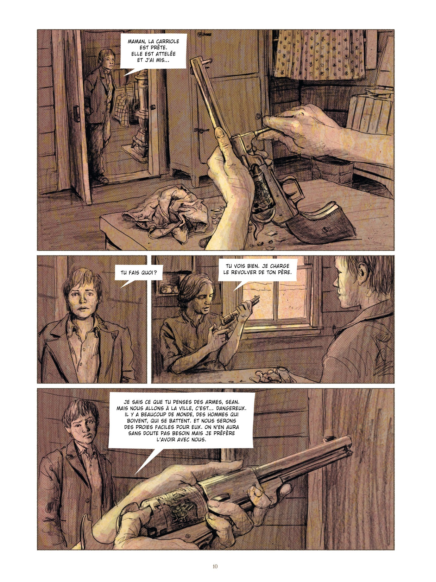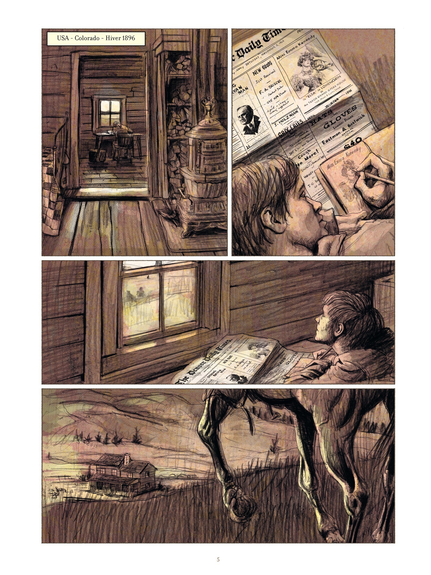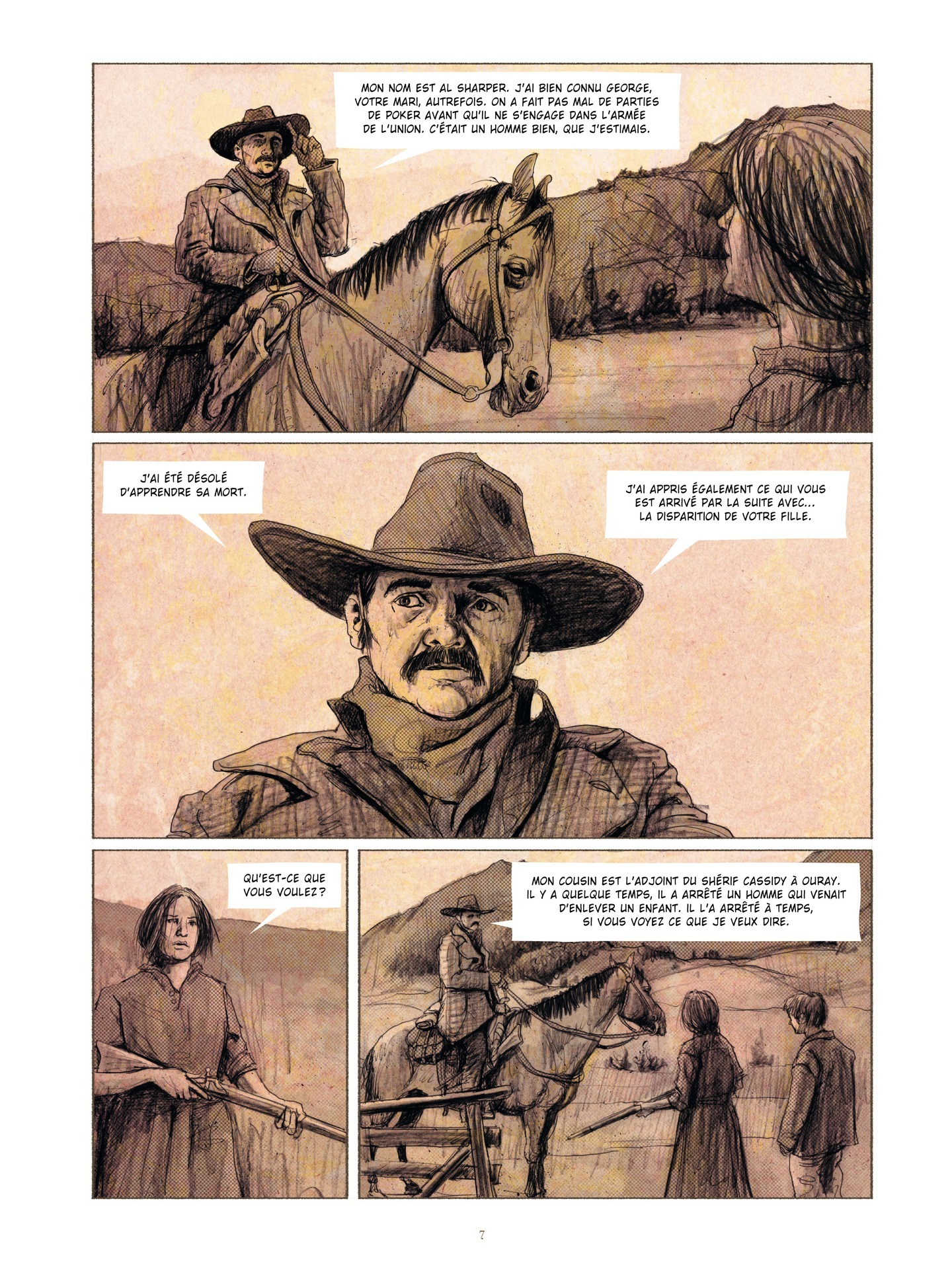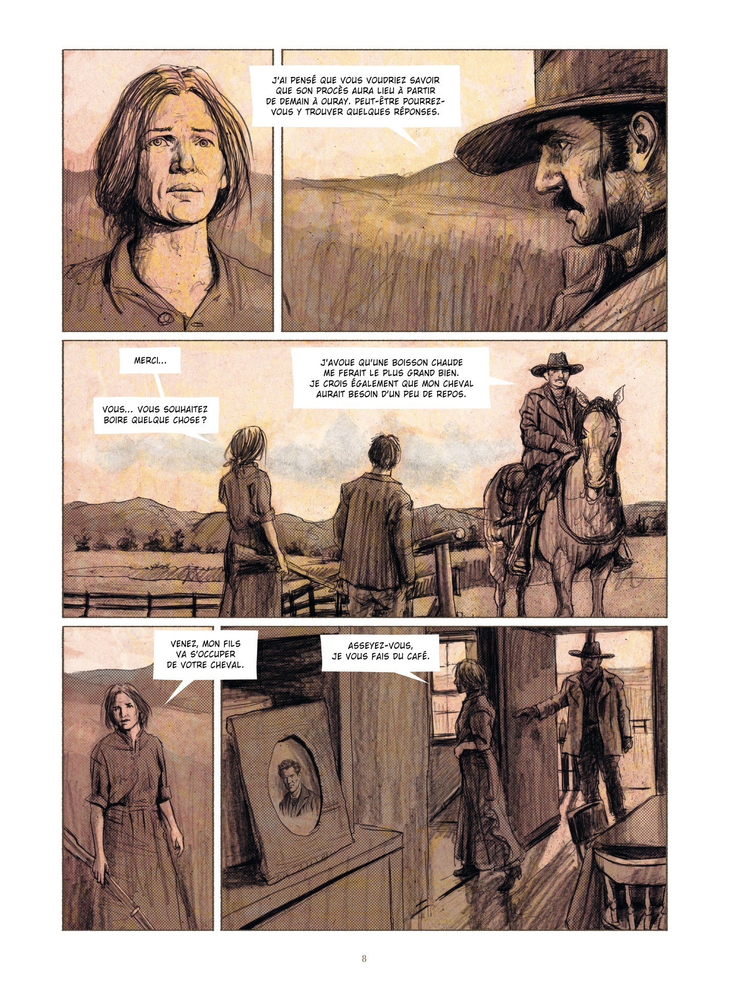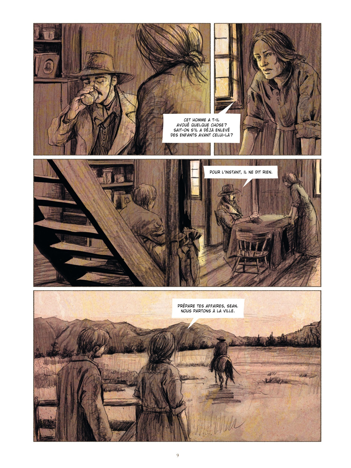 1896, dans l’ouest sauvage, un homme va être jugé pour l’enlèvement et le meurtre de plusieurs enfants. Une mère dont la fille a disparue vient au procès en espérant trouver la vérité, et prête à employer tous les moyens pour y parvenir. Le dessin, prenant, percutant, nous entraîne dans un entrelacs de bruns dans une chevauchée dramatique. Intérieurs de grotte ou de cellule, et même extérieurs...