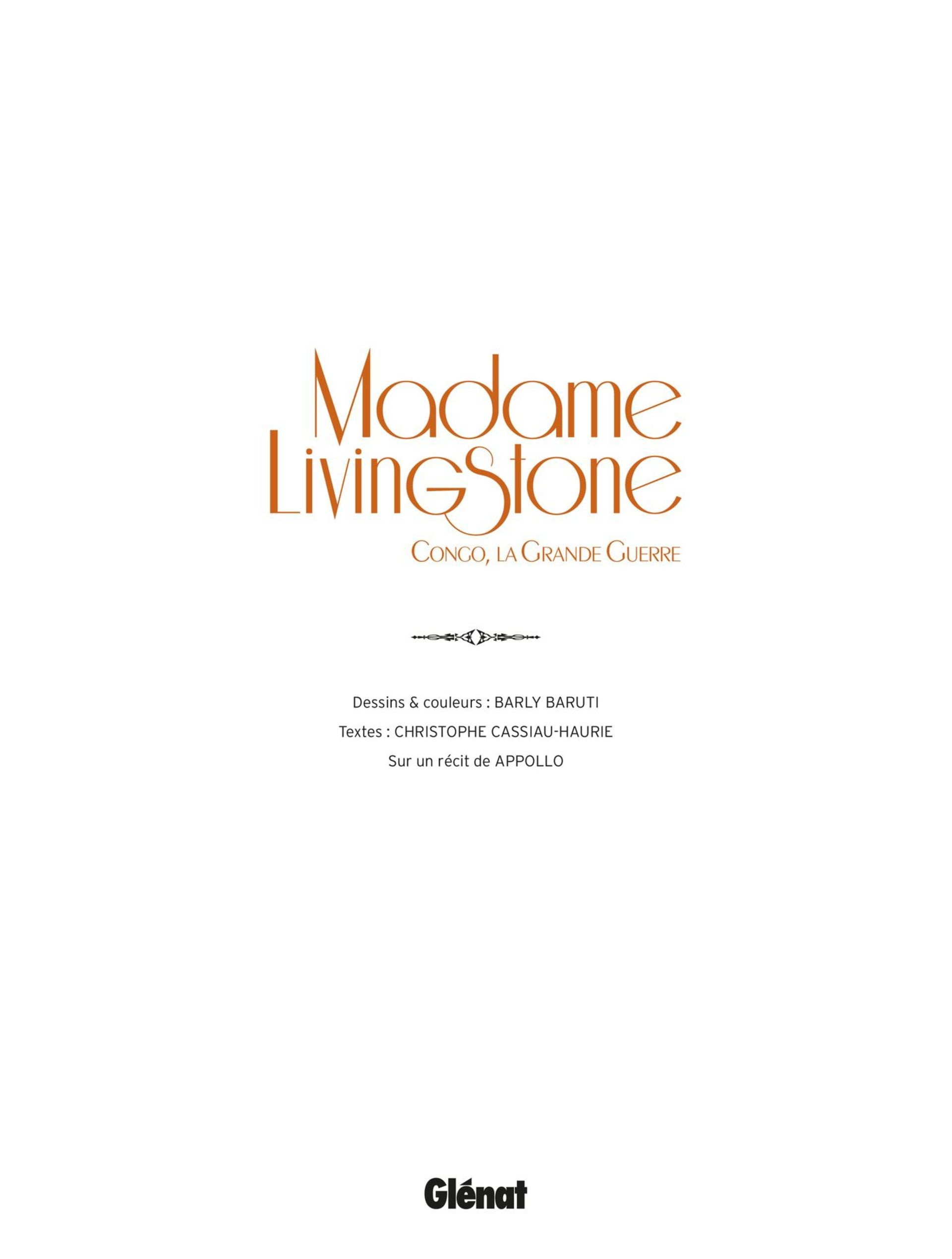 En Afrique centrale durant la Première Guerre mondiale, laviateur Gaston Mercier, lieutenant de larmée royale belge, est chargé de couler un cuirassé allemand sur le lac Tanganyika. Pour en découvrir la position exacte, on lui assigne un guide un peu particulier... Ce dernier, un métis énigmatique en kilt qui semble beaucoup plus instruit que les autres autochtones, prétend être le fils du célèbre explorateur David Livingstone. Petit à petit, alors que la guerre entre puissances coloniales belge et allemande fait rage au cur du continent noir, le jeune pilote belge va essayer den apprendre un peu plus sur lhistoire de cet homme quon appelle « Madame Livingstone ».S'appuyant sur un récit dApollo, Christophe Cassiau-Haurie mêle ici aventure et amitié sur fond de Première Guerre mondiale en Afrique. Lexotisme des lieux y est magnifiquement restitué par le dessin de Barly Baruti, en couleurs directes. Lalbum sera en outre prolongé dun cahier bonus de 16 pages éclairant sur le contexte historique.