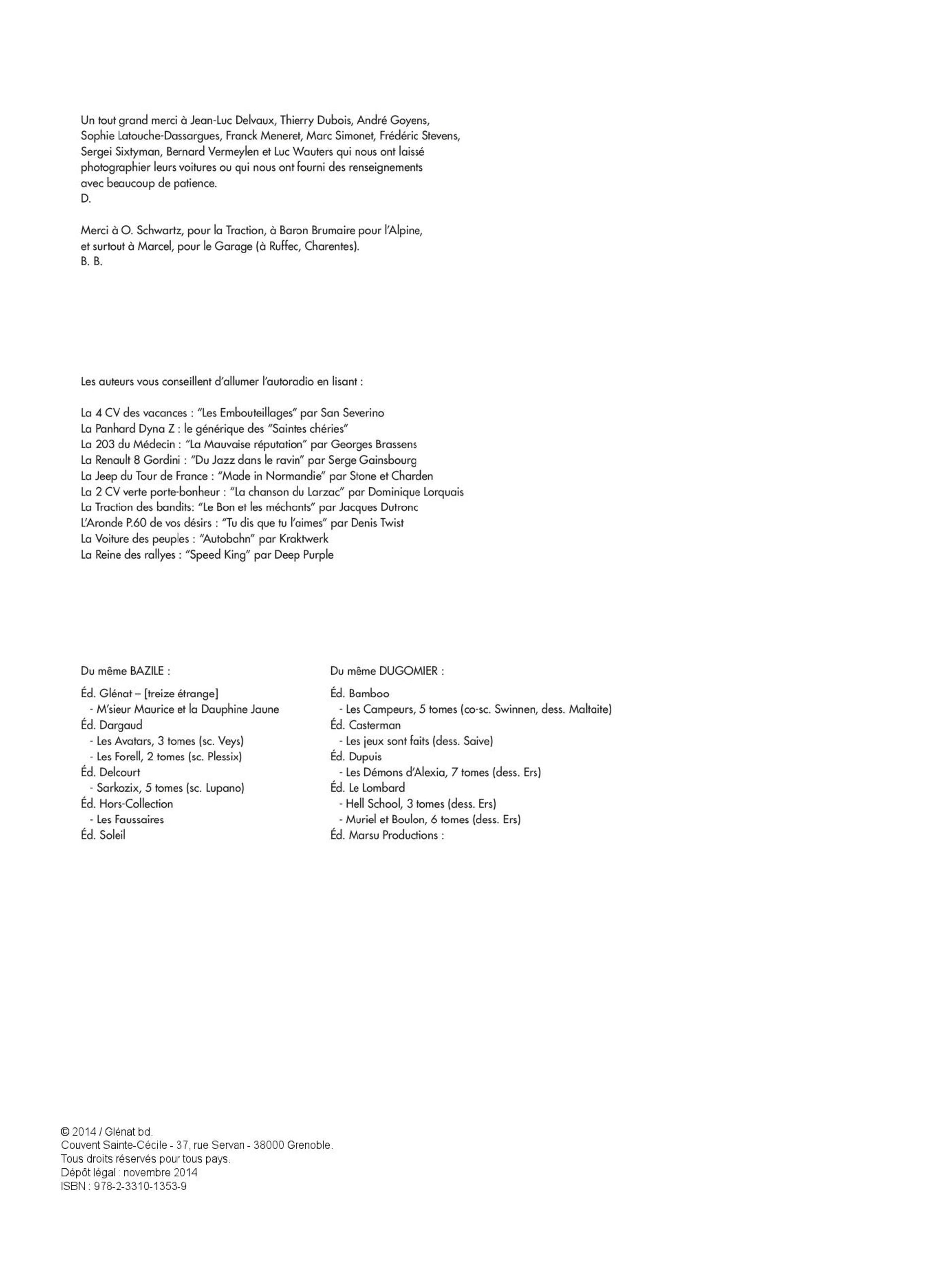 Les plus grandes autos sont celles qui ont marqué les consciences parce qu’elles ont représenté l’esprit d’une époque. Dugomier fait appel au dessin élégant de Bruno Bazile et son talent à restituer les bolides pour nous remémorer quelques-unes de ces grandes « voitures populaires ». Ainsi, à travers une série d’histoires courtes mélangeant subtilement informations techniques et étude sociologique du conducteur, retrouvez 10 modèles de voitures anciennes devenus célèbres, parmi lesquelles on retrouve la 4 CV des vacances, la Peugeot 203 du médecin, la Renault 8 Gordini ou encore la Jeep du Tour de France.
