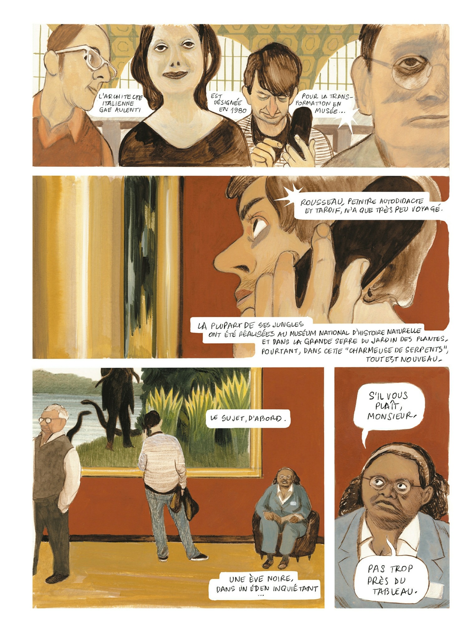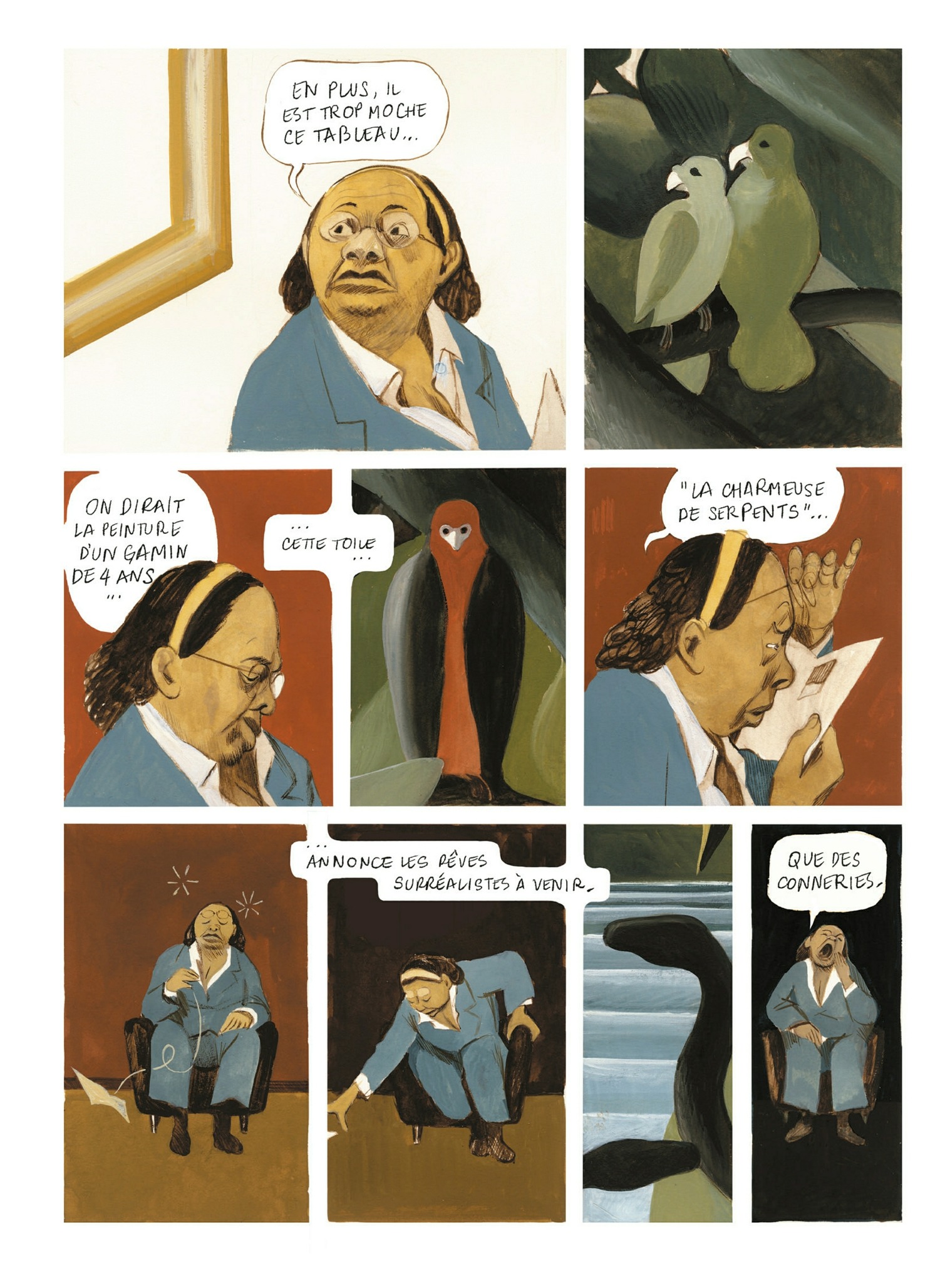 Une balade à l’intérieur du musée d’Orsay, cela ne se refuse pas… surtout quand elle se fait au cœur des œuvres exposées qui racontent la vie de leurs créateurs à travers le rêve ( ?) d’une gardienne absorbée dans le tableau « La charmeuse de serpents » du douanier Rousseau. On découvre des épisodes (inventés ou réels ?) des vies de quelques peintres célèbres : Degas, Ingres, Morisot, Cézanne, Ren...
