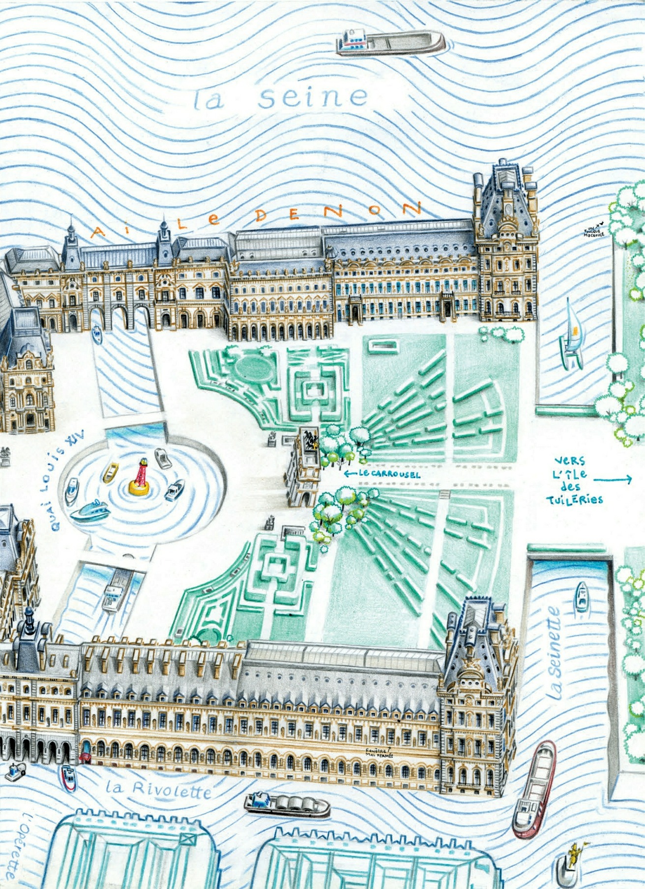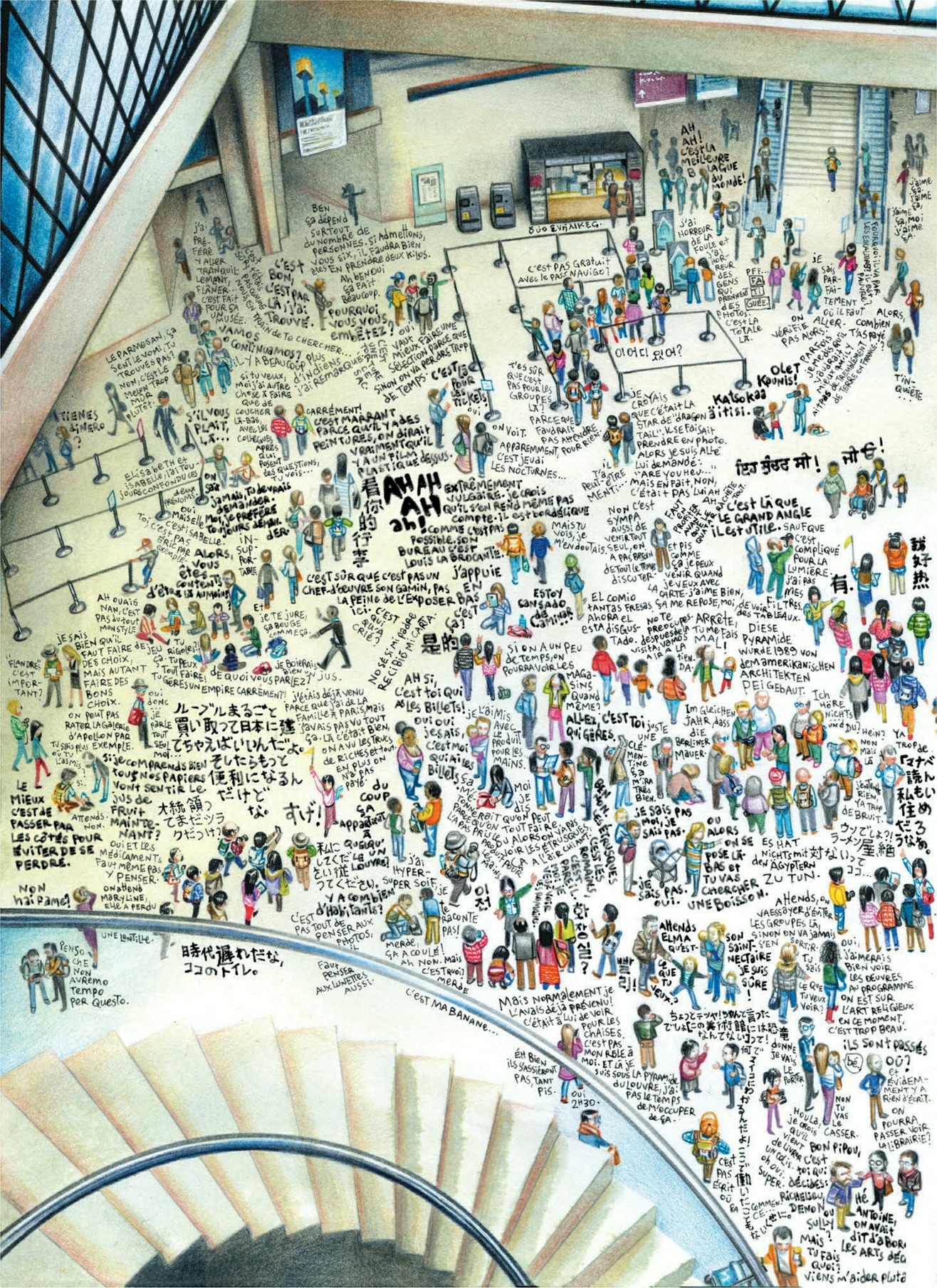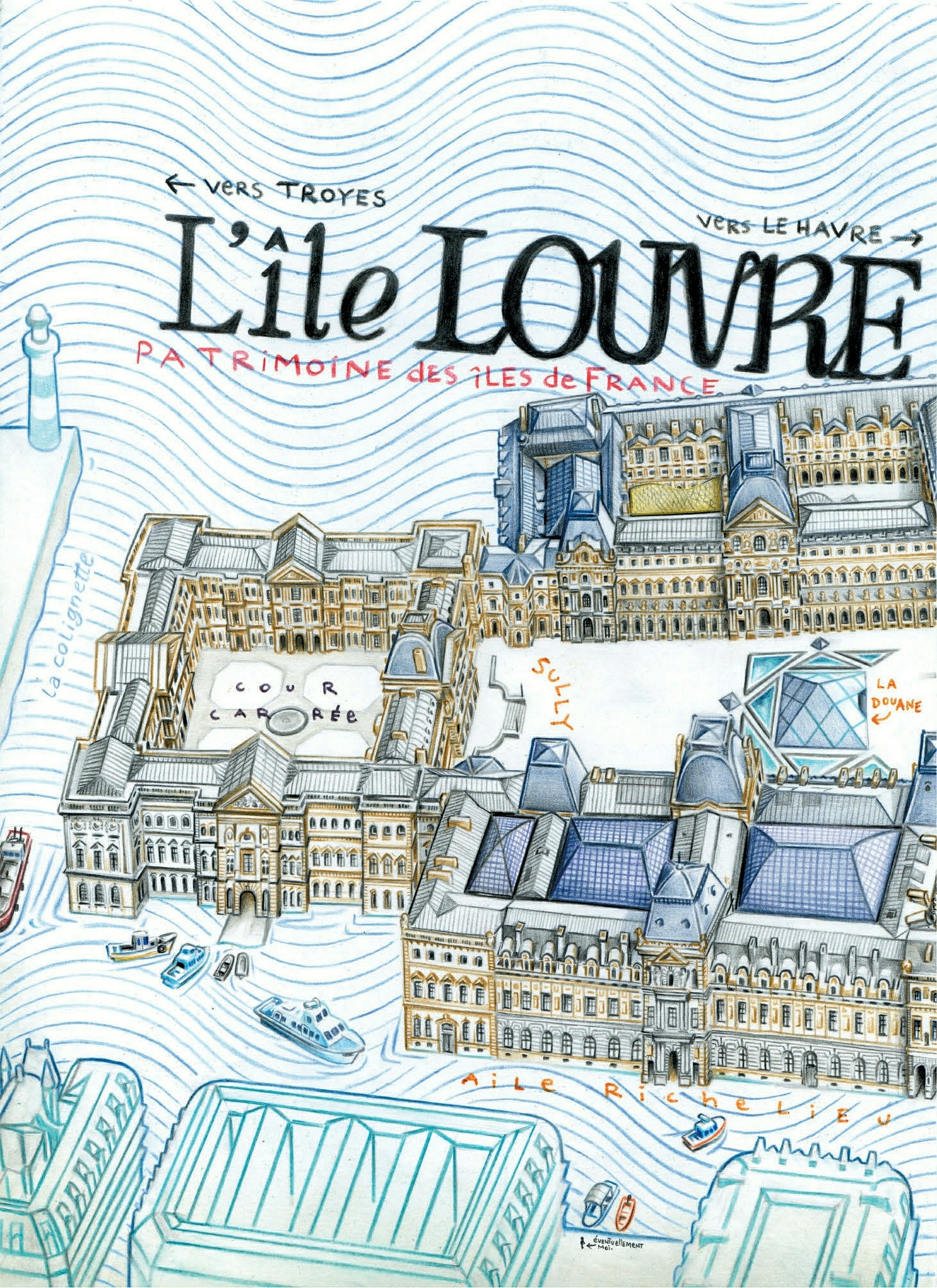 Le musée du Louvre est devenu île, sous les crayons de couleurs de Florent Chavouet. Muni d'un pass délivré par les autorités du musée, il se rend sur ce territoire insulaire à la rencontre de ses habitants (ceux qui travaillent dans cette institution), de ses visiteurs (les touristes du monde entier) et de ses paysages (l'ensemble des salles et des oeuvres exposées). Carnet de voyage en main, l'auteur s'attache à nous décrire cette île-musée et ses traditions. Au fur et à mesure de ses déambulations, il nous plonge ainsi dans la vie quotidienne du Louvre, restituant avec un sens du détail digne des plus grands enlumineurs !