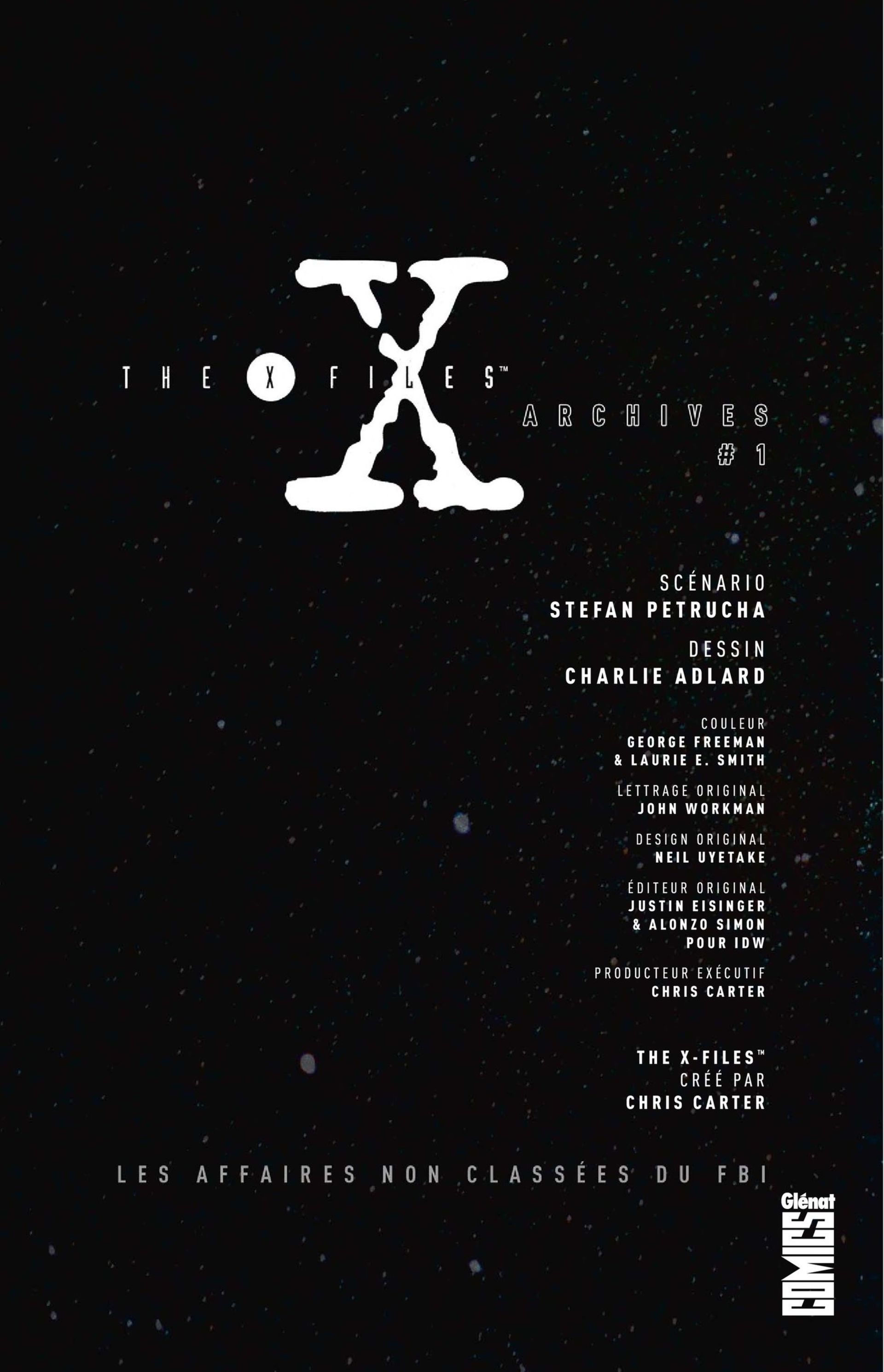 Avec The X-File Archives, faites équipe avec Mulder et Scully et percez une nouvelle série de mystères ! Savamment construites par Stefan Petrucha et dessinées par Charlie Adlard (le dessinateur de Walking Dead), ces enquêtes se déroulant parallèlement à la série TV nous mettent une nouvelle fois face à la menace Alien et à la conspiration… La vérité est ailleurs !