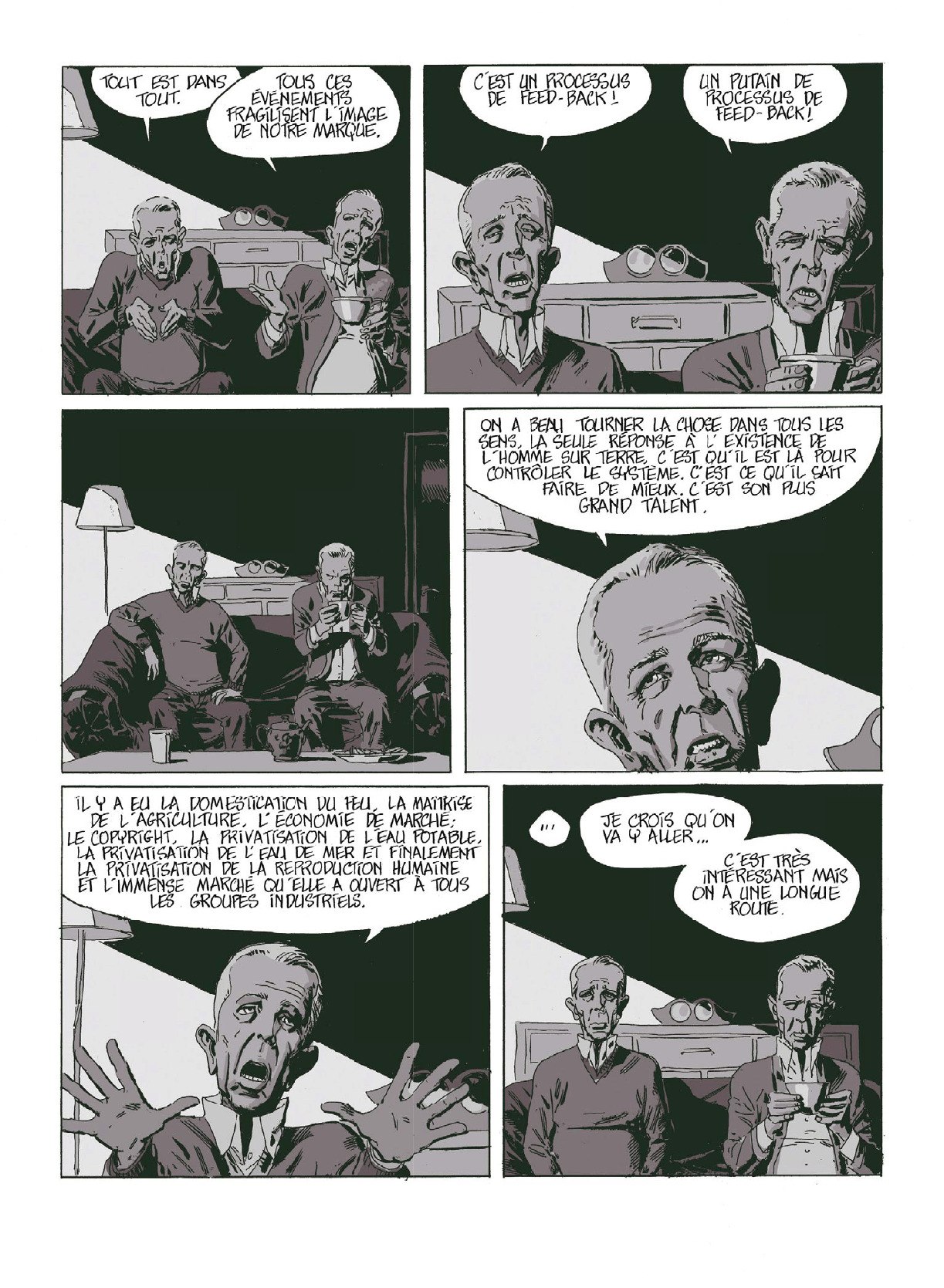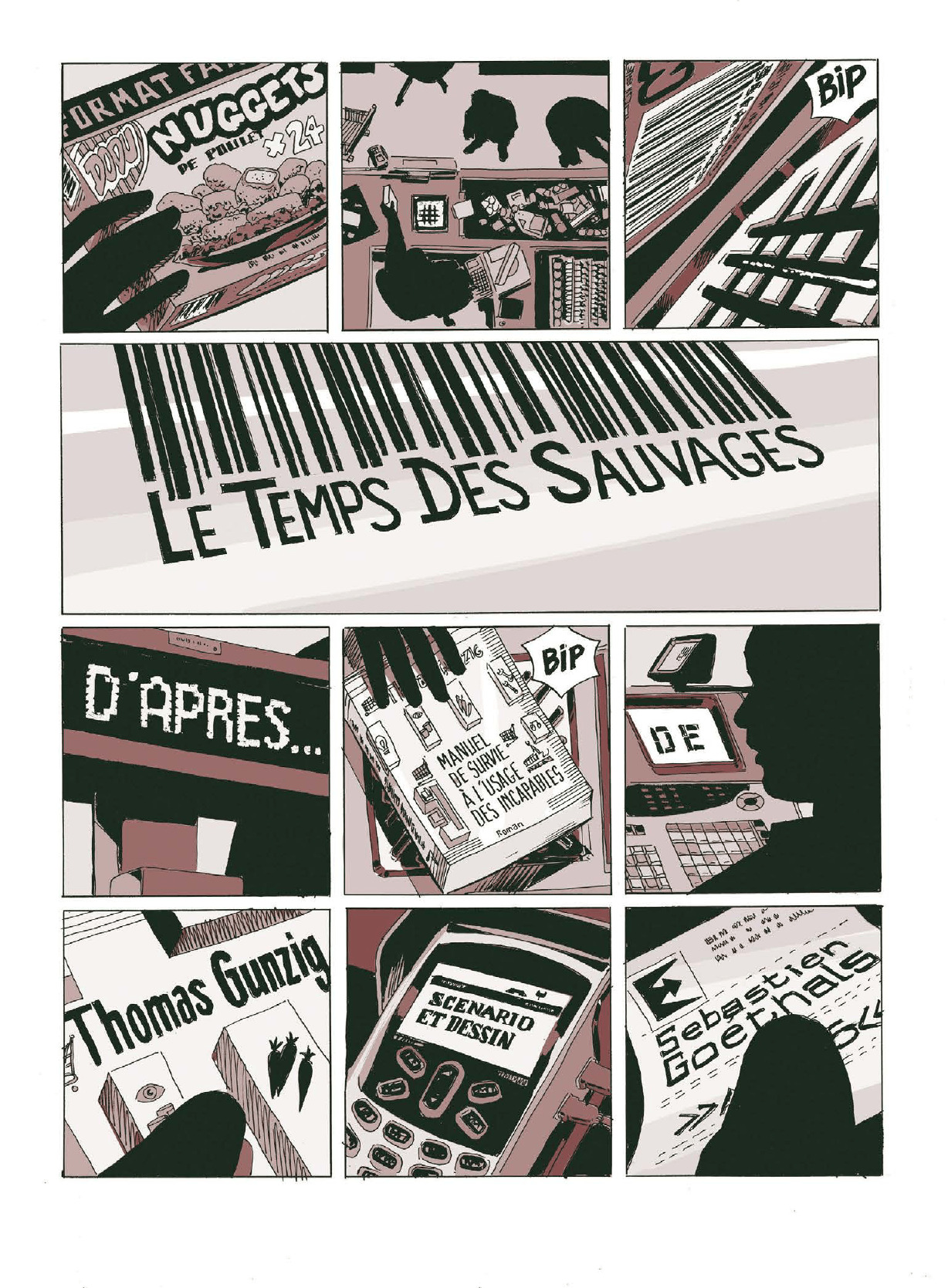 Manuel de survie à l’usage des incapables, quatrième roman de l’auteur Belge Thomas Gunzig dénonce la société contemporaine qui consomme à outrance et sans garde-fou. Rentabilité à tous prix et compétition insatiable pour le profit en tout. Dépenses matérielles et débauche humaine. Le monde connait un engrenage maladif. C’est la décadence. Gunzig, en marge des clichés sur le sujet parvient à le raconter avec autant d’humour que de cynisme. Ses personnages sont monstrueux et viennent nourrir une fable atroce mais drôle qui se joue tout autant des codes du thriller que du roman noir dans un rythme saccadé comme pour dire les convulsions du monde en bascule. L’adaptation personnelle qu’en propose Sébastien Goethals révèle les ambiances dantesque et kaléidoscopique du roman, sa poésie et sa violence. Le Temps des sauvages croque un monde féroce où le vivant est privatisé et où les mutations génériques sont courantes. L’homme deviendra-t-il réellement un loup pour l’homme ? Sébastien Goethals mord la fureur et la cruauté de la vie consumériste brutale.