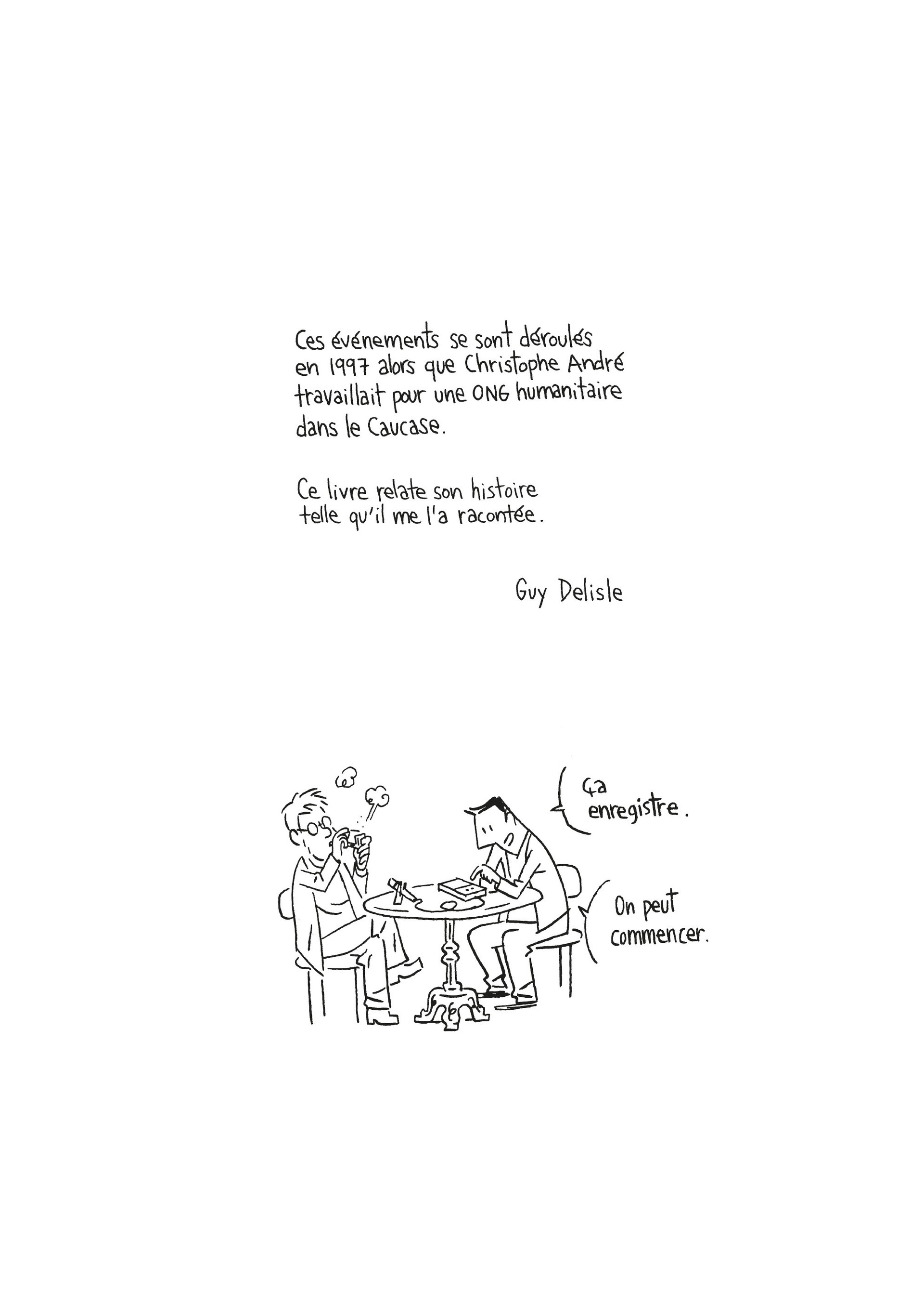 En 1997, alors qu'il est responsable d'une ONG médicale dans le Caucase, Christophe André a vu sa vie basculer du jour au lendemain après avoir été enlevé en pleine nuit et emmené, cagoule sur la tête, vers une destination inconnue. Guy Delisle l'a rencontré des années plus tard et a recueilli le récit de sa captivité – un enfer qui a duré 111 jours. Que peut-il se passer dans la tête d'un otage lorsque tout espoir de libération semble évanoui ? Un ouvrage déchirant, par l'auteur de "Pyongyang", de "Shenzhen", de "Chroniques birmanes" et de "Chroniques de Jérusalem".