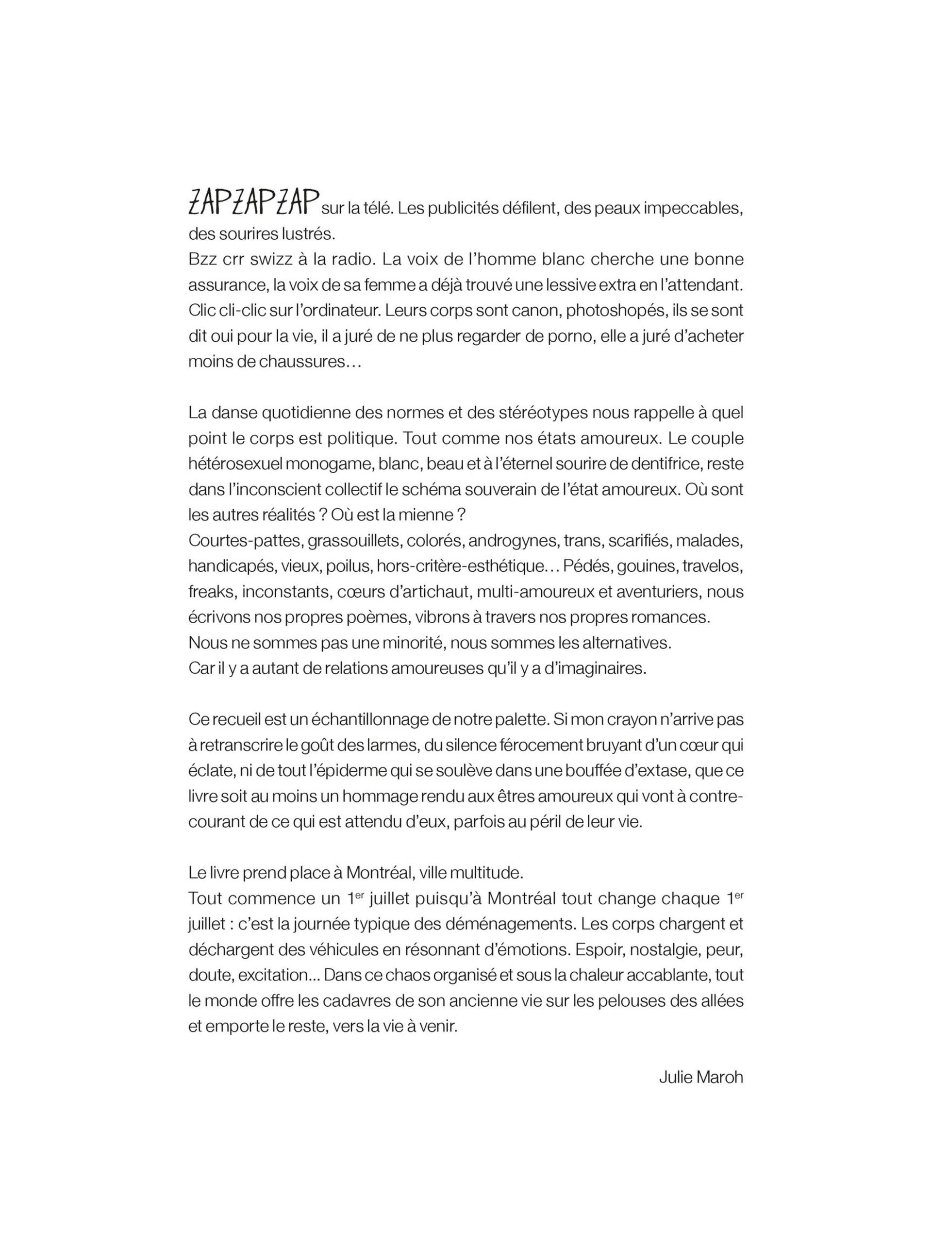 À Montréal, comme partout ailleurs, les couples se font et se défont. Les individus s’attirent, se repoussent, dans une perpétuelle valse des corps. Dans cette même ville s’entrecroisent des destins à la fois différents et semblables, liés par ce sentiment indescriptible : l’amour. Cette inconnue à laquelle même la science ne peut donner d’explication, ce concept qui nourrit l’imaginaire des artistes depuis toujours, est au cœur du nouveau roman graphique de Julie Maroh.