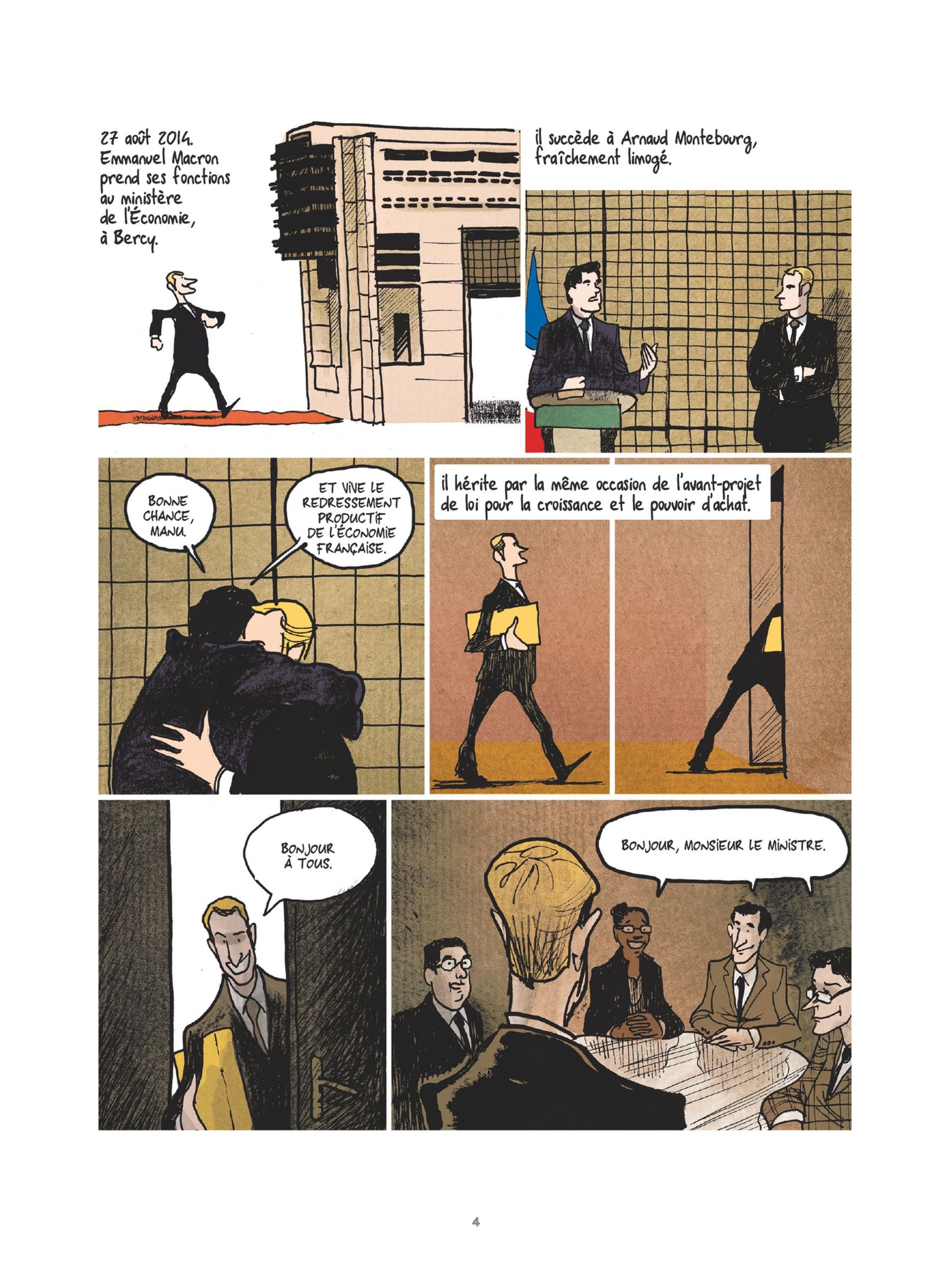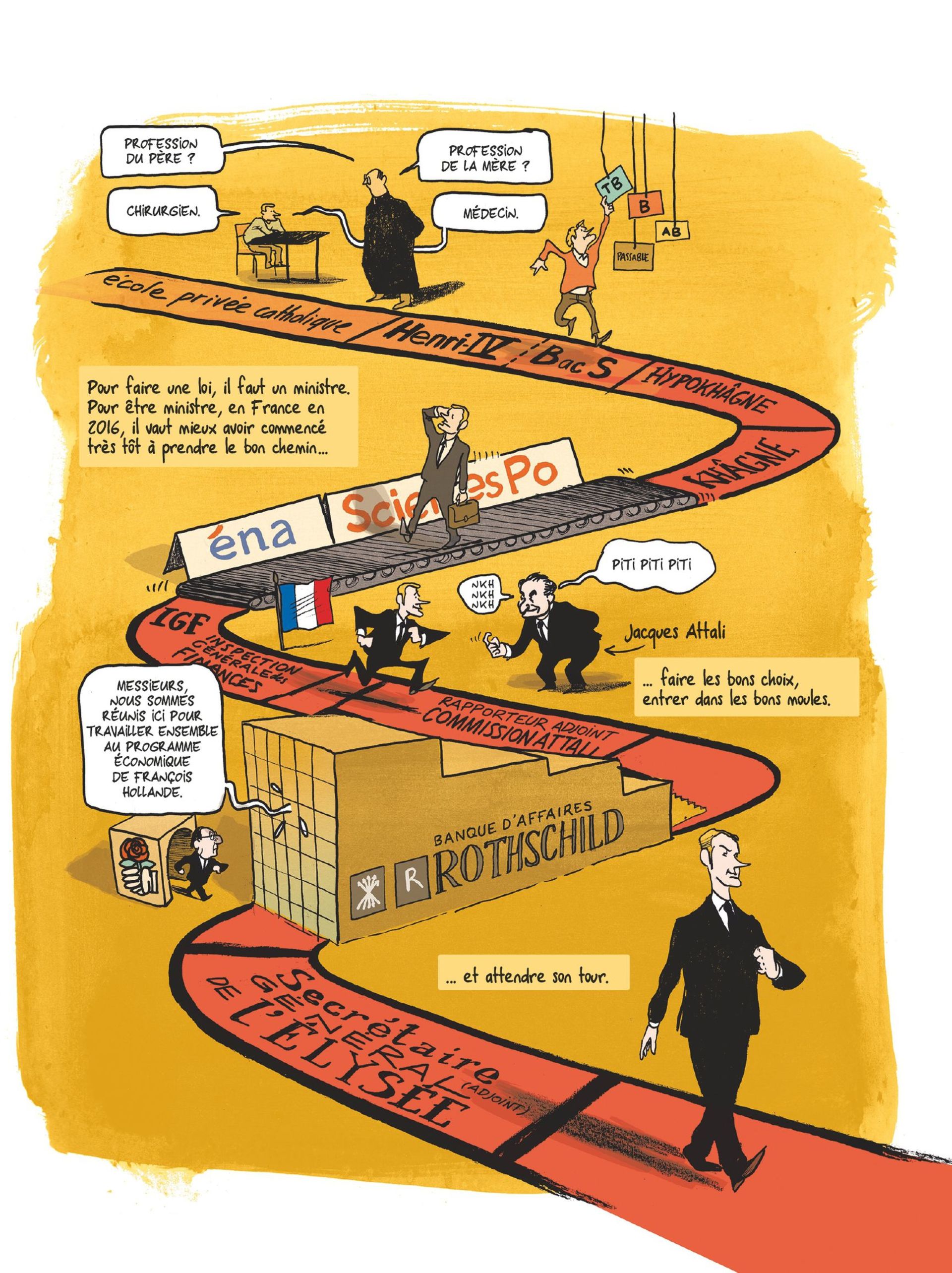 Pour faire une loi, il faut être ministre. Pour être ministre en France en 2016, il vaut mieux avoir commencé très tôt à prendre le bon chemin, faire les bons choix, entrer dans les bons moules... et attendre son tour. Tout ça, Emmanuel Macron l’a bien compris ! Après un parcours sans faute (lycée privé, Khâgne, Science Po, ENA...), le voici en 2014 ministre de l’économie. Succédant au turbulent Arnaud Montebourg, il hérite du projet de loi pour la croissance et le pouvoir d’achat qu’il a pour mission de faire adopter avec l’aide de ses conseillers. Réunions interministérielles, débats parlementaires, conférences de presse, manifestations, avis du Conseil d’État... avant d’être mise en application, la « loi Macron » va devoir passer à la moulinette des institutions françaises. Et les méandres du Parlement s'avèrent parfois hostiles et pleines de surprises, surtout pour qui a peu l’habitude de les pratiquer.