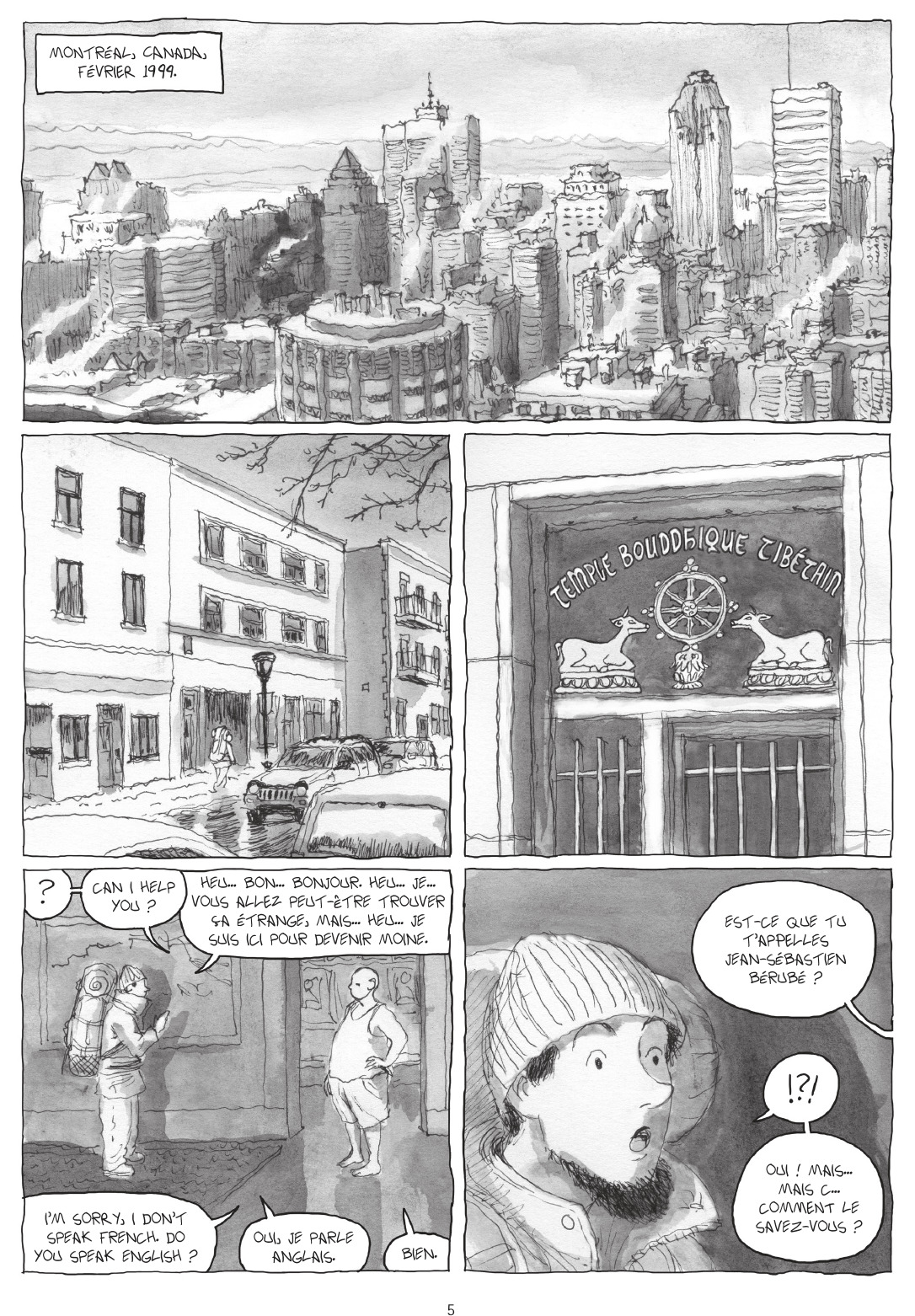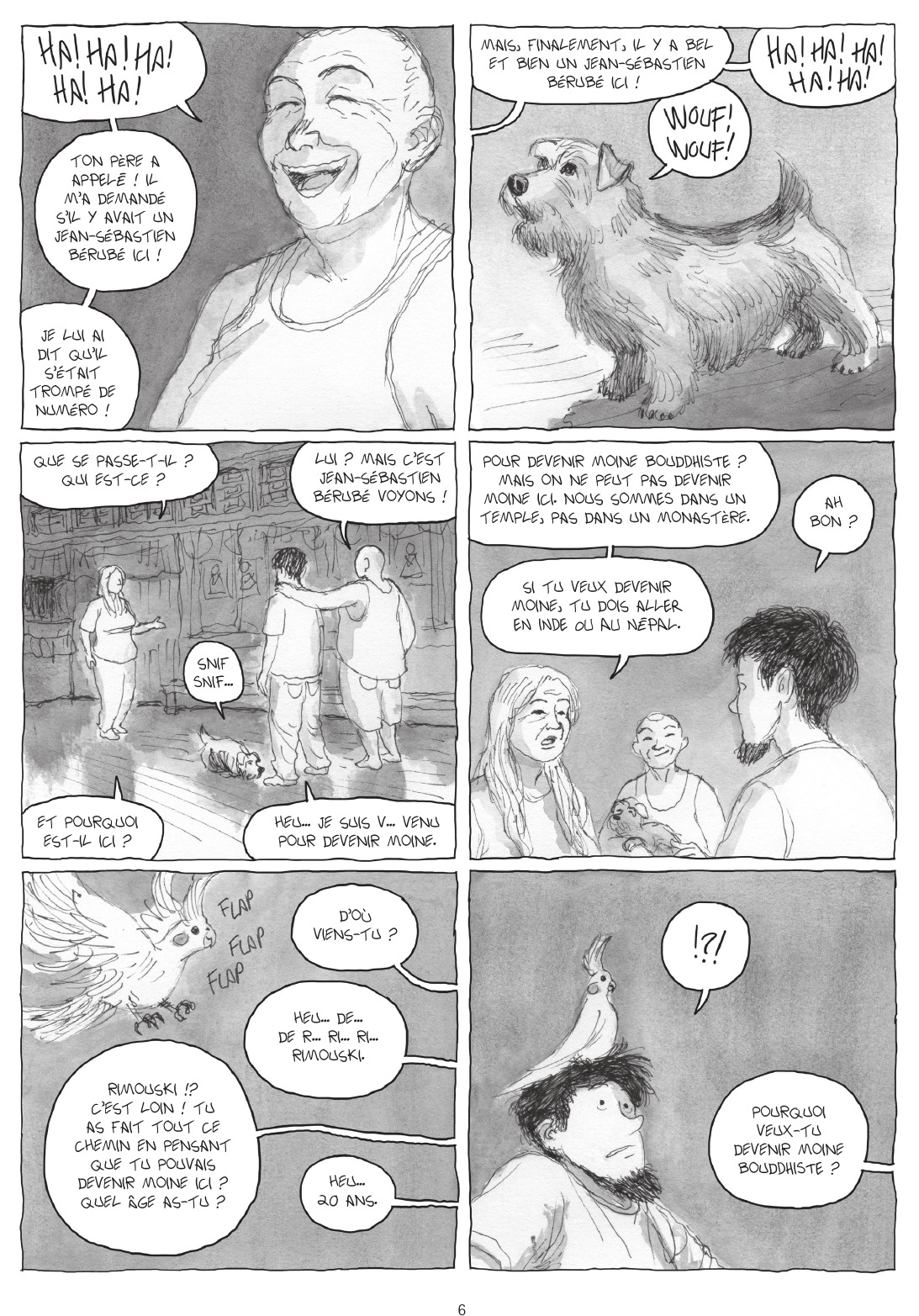 En débarquant à Katmandou en 2005, Jean-Sébastien Bérubé espérait bien devenir moine bouddhiste. Mais il ne tarde pas à découvrir que la réalité des moines tibétains est beaucoup plus complexe que ce qu’il avait lu ou vu. Dès son arrivée, il est hébergé par une famille de réfugiés politiques tibétains, aux prises avec des problèmes d’alcool, qui le présente au grand maître d’une secte bouddhiste controversée. Les moines de cette secte déclarent qu’il est probablement possédé par un mauvais esprit parce qu’il souffre d’un problème de bégaiement. Alors qu’il croyait que les enseignements de Bouddha étaient une science de l’esprit et une philosophie profonde, Jean-Sébastien ne rencontre que des pratiquants qui croient en la magie et aux superstitions, vénérant Bouddha comme s’il était un dieu avec des pouvoirs surnaturels. Son cheminement le mènera jusqu’ au Tibet pour visiter les lieux sacrés et voir de ses propres yeux les conséquences de l’occupation chinoise. La réalité de cette situation géopolitique ne sera encore pas celle qu’il croyait et sa vision des «bons tibétains et des méchants chinois» se trouve remise en question. Candide, il découvre un pays de mensonges, un « Disneyland du bouddhisme ». Et, le voyage qu’il attendait, s’il est manqué, lui permettra de faire un travail certainement plus riche encore de découvertes d’une réalité et un travail plus personnel dans son approche d’une spiritualité peut-être fantasmée. Bérubé révèle la face cachée du sommet du monde. Avec ironie, et sarcasme envers lui-même, il raconte ses tribulations en observateur sincère. Il ira au bout de son périple, jusqu’aux désillusions. Et reviendra, plus riche encore de ses découvertes.