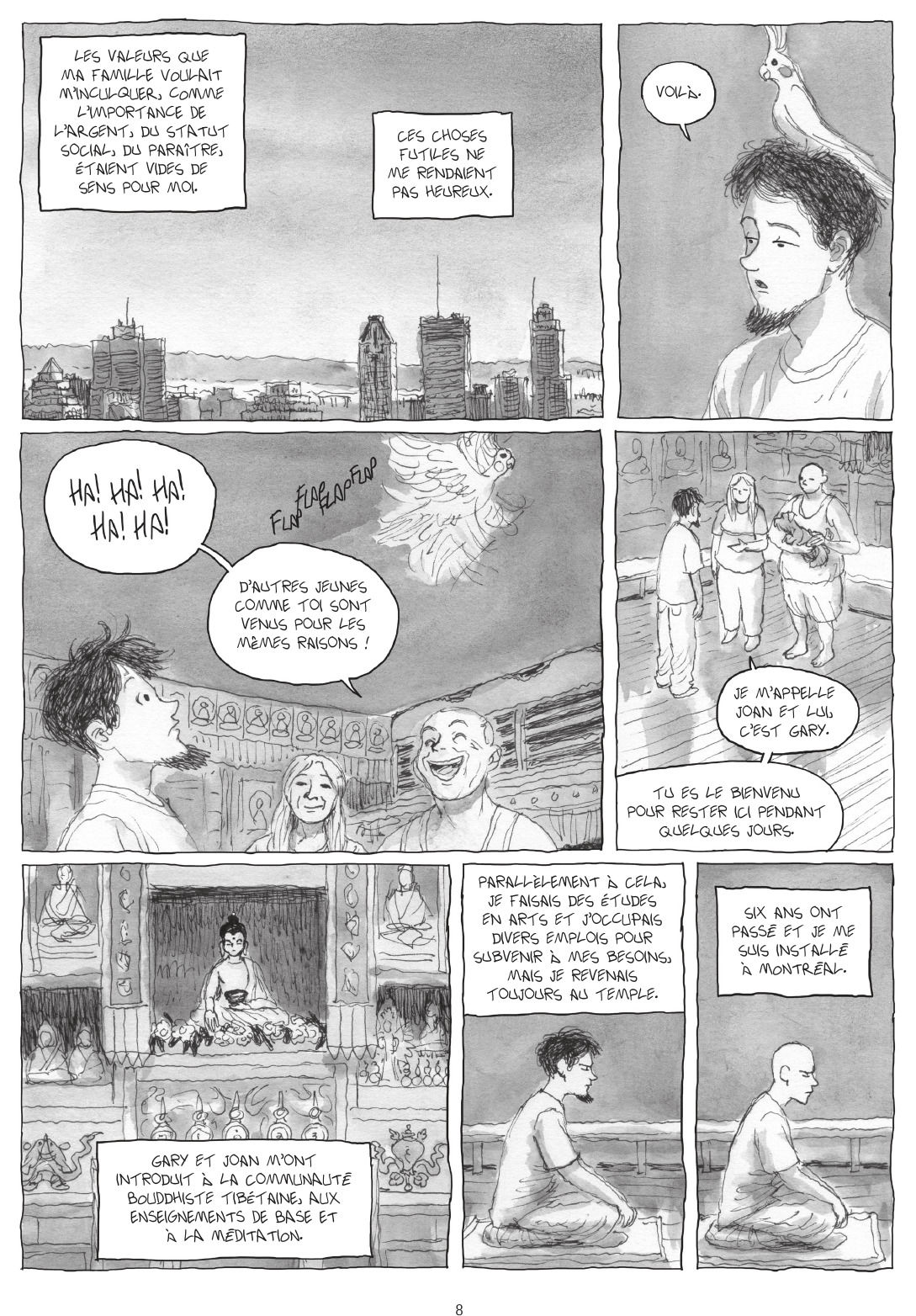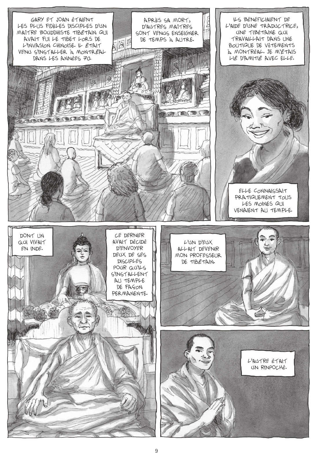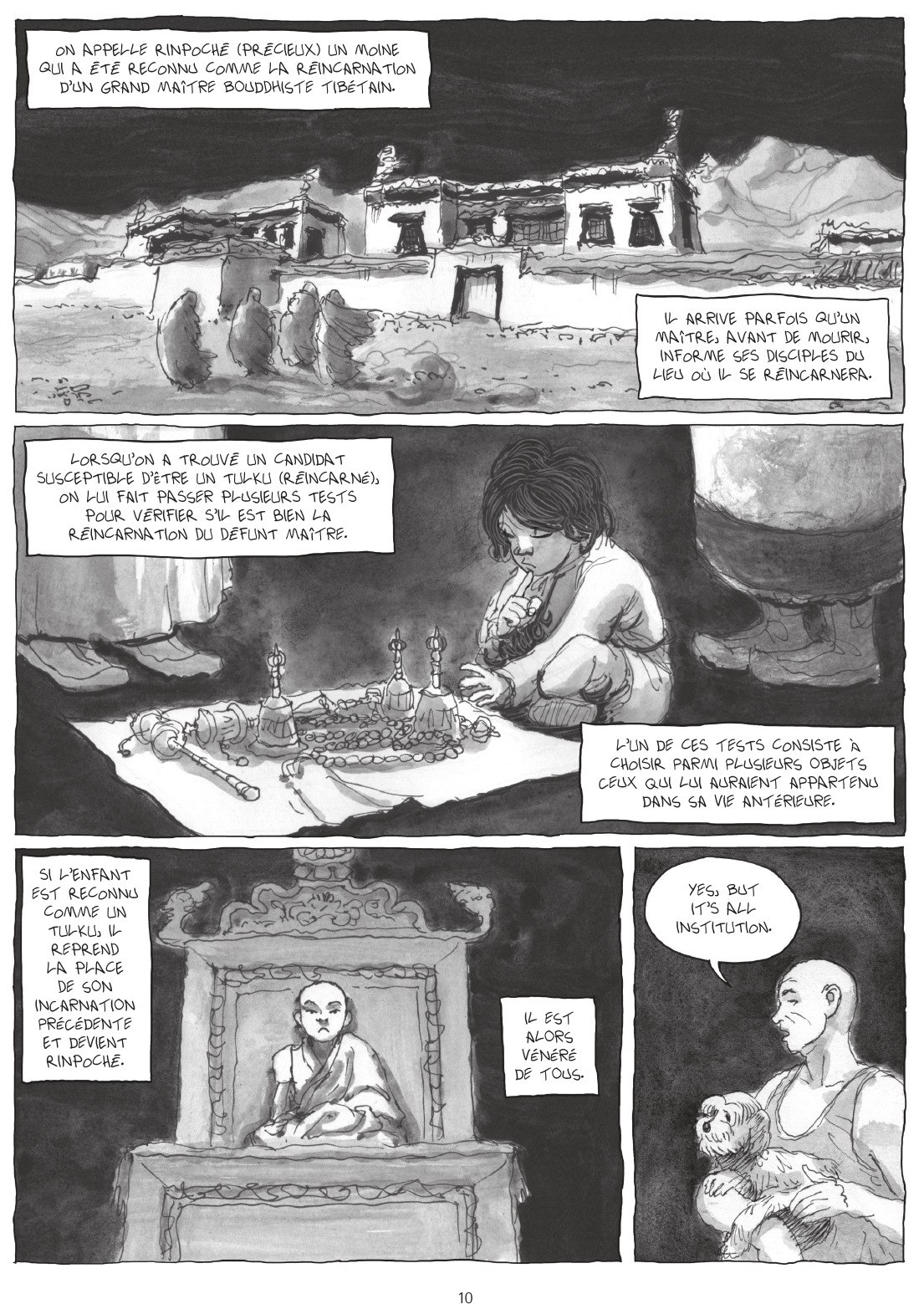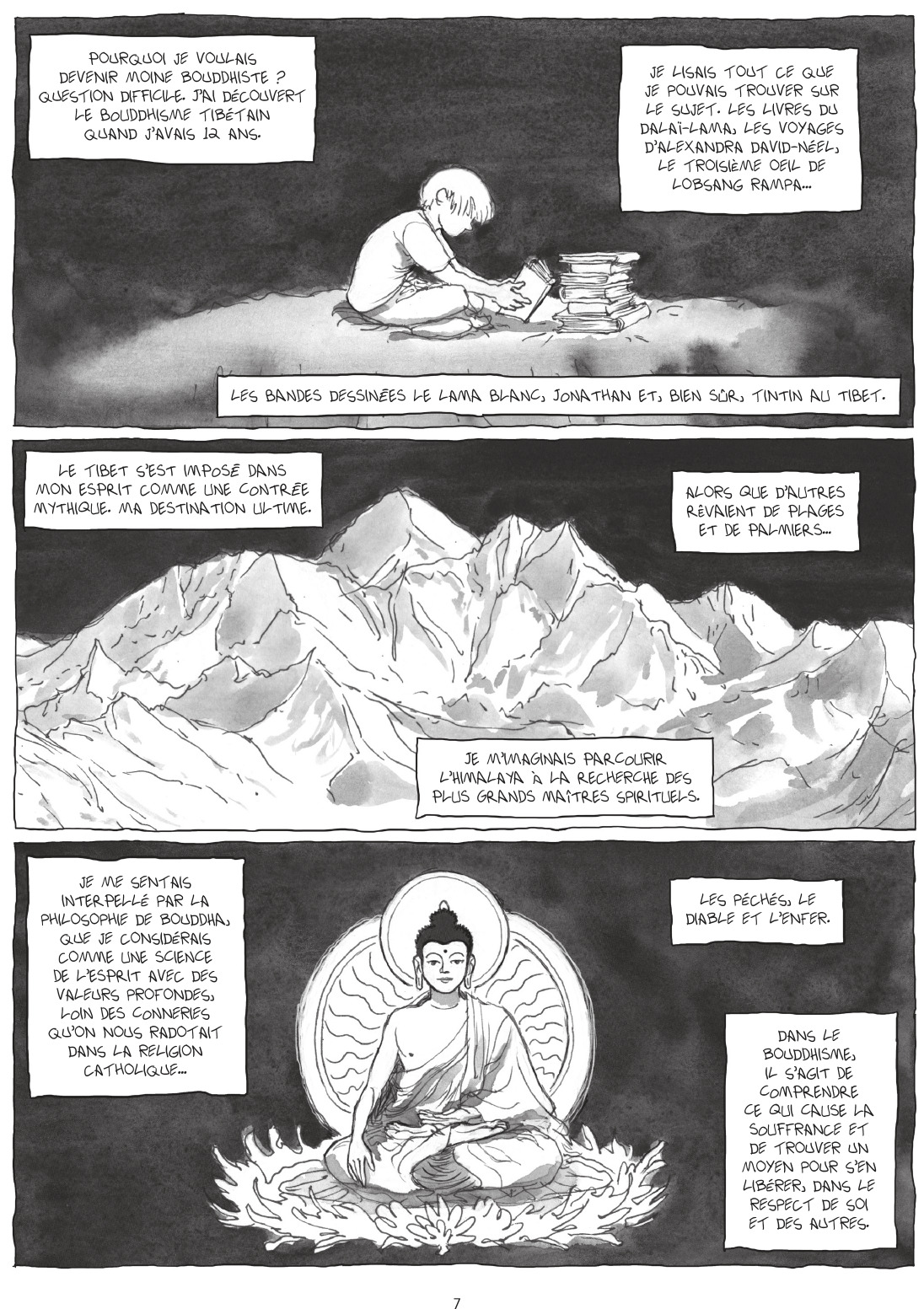 Avec cette BD on passe, comme son auteur, du trivial au magnifique ; On partage sa déception sur la réalité du Tibet, et on ne peut s’empêcher de ressentir, par l’intermédiaire d’un dessin pourtant simple, entre gris clair et gris foncé, la sérénité qui se dégage des paysages (comme ne page 157). Le zen vient des lieux naturels plus que de la pratique teinté de superstition du bouddhisme. C’est ...