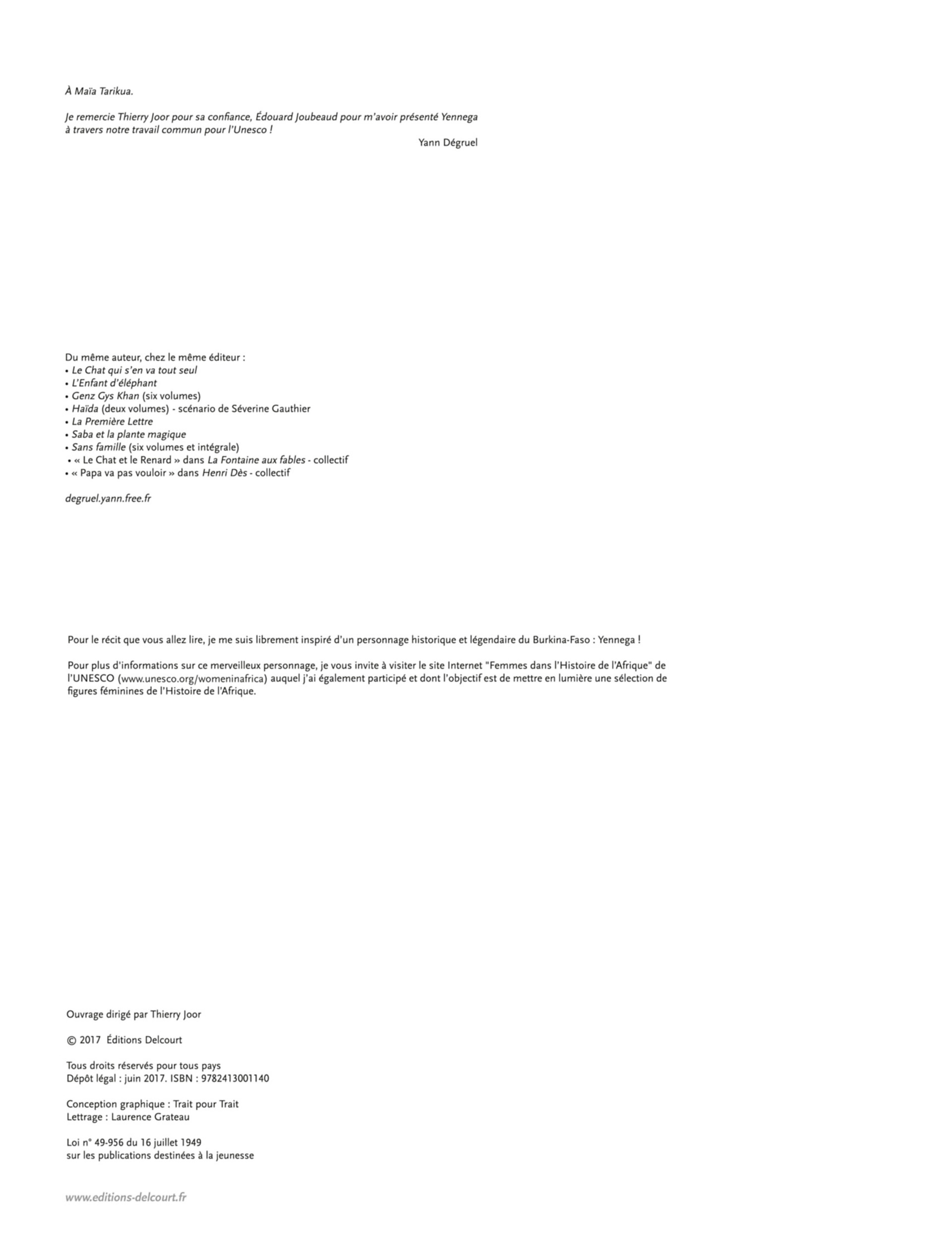 Un roi rêvait d’avoir un garçon. Il eut une fille qu’il appela Yennega. Malgré tout l’amour qu’un père peut avoir pour sa fille, le roi l’éleva comme un garçon. Yennega trouva rapidement sa place dans cet univers masculin, faisant souvent preuve de plus d’audace et de courage que la plupart des garçons. Adulte, elle intégra l’armée royale jusqu’au jour où elle désira se marier et avoir un enfant.