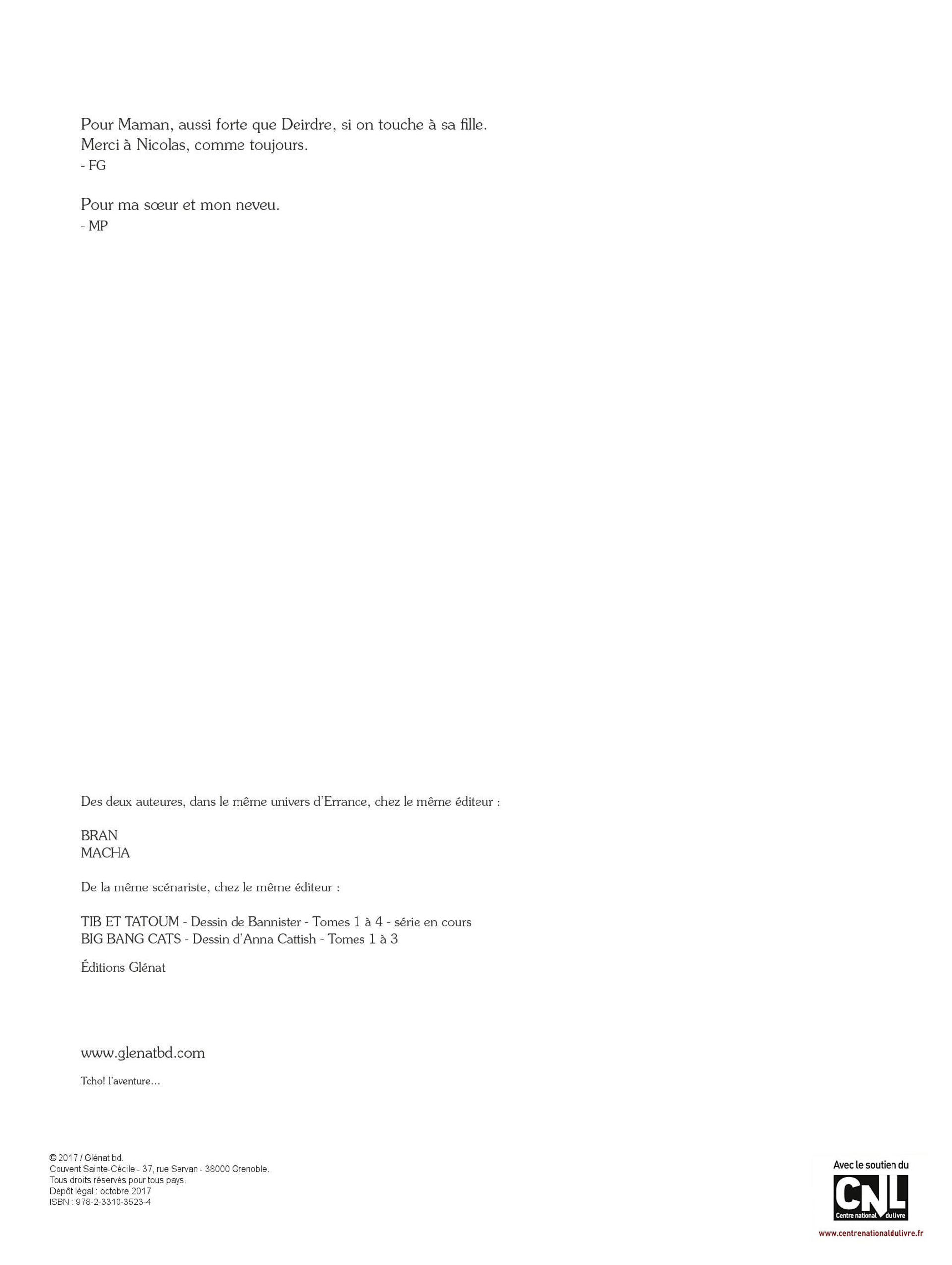 Sur l’île d’Errance, où Humains et Créatures vivent séparés depuis toujours, Sarah est la fille du roi des hommes. On la dit sans cœur. Elle, estime mettre de côté ses sentiments personnels pour aider son père et administrer le royaume de la façon la plus juste et la plus impartiale qui soit. Son destin bascule le jour où elle apprend que Bran, son frère ainé et héritier du trône, meurt dans un accident de chasse au cœur de la Forêt Interdite. Mais bien que son autre frère refuse de devenir le prochain roi et qu’elle possède toutes les qualités requises pour diriger, Sarah fait face aux poids des traditions : jamais une femme n’a hérité du trône. Sera-t-elle la première à faire mentir l’Histoire ? Suite indirecte à Bran et Macha, cet album propose une nouvelle relecture des contes et légendes celtiques interprétée par des personnages non archétypaux et très humains... bien que magiques.