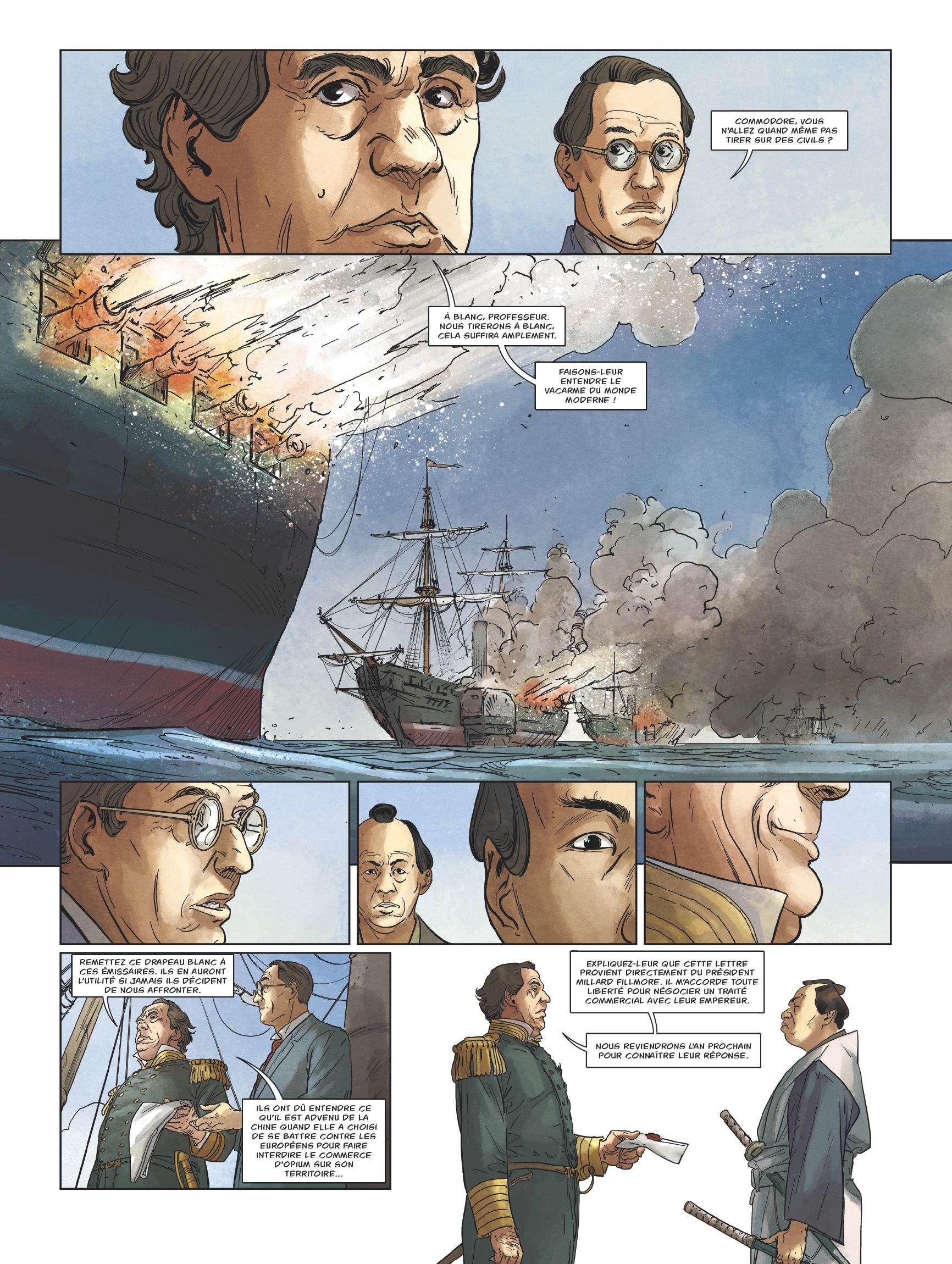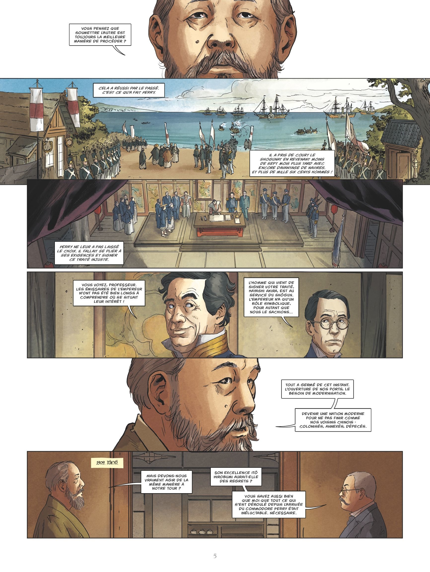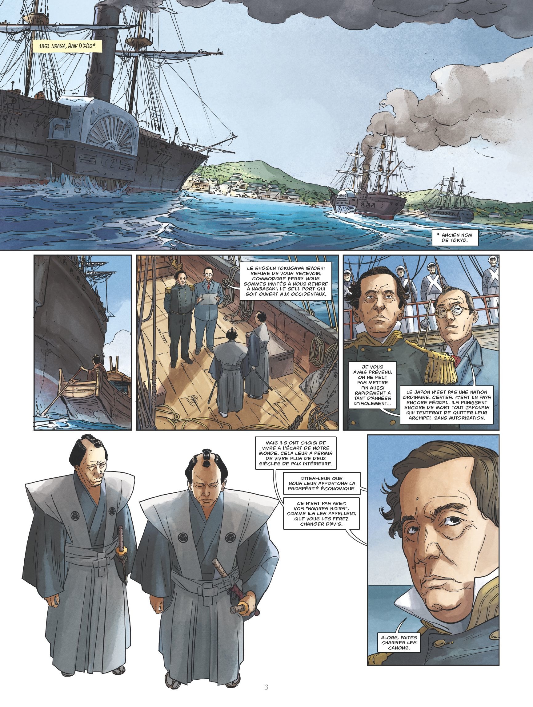 1853, baie d’Edo, future Tokyo. Une armada de navires européens attend au large des côtes japonaises pour entamer les négociations avec ce pays qui vit coupé du monde. Mais il n’est pas facile de remettre en cause un isolationnisme cultivé depuis plus de deux siècles par la dynastie des Shoguns Tokugawa, laissant à l’empereur un rôle religieux et symbolique. Quinze ans plus tard, une période de réformes radicales va se cristalliser autour du nouvel empereur Mutsuhito, dit Meiji, le Japon s’affranchissant alors du système féodal et s’ouvrant au reste du monde à marche forcée.