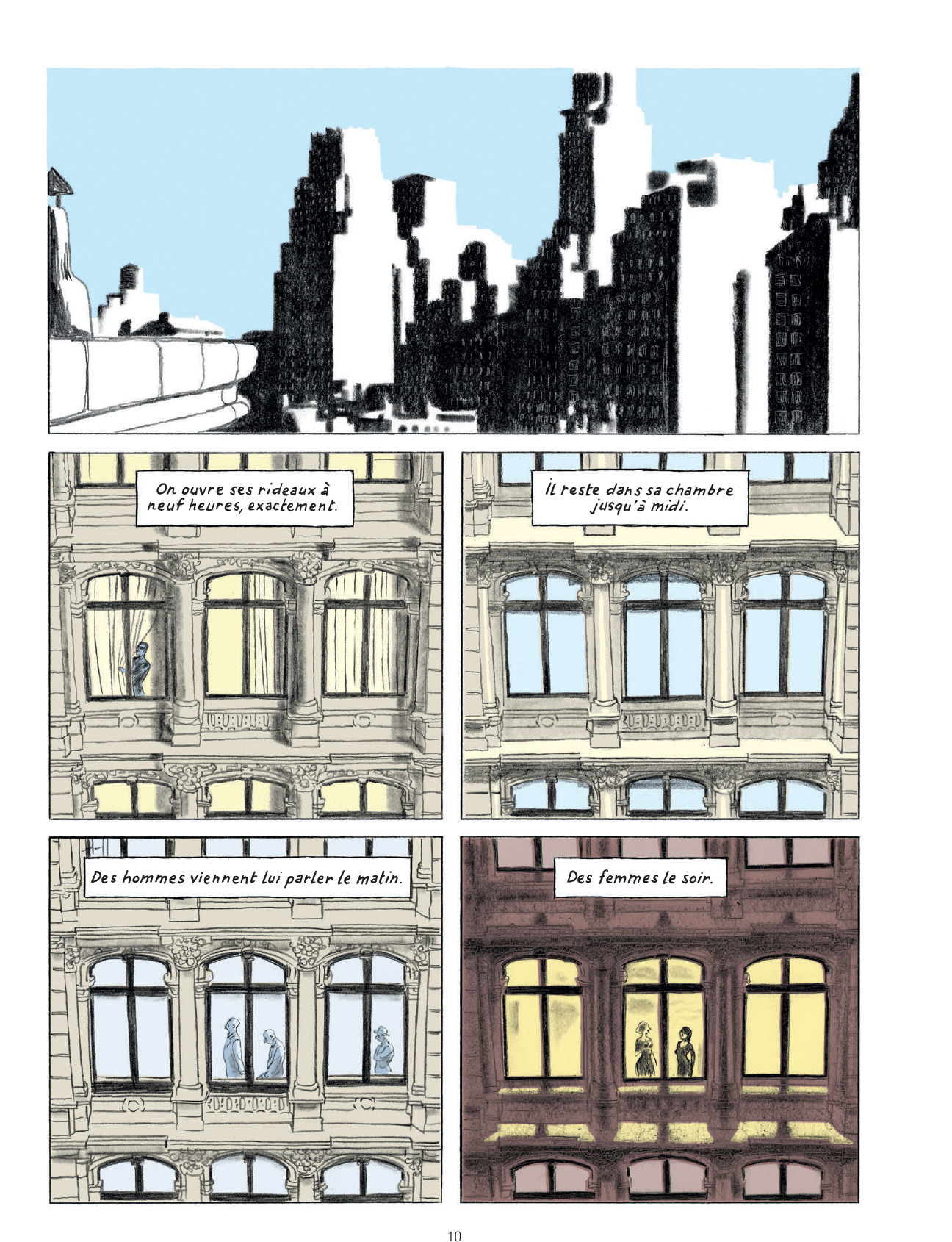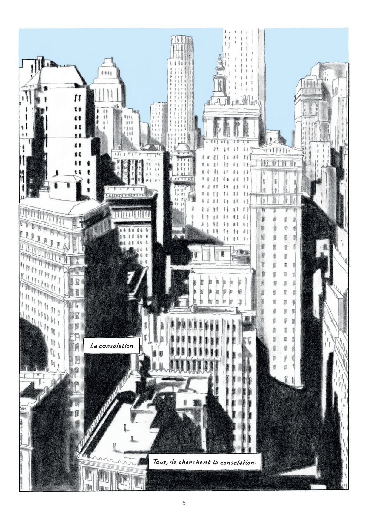 Vue de grattes ciel, New York, années 50. Une homme tapi, seul semble-t-il ; Une femme guette. Les abeilles font leur miel, douceur et danger mêlés. Un dessin ligne claire que le fusain floute un peu, juste ce qu’il faut ; Oublier la rigueur pour retrouver l’humain, ses errances et ses failles. Suivre un homme, un bouquet de fleurs à la main, comme une abeille laborieuse ; La femme se souvien...