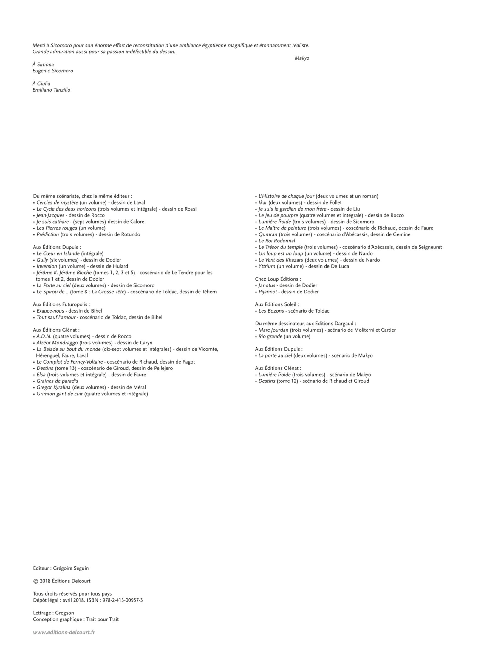 Cette superbe histoire en trois volumes a maturé vingt ans dans l’esprit du scénariste Makyo, passionné par l’Egypte. Il y voit le creuset de toutes les sciences et de toutes les philosophies, et le pharaon Akhénaton l’intéresse particulièrement. L’histoire de ce pharaon est en effet très particulière puisque, rompant avec la religion polythéiste de son temps, lié au culte d’Amon, il est à l’origi...