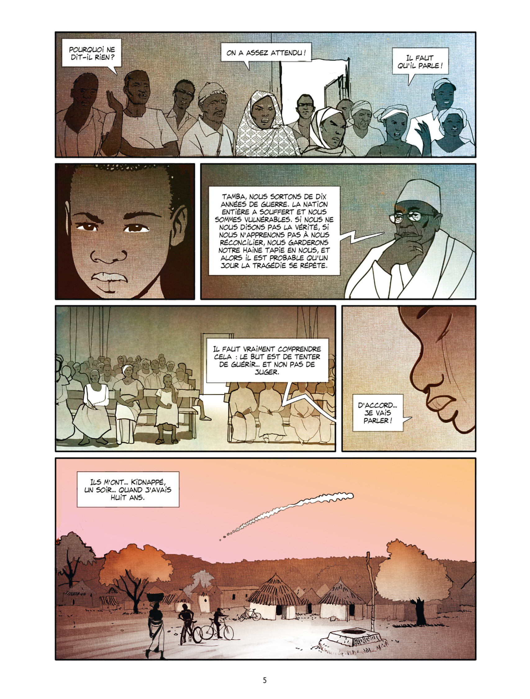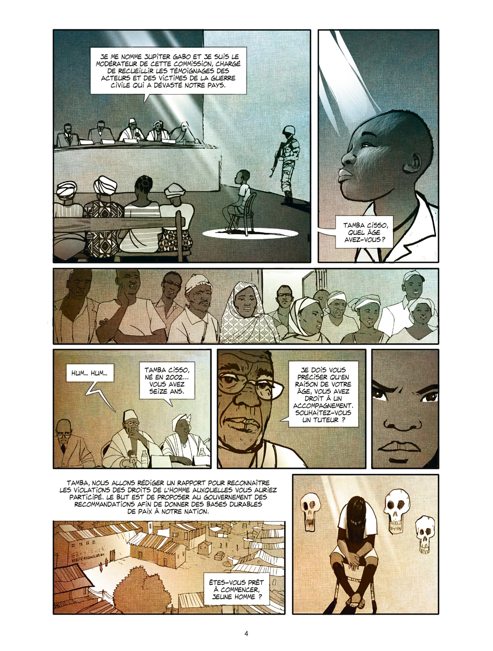 Dans un village d’Afrique, les gens se rassemblent dans un bâtiment pour une audience dirigée par la Commission de Vérité et Réconciliation. Au centre, le jeune Tamba, 16 ans, est invité à témoigner de sa participation aux violations des Droits de l’homme dans ce pays qui se remet difficilement de la guerre et qui cherche à comprendre et à pardonner pour se reconstruire. Tamba : « J’avais huit ans lorsqu’on m’a kidnappé… »