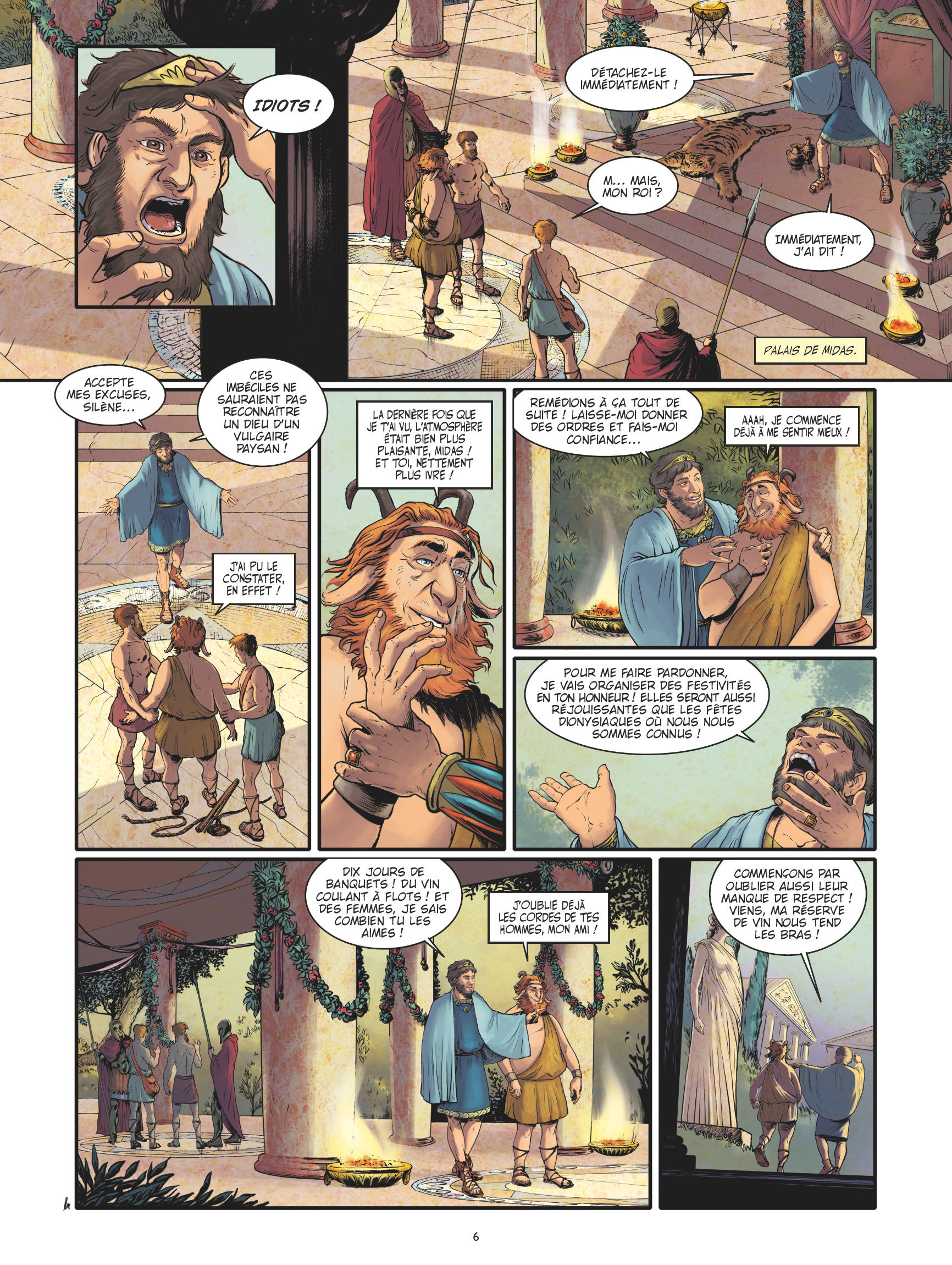 Royaume de Phrygie. Perdu dans la forêt, un satyre est mis aux fers à cause de son apparence hideuse. Il est cependant très vite libéré par le roi Midas qui reconnait en lui Silène, le père adoptif de Dionysos. En remerciement pour son geste, le dieu de la vigne et des excès octroie alors au sauveur de son compagnon le vœu de son choix. Naïf et avide de richesses, Midas choisit d’obtenir le toucher d’or, sans imaginer les effets pervers d’un tel pouvoir... En effet, comment boire ou se nourrir si tout ce que l’on touche se transforme instantanément en or ?