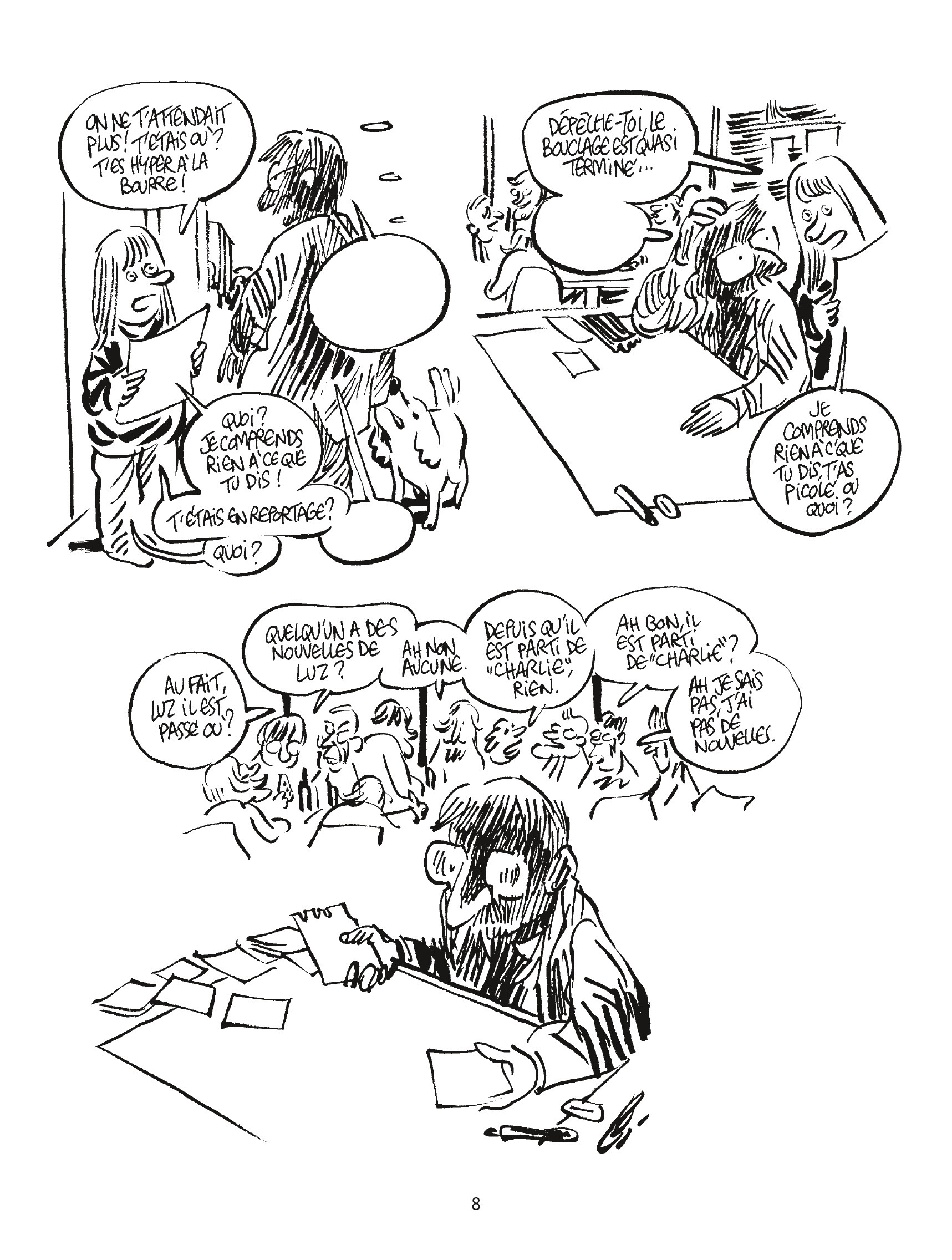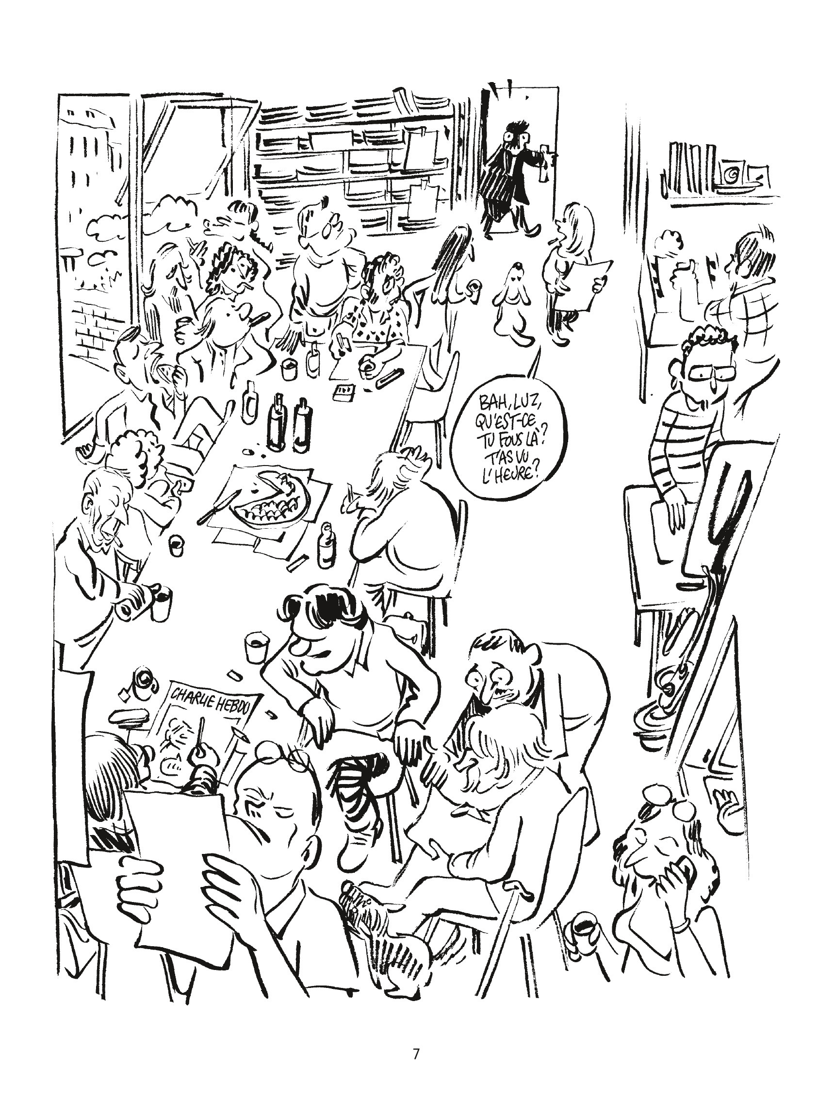 De 1992 à 2015, Luz a dessiné toutes les semaines pour Charlie Hebdo. Jeune provincial puceau arrivé à Paris,il rencontre Cabu qui le prend sous son aile et l’entraîne à La Grosse Bertha, qui devient Charlie Hebdo. Avec le temps il devient l’un des piliers du journal. Dans un long rêve, il égrène ses souvenirs : ses amis, Charb, Tignous, Gébé, Catherine Meurisse…, le premier reportage en banlieue, aux USA, la tournée en Bosnie en guerre avec le chanteur Renaud, son infiltration au RPR, les manifs… Et la vie de bureau, les bouclages, les unes, Johnny. Enfin, il y a surtout la présence de Cabu, le mentor, jamais avare de conseils, qui essaie par exemple de lui apprendre à dessiner discrètement dans sa poche.