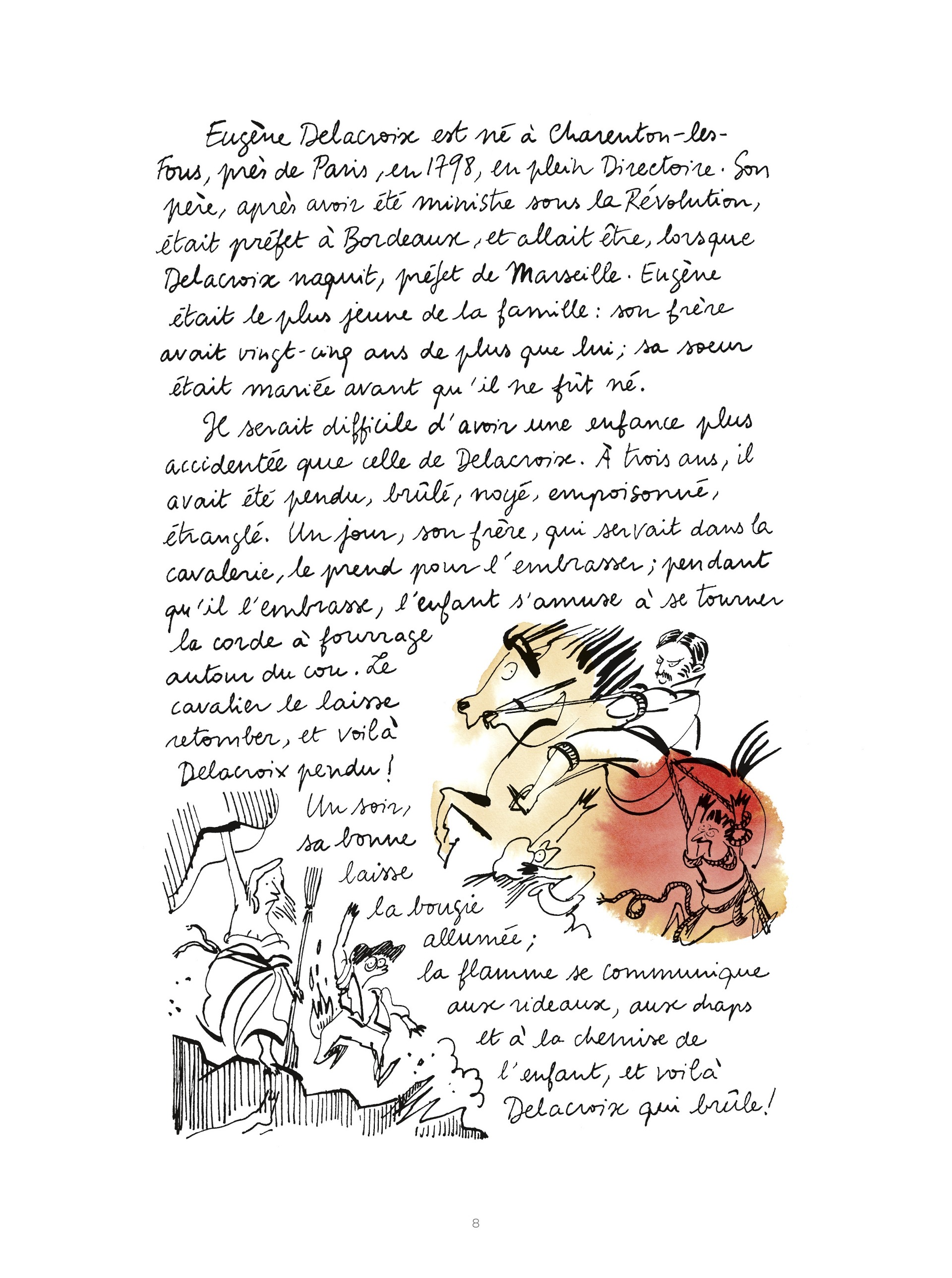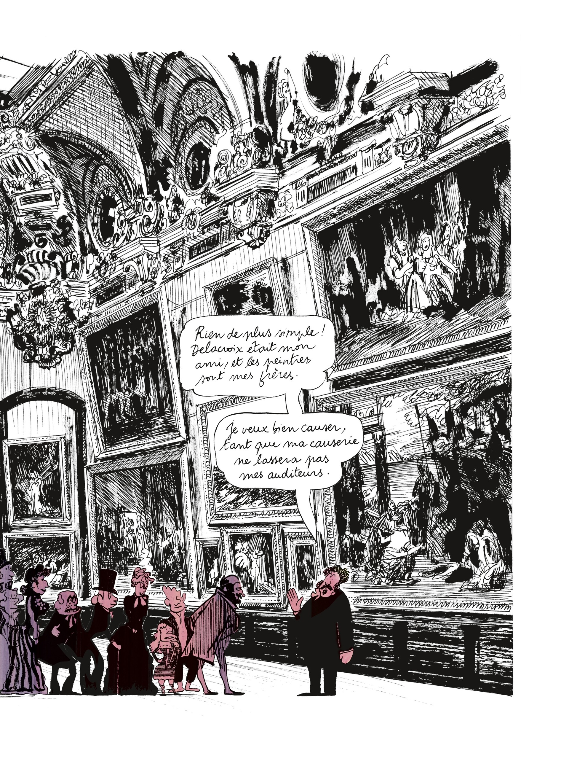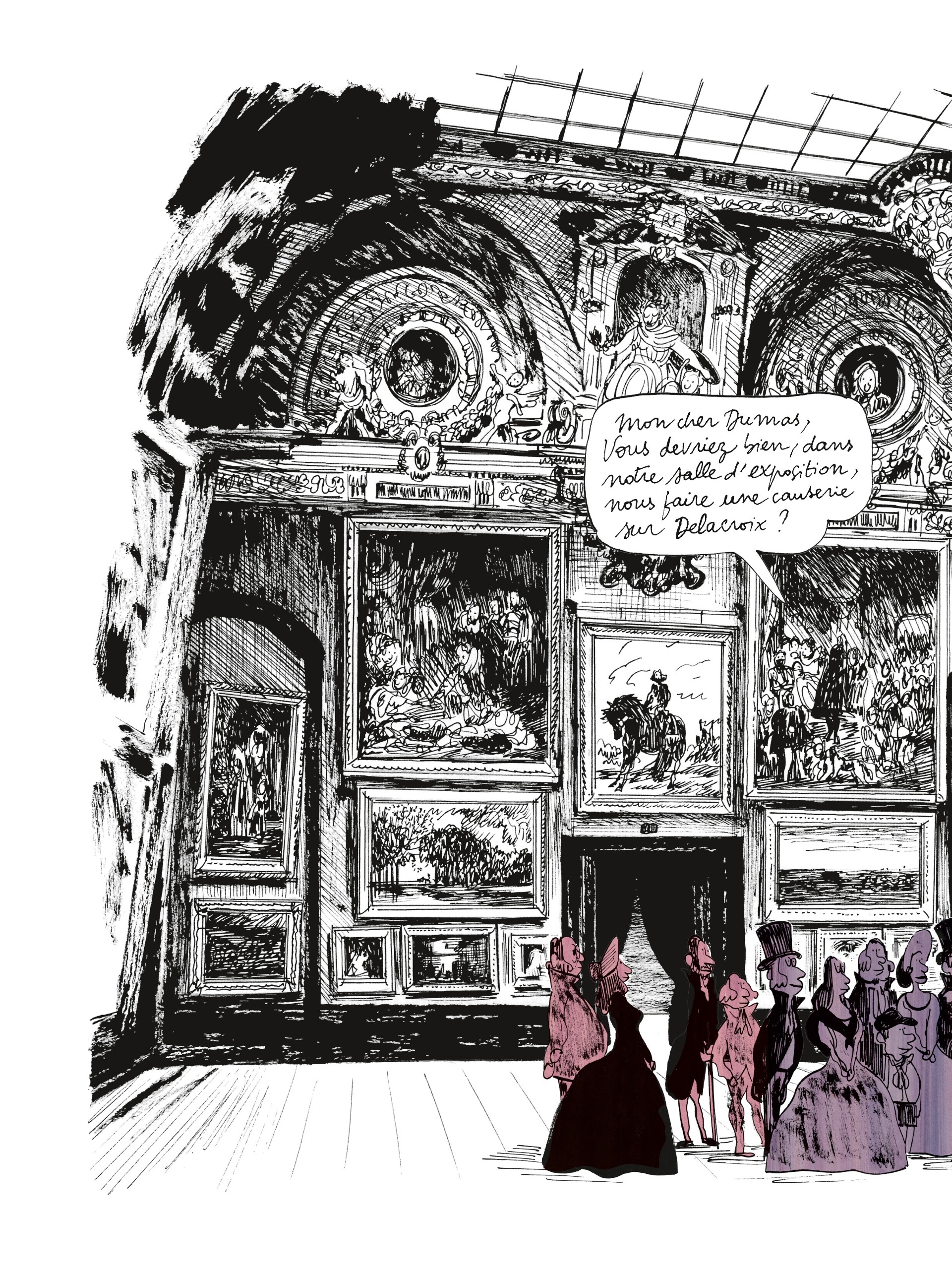 Alexandre Dumas, qui se disait « frère des peintres », raconte les souvenirs qui ont marqué son amitié avec Eugène Delacroix. D'une anecdote à l'autre, les tempéraments de l'immense artiste et du grand romancier se révèlent, un portrait de leur époque se dresse, les combats au nom de l'art surgissent. Catherine Meurisse s'invite dans cet hommage et en offre une adaptation toute personnelle. Le but espéré de cette causerie ? Que la fougue de Delacroix et la verve de Dumas soient une fête pour l'oeil et pour l'esprit !