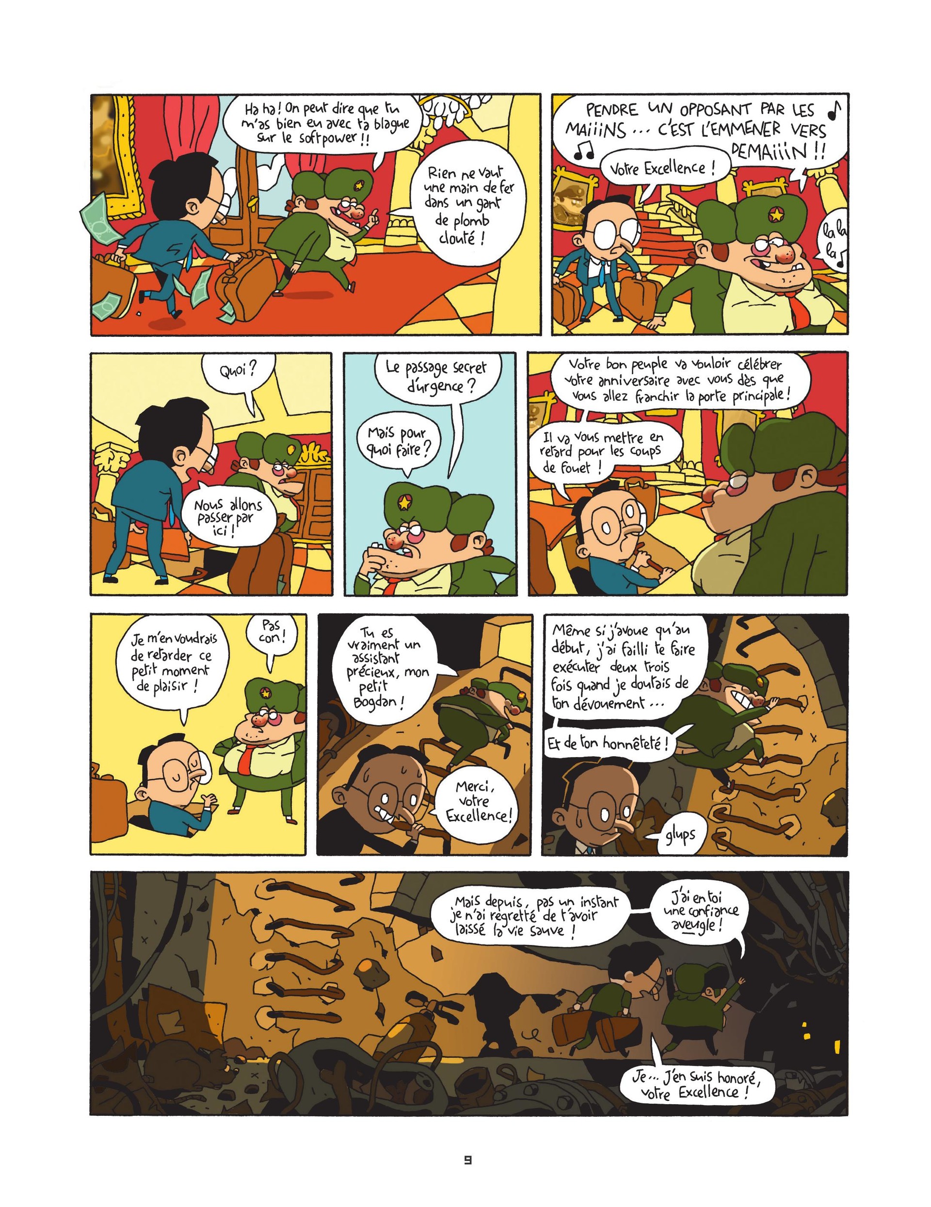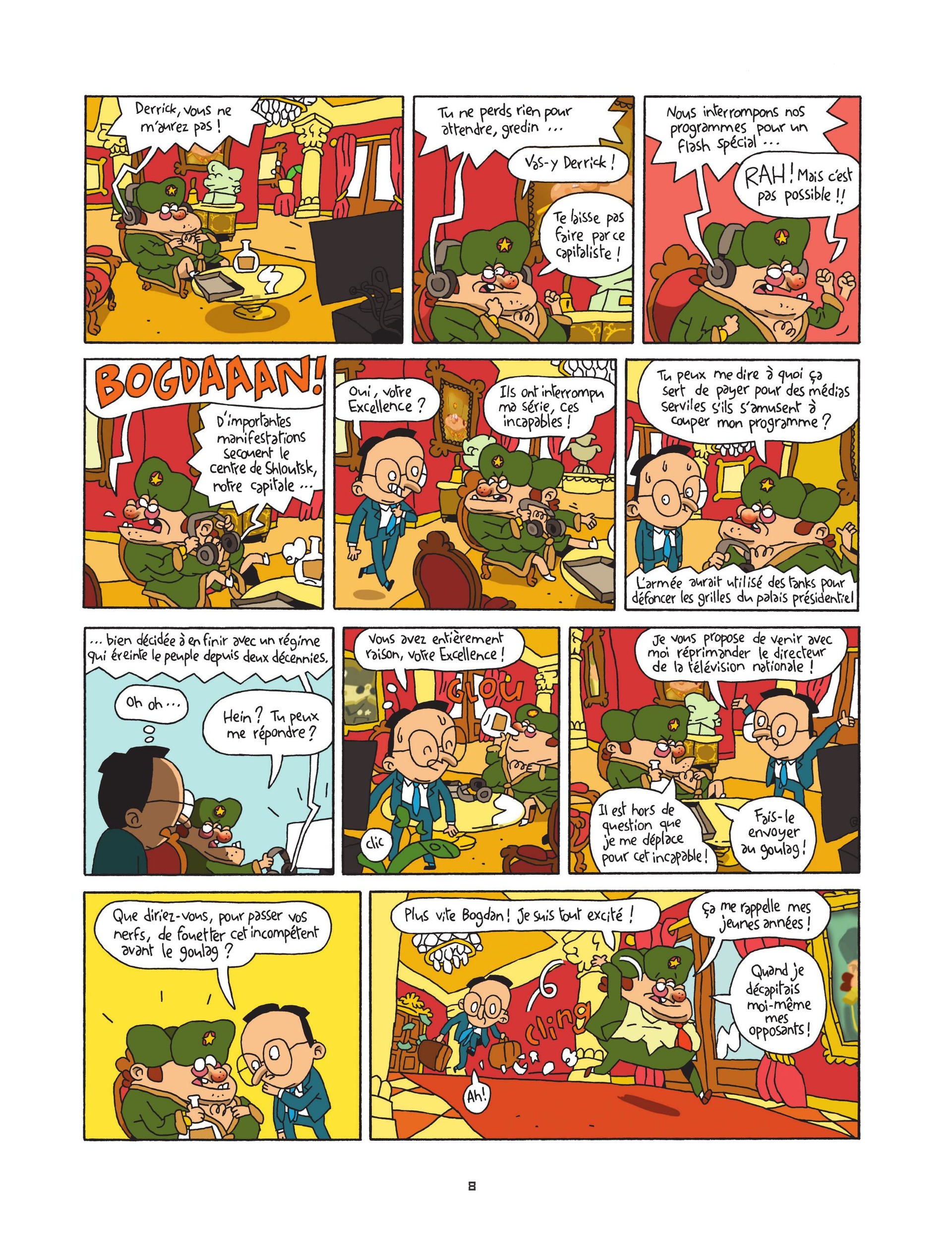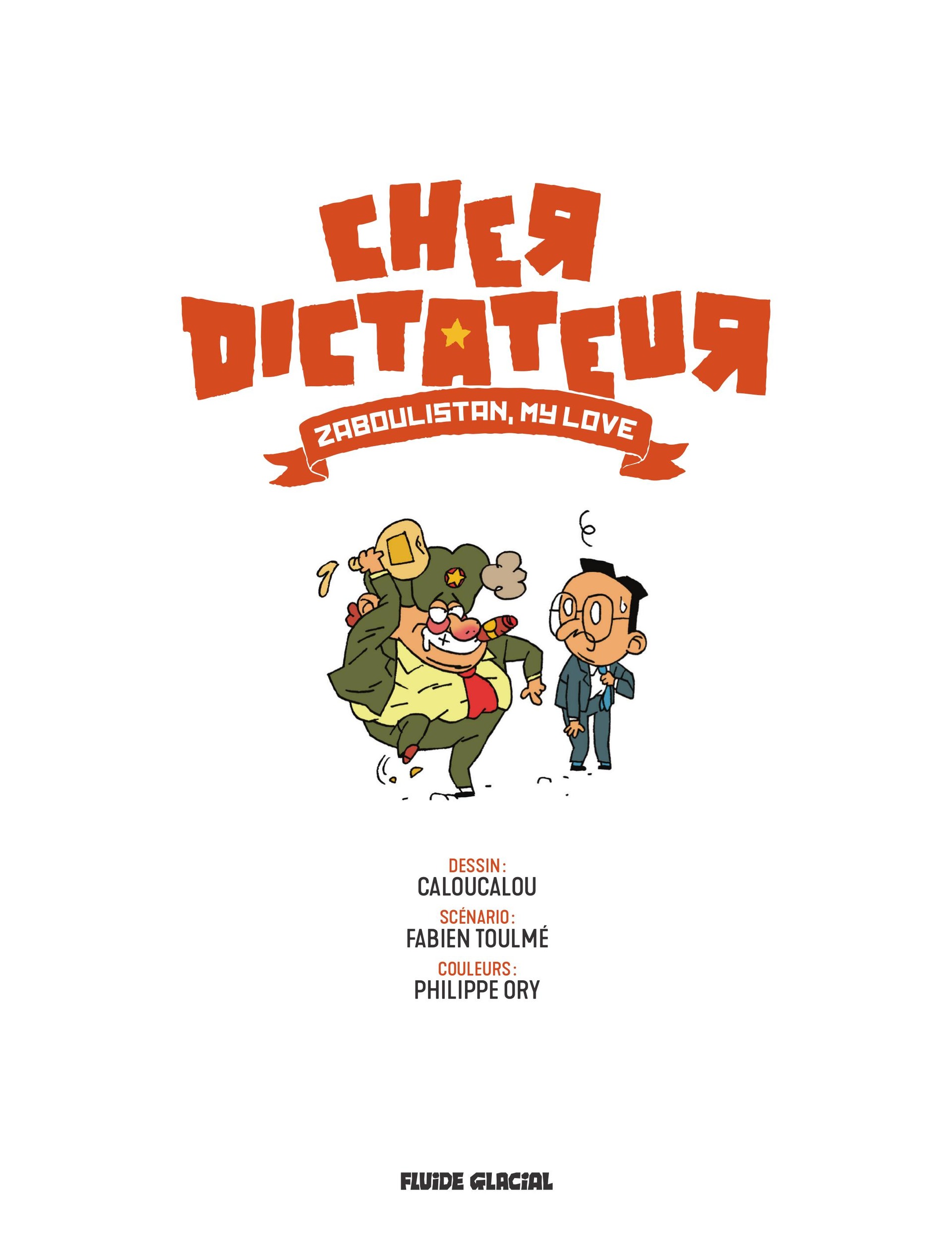 Au Zaboulistan, règne un dictateur intraitable, amateur de la série Derrick, de Grotch, le fameux alcool d’ail et de tortures et morts diverses pour éradiquer toute contestation ; Et pour le fun aussi.Las, un matin, un matin de rien, voilà le bon peuple, servilement oppressé jusqu’alors, qui veut faire la révolution et tuer le tyran.Heureusement le fidèle secrétaire du despote arrive à l’évacuer v...