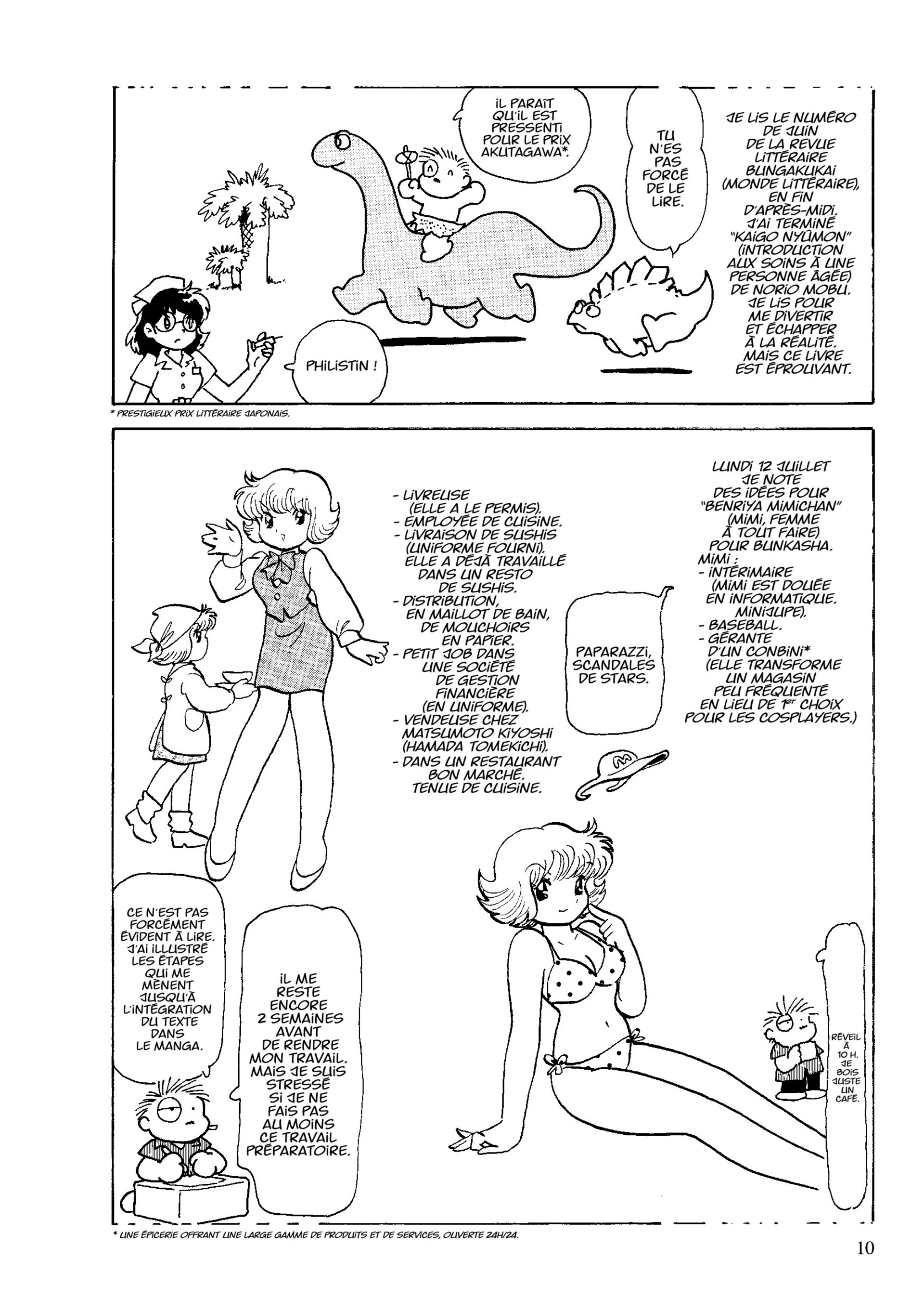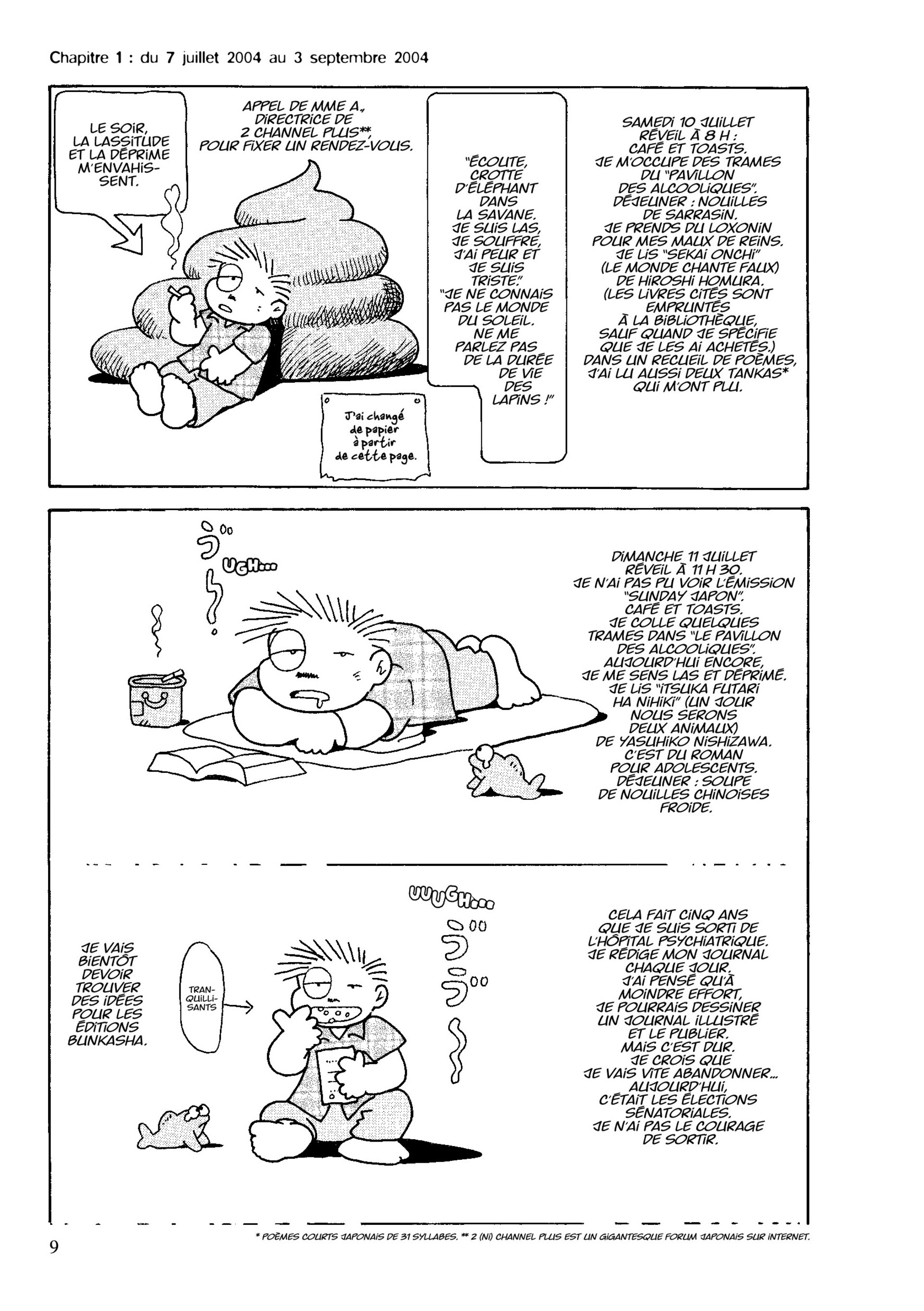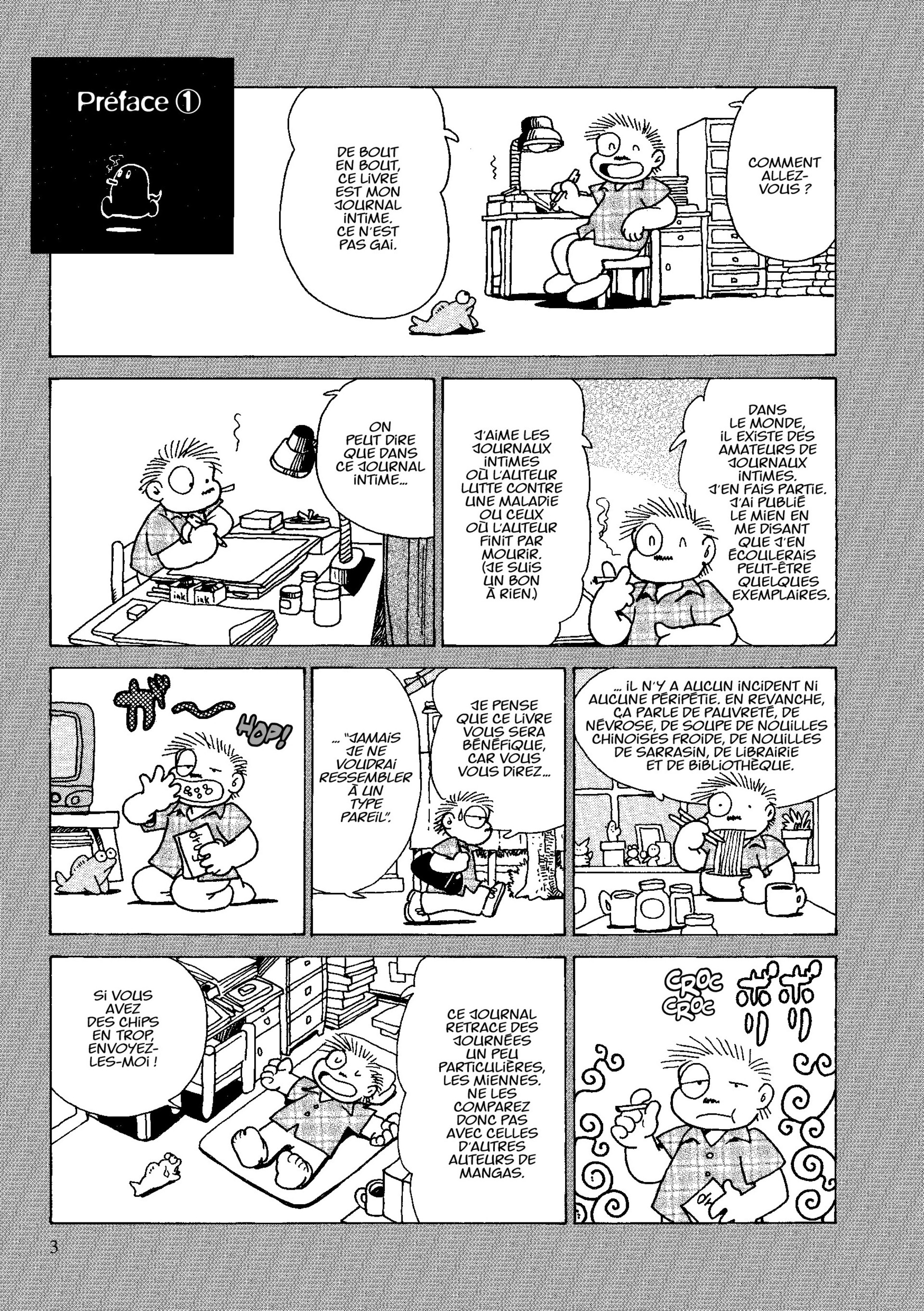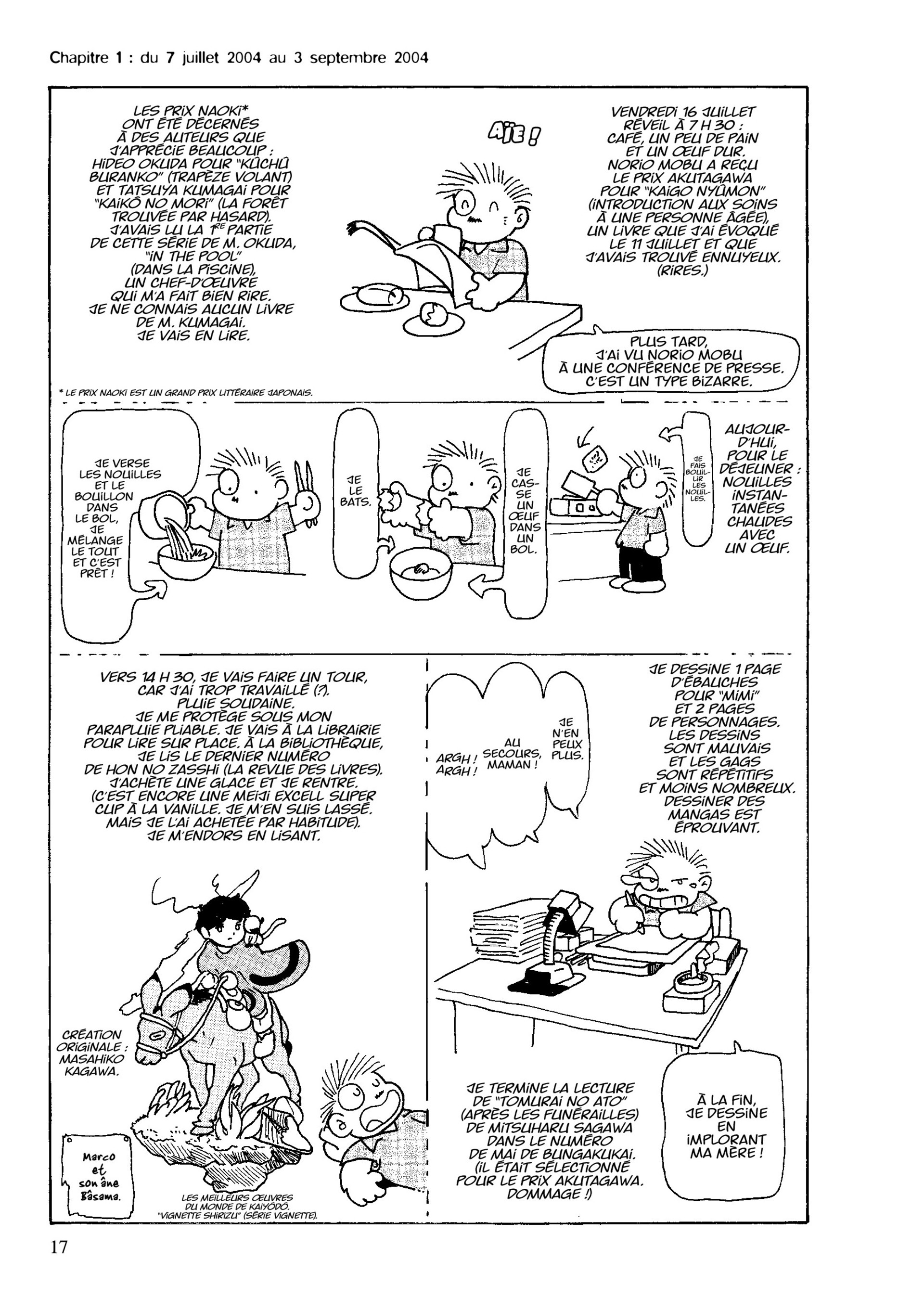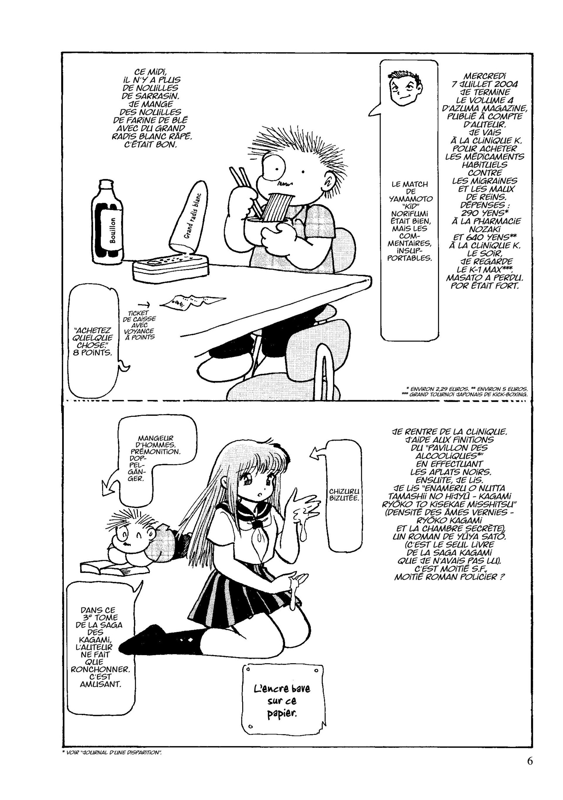 Six années se sont écoulées depuis la sortie d’Hideo Azuma du pavillon des alcooliques dont les aventures nous sont relatées dans Journal d’une disparition. Nous suivons donc l’auteur dans sa vie quotidienne, rythmée par ses lectures aussi diverses que nombreuses ainsi que par les différents projets sur lesquels le mangaka planche. Ceux-ci, recueillant plus ou moins de succès auprès des éditeurs ou du public, nous font cependant découvrir l’intimité d’un mangaka.