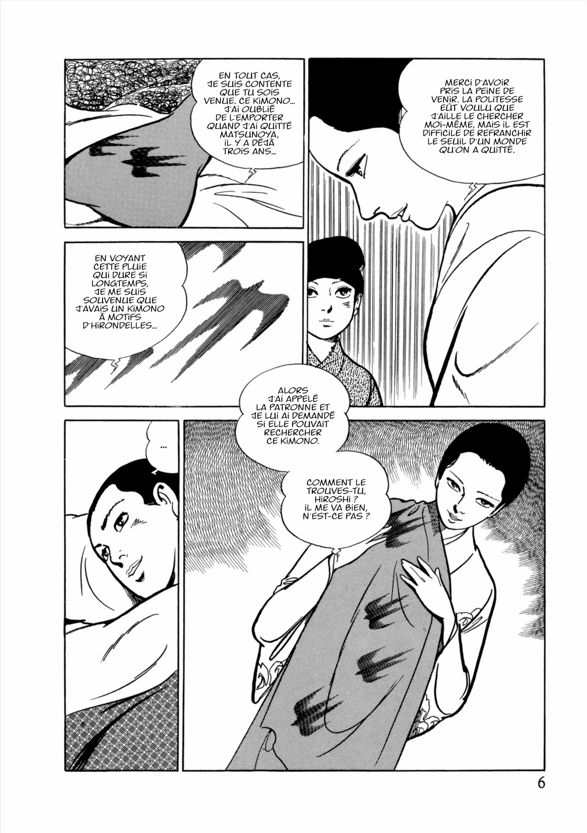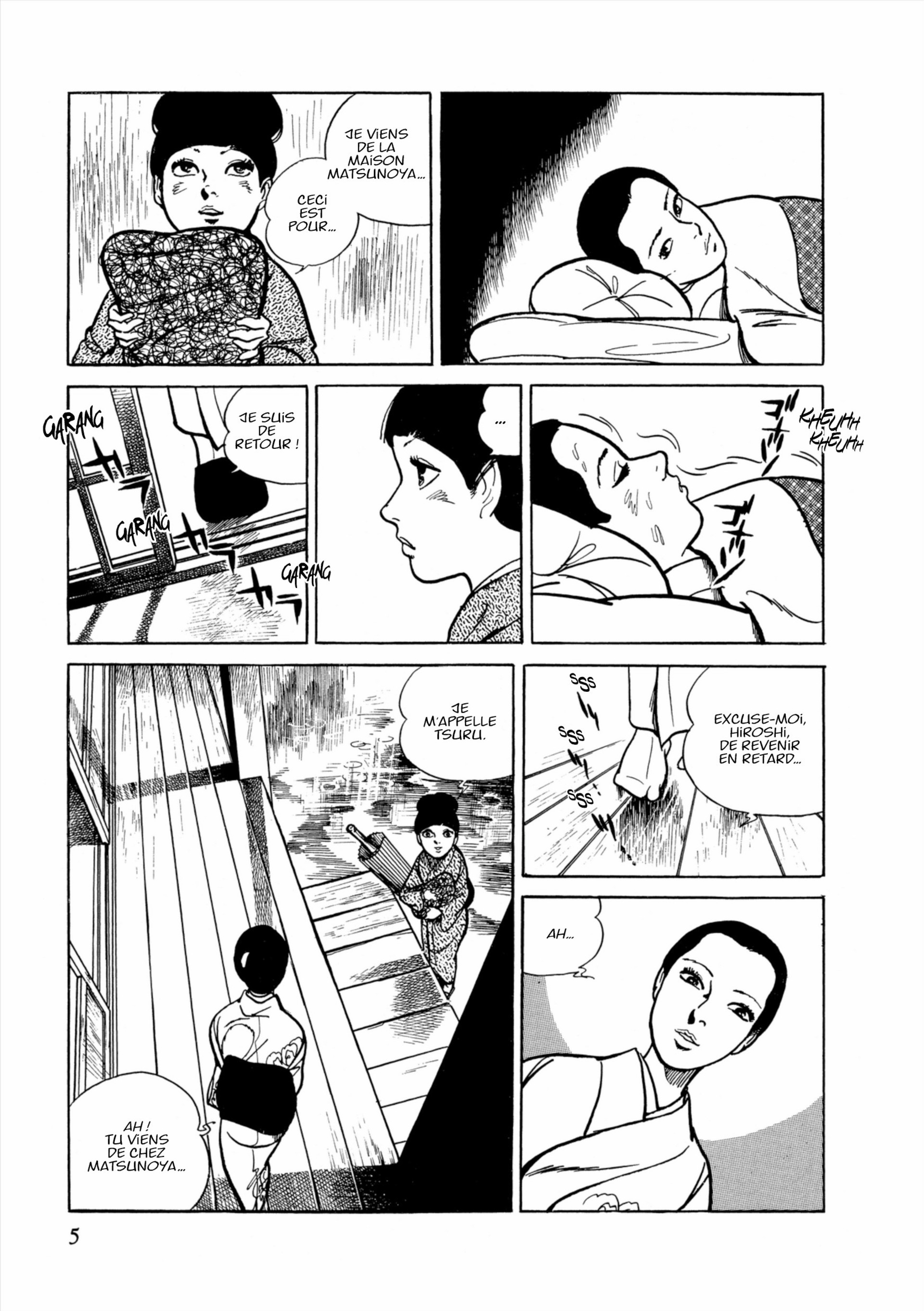 O-Tsuru (« la grue »), appelée ainsi parce que petite elle avait l’habitude de se tenir sur un pied pour réchauffer l’autre, a été vendue par ses parents pour qu’elle devienne une geisha. Elle va donc commencer comme shikomikka (« apprentie ») dans une okiya : la maison où vivent les geishas. En faisant les commissions de ses aînées, Tsuru va découvrir la vie de ses femmes. Enfin, un jour, son tour arrive. Elle se rend dans la chambre de son bienfaiteur. Celui qui, en payant les frais de cérémonie, va la faire entrer dans le monde des geishas. Tsuru va alors prendre le nom de Tsurugiku et devenir une geisha célèbre dans le monde des plaisirs.