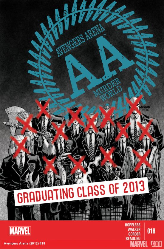 "BOSS LEVEL" PART 5 – THE SEARING SERIES FINALE! Arcade's mad plan comes to pass! Who lives? Who dies? Shock follows shock as the game reaches its last desperate seconds! AVENGERS ARENA ends here…but it's also the launch pad for what comes next!