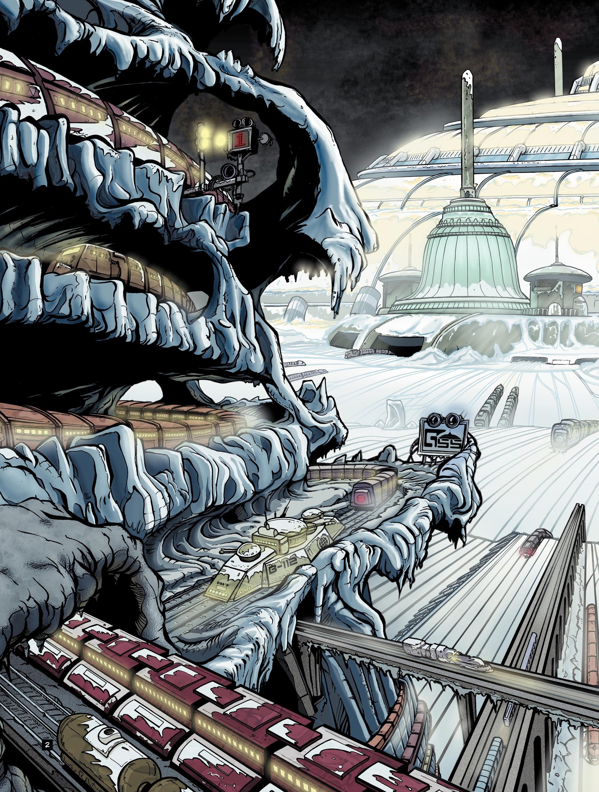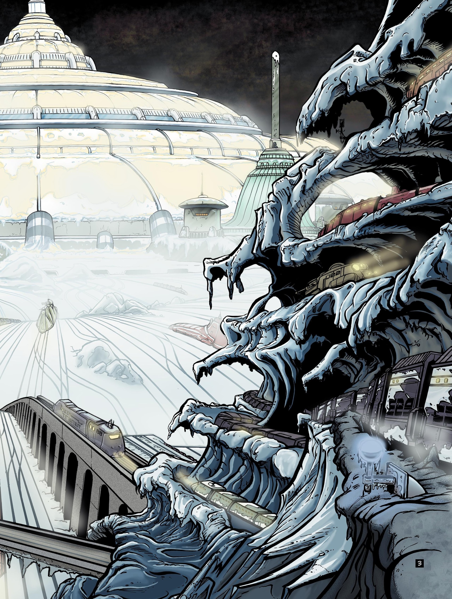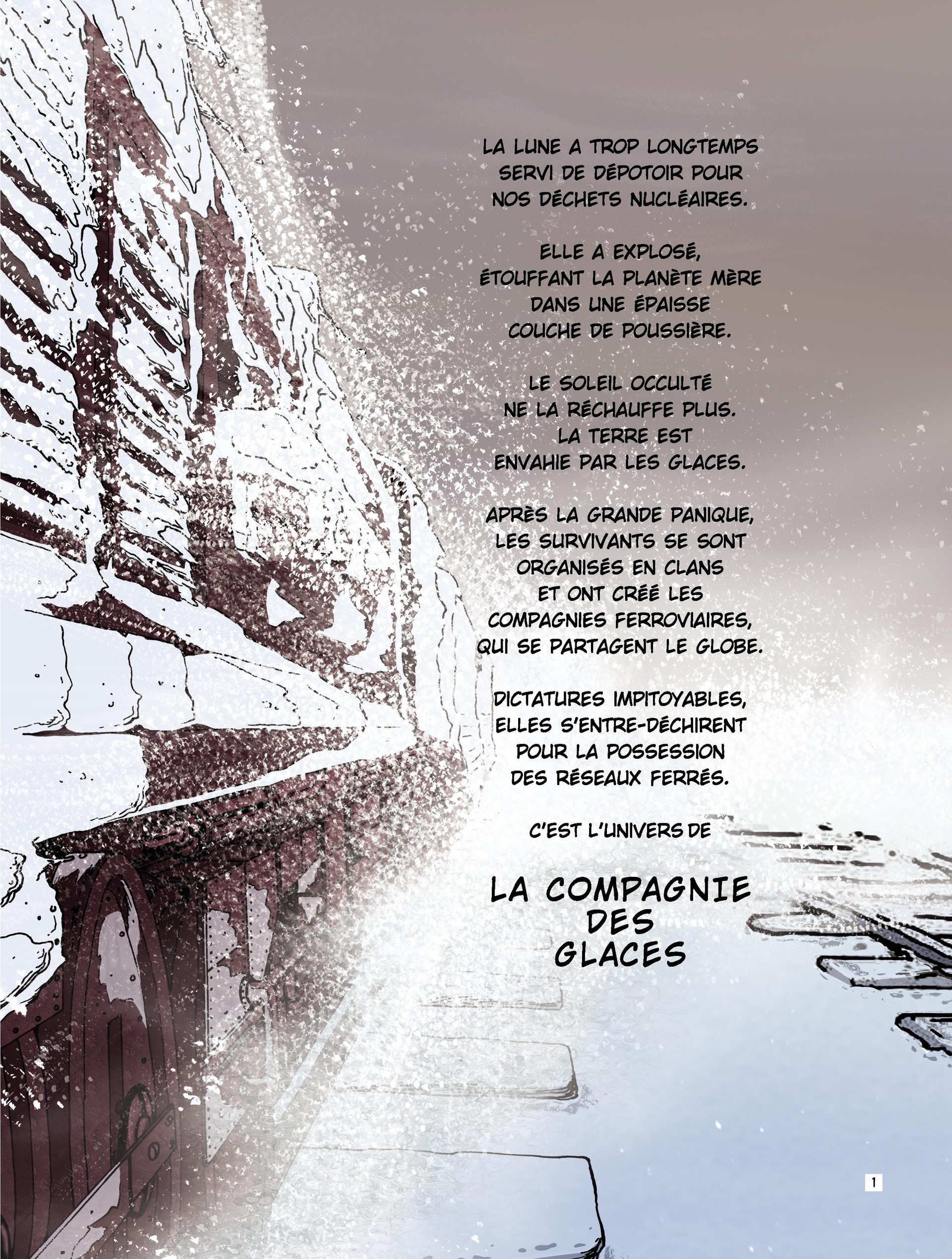 Vers 2050, la Lune explose, minée par les déchets nucléaires entreposés par les hommes. Une gangue de poussières diverses enc ercle la Terre, la privant de lumière et de chaleur solaires. La nuit post-catastrophe s'installe. Les glaces montent refoulant les populations survivantes vers des îlots protégés. Aux environs de 2350, une nouvelle civilisation s'est installée, dominée par des clans qui contrôlent les lignes ferroviaires, remplaçant ainsi le pouvoir des états-nations. 2350. La Terre n'est plus qu'une calotte glaciaire parsemée de dômes sous lesquels vivent des populations diverses. Le peuple est, on s'en doute, le plus malheureux : il vit sous des températures de moins de 15°. Les Aiguilleurs sont les maîtres du rail, dont la devise, l'immobilité, c'est la mort, la mobilité, c'est la vie indique bien que les villes, les habitations peuvent être transportées à tout instant. Voici les Actionnaires qui contrôlent tout, et surtout les richesses. Ils vivent dans une opulence qui contraste avec la misère du Peuple. Et puis, les Roux, de mystérieux êtres imperméables au froid et dotés d'un appétit sexuel impressionnant. Qui sont-ils, d'où viennent-ils . Seront-ils le moteur qui fera s'écrouler une société de l'injustice, de l'arbitraire et de la violence . Effectivement, à l'image d'une banquise, tout semble figé dans ce monde cloisonné. Jusqu'au jour où un simple fonctionnaire, Lien Rag, commence à poser des questions dérangeantes, propres à faire vaciller les forteresses sur rail.