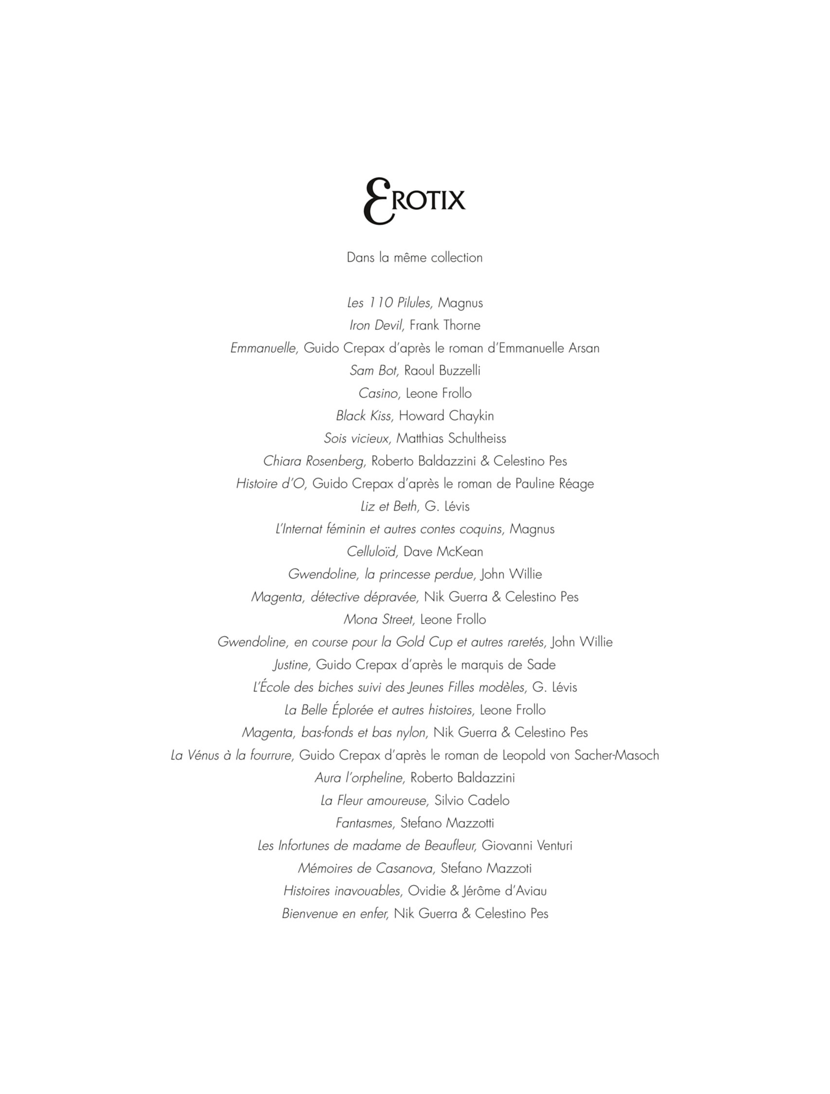 Elle est sous la coupe de Mario, un bel Italien qui deviendra son "professeur de jouissance ". Son nom : Emmanuelle. Ses aventures, d'abord publiées dans la clandestinité, en feront bientôt le symbole de la jeune femme moderne et libérée. En 197/1, un film de cinéma est tiré du roman, avec Sylvia Kristel. qui restera plus de 13 ans à l'affiche à Paris ! Quatre ans plus tard, Guido Crepax s'empare du mythe pour en composer une fidèle adaptation en bande dessinée.