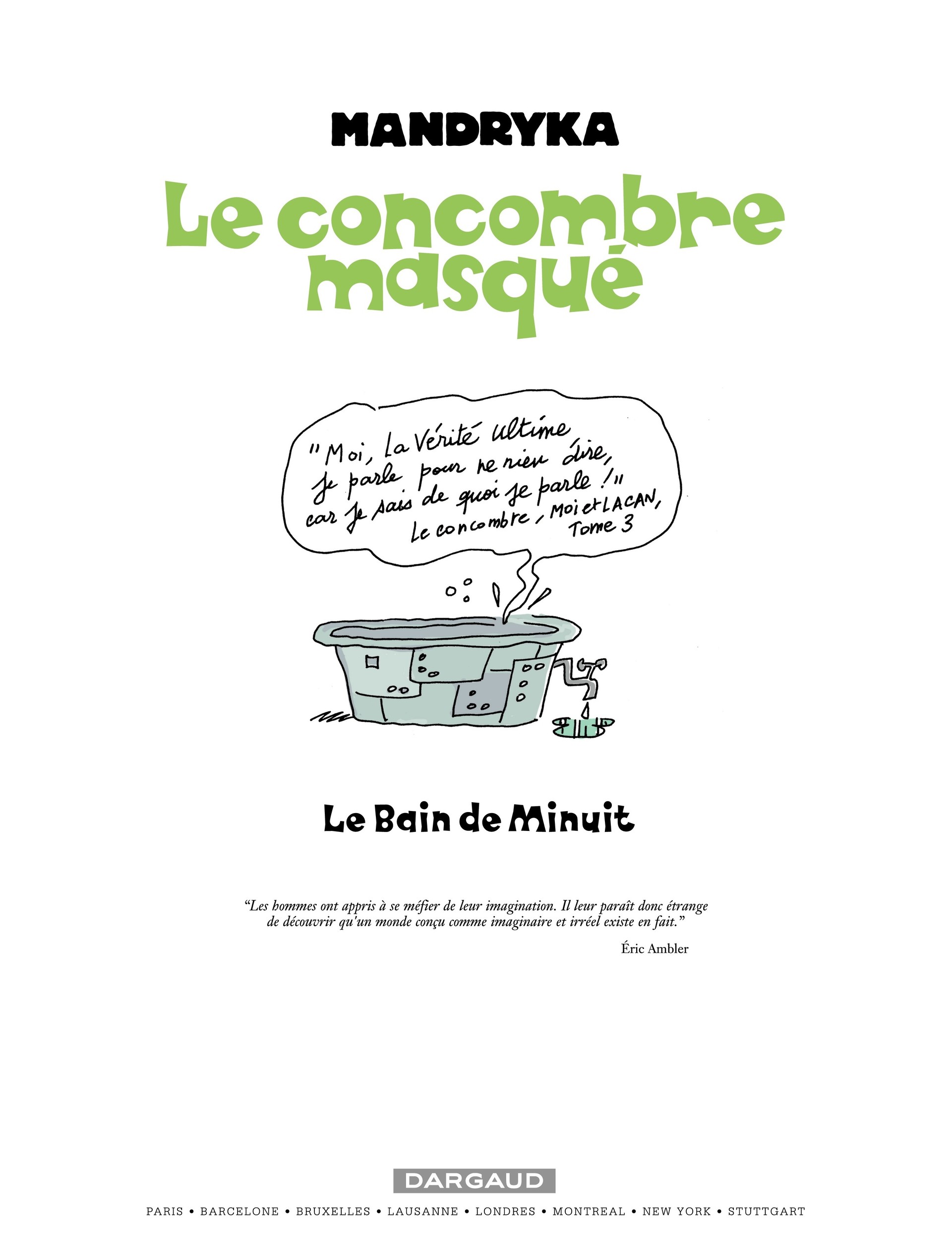 Bretzel liquide ! Le Concombre masqué est de retour et la Raison rationnelle n’a qu’à bien se tenir ! Figure légendaire de la bande dessinée des années 1970, pilier de Pilote et fondateur de L’Écho des savanes, Nikita Mandryka revient à ses premières amours légumières avec Le Bain de minuit. Rien ne va plus pour le Concombre. Il a un problème, et même plusieurs qui arrivent de tous les côtés et partent à l’assaut de sa forteresse. Que faire ? Certes, il y a bien l’aspirateur à problèmes, cette belle invention, ou encore le canon à problèmes, qui permet de les éjecter par-dessus la frontière et de les délocaliser. Mais ce n’est pas suffisant. Heureusement, le Concombre n’est jamais à court d’idées : grâce au Bain de minuit, il va découvrir la Vérité Ultime. Cette fois, les problèmes n’ont qu’à bien se tenir !