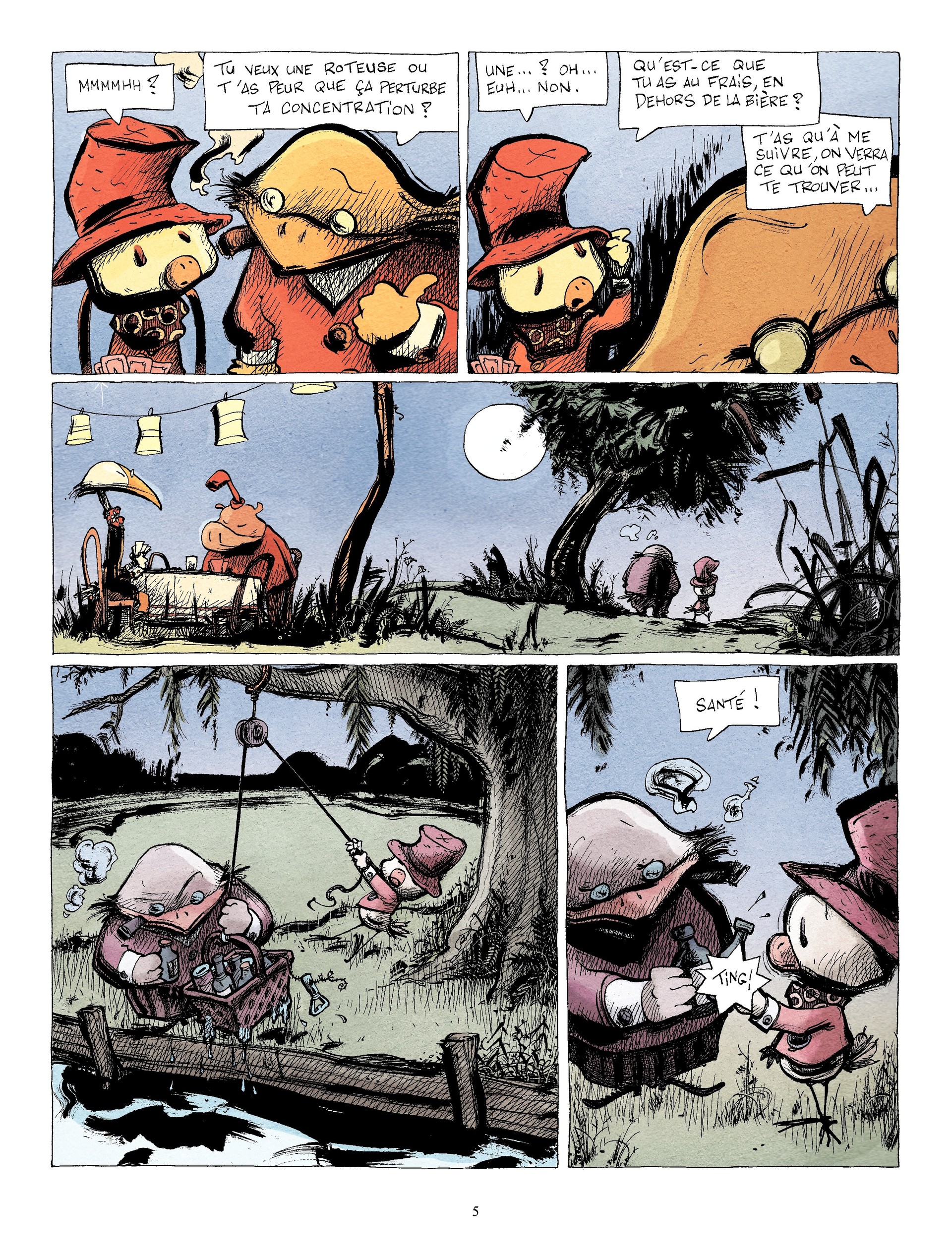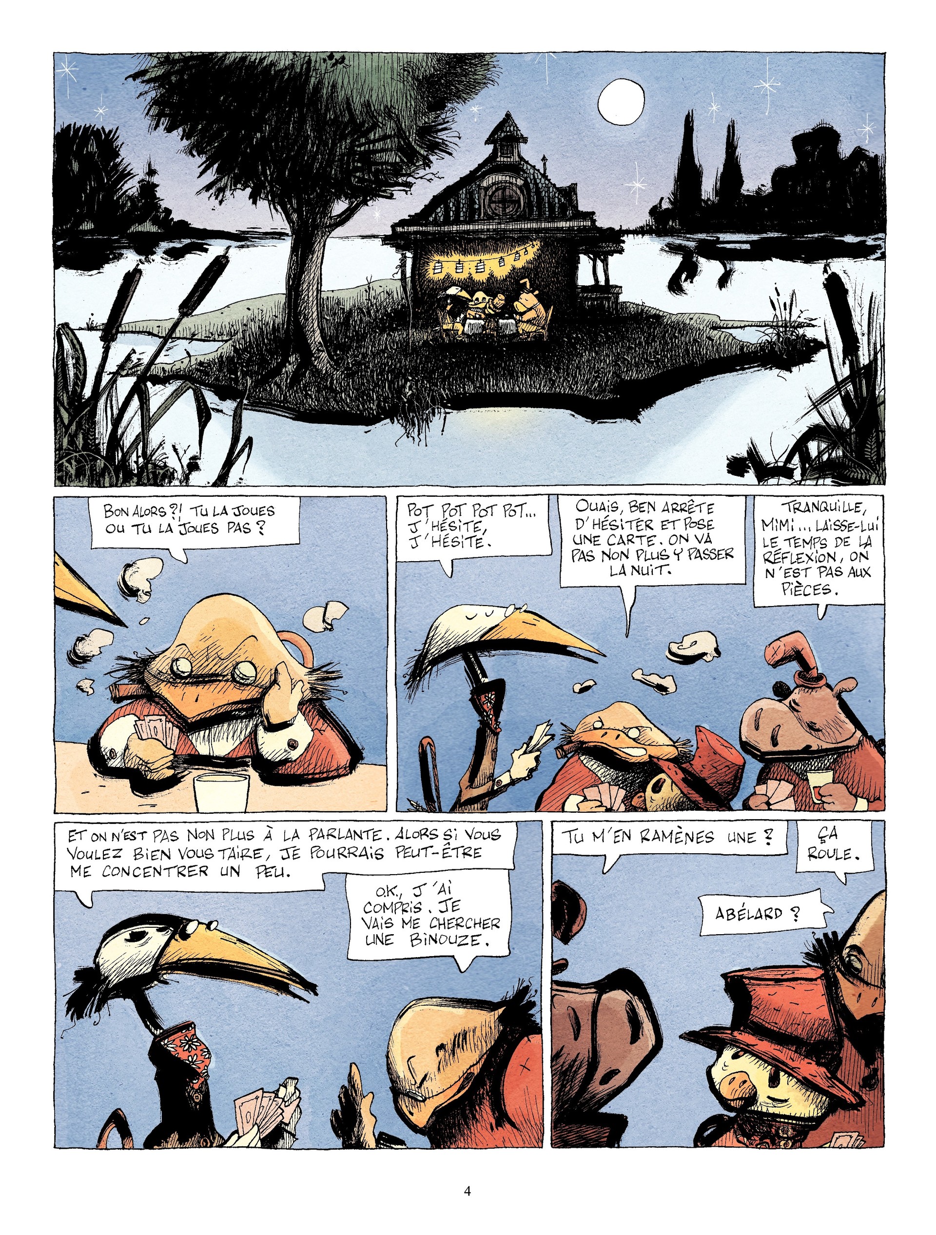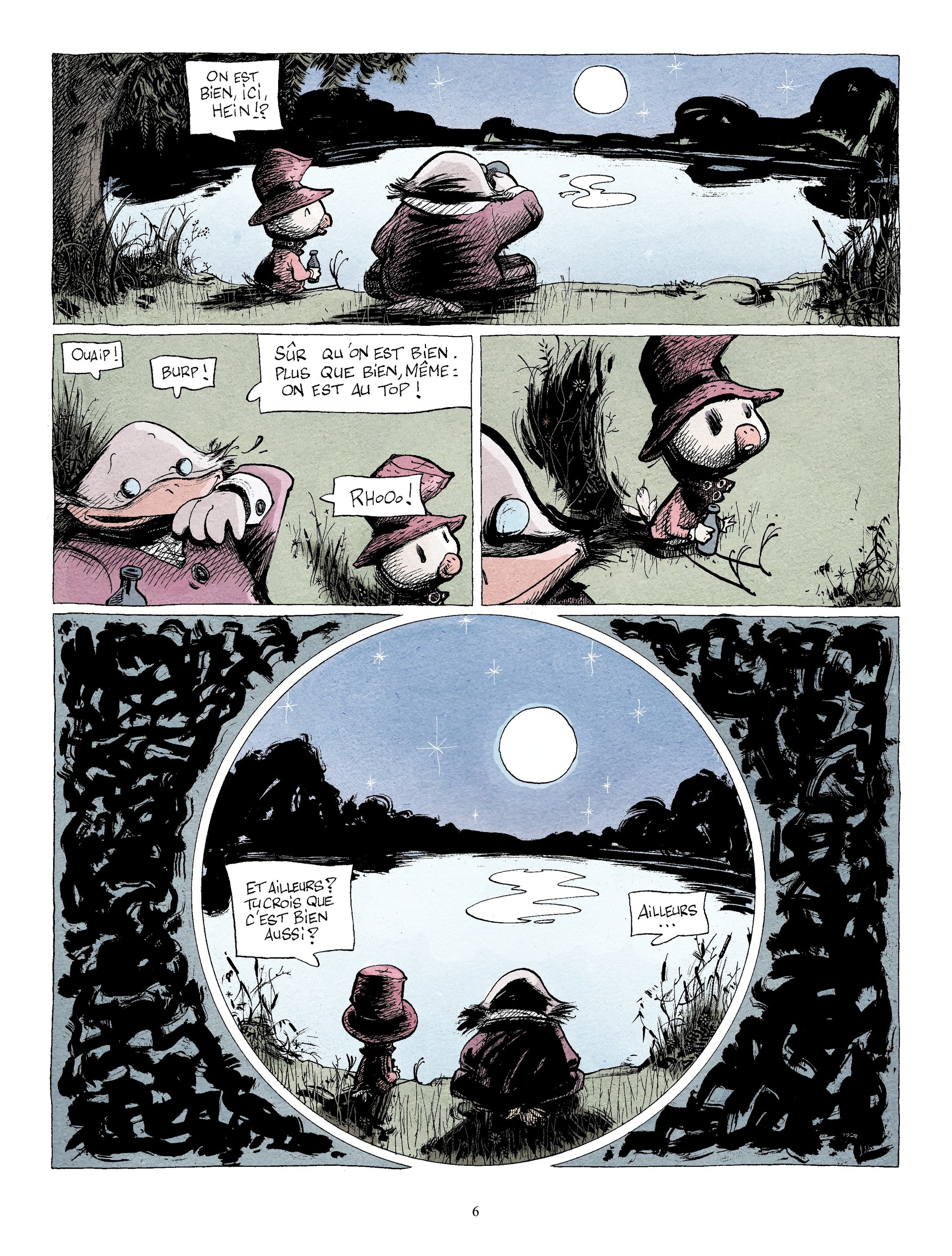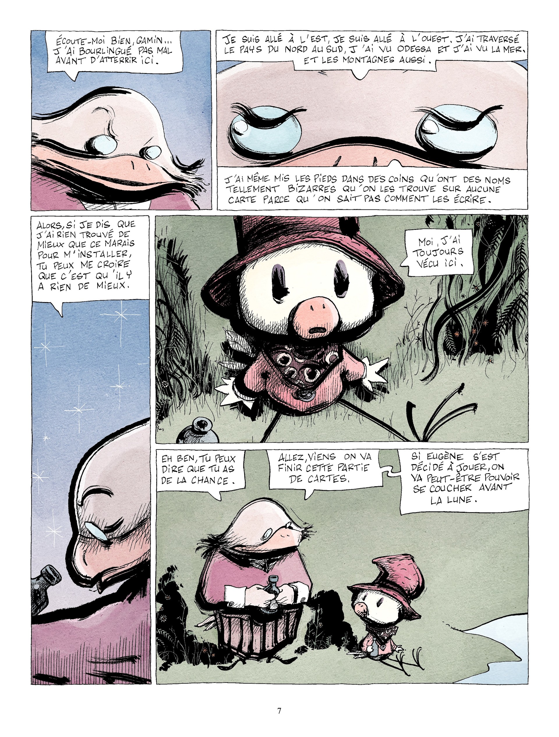 10Un petit bijou de mélancolie, candeur, poésie, naïveté, tendresse...servi par des dessins d'une déconcertante simplicité, aux traits épais et aux couleurs ocres. Abélard, jeune poussin du marais, rêverait bien d'un ailleurs mais à quoi bon voyager quand les anciens prétendent qu'il n'existe rien qui souffre la comparaison avec leur chez-eux. Seulement, tout Candide se doit de faire un voyage i...
