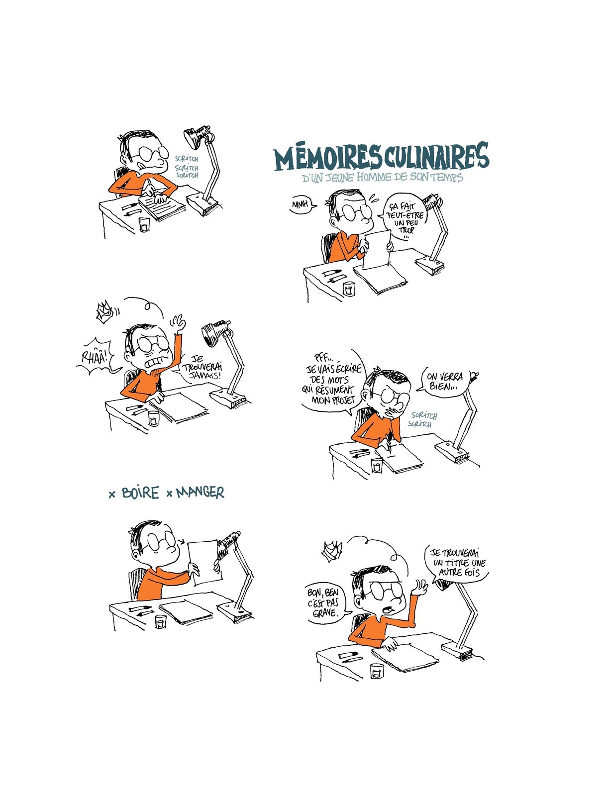 Pour Guillaume Long, la cuisine est un art de vivre ludique et les réponses à ces questions s’écrivent en bande dessinée. Il recompose pour le livre les notes, recettes, anecdotes, portraits…