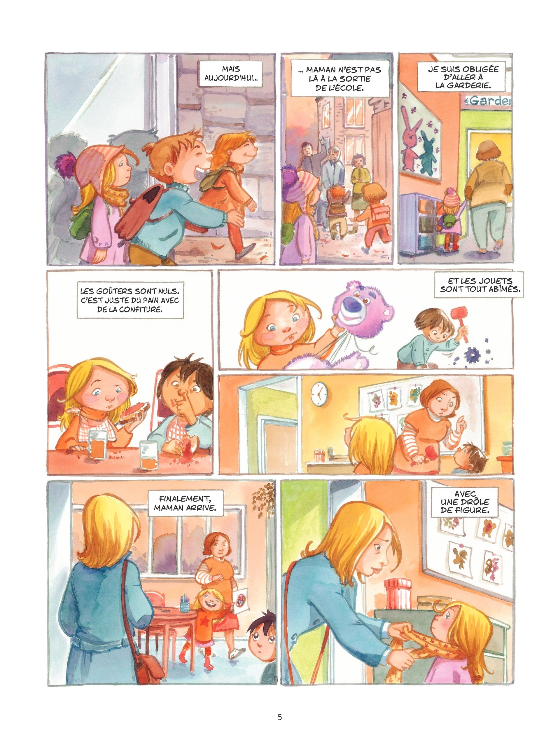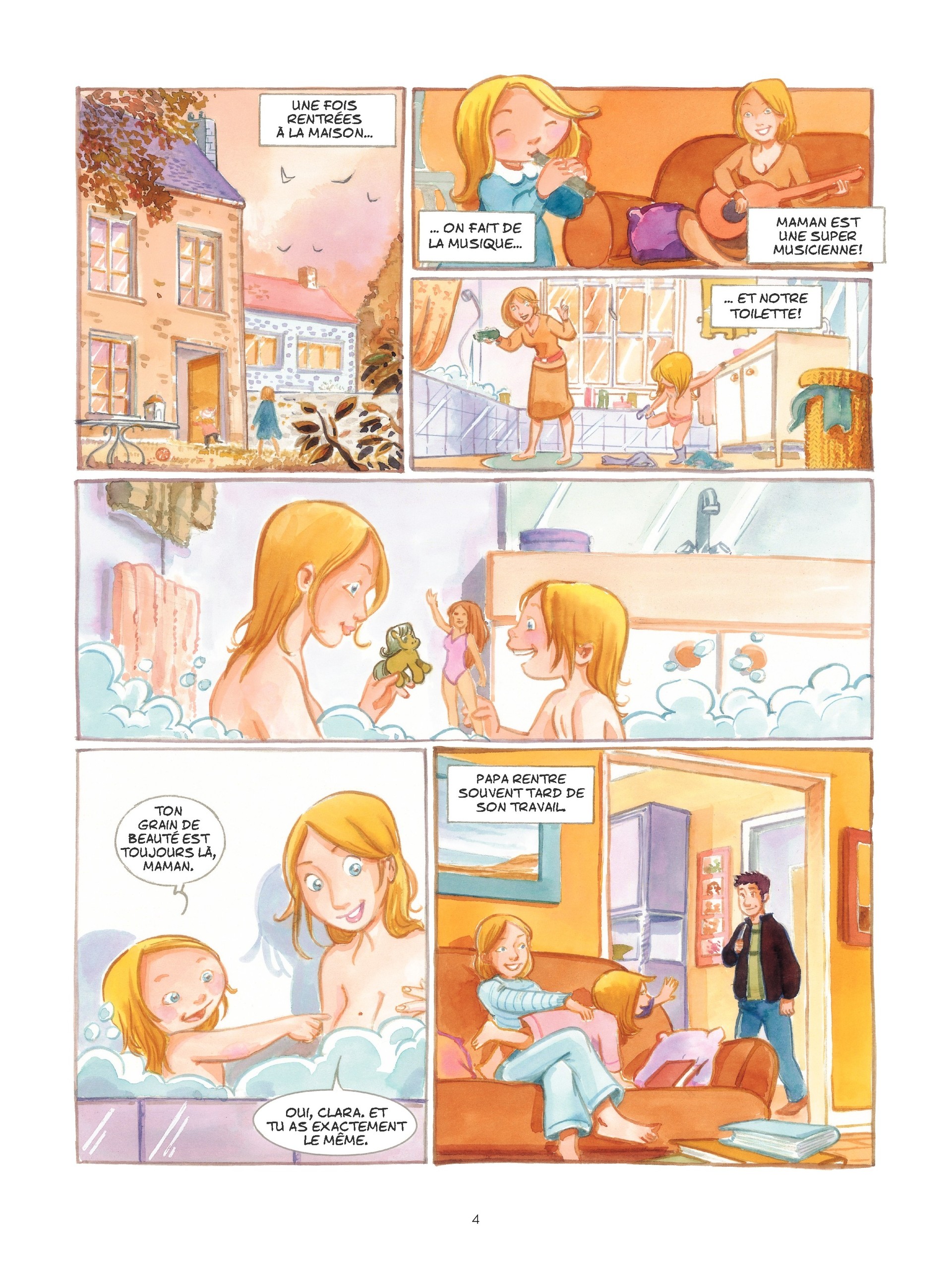 4De très jolis dessins, des aquarelles soignées, des tons pastels. C'est sûr, nous entrons dans l'univers d'une petite fille, Clara. Ils sont beaux, ils sont gentils, ils sont heureux, ils s'aiment, la vie est d'une routine rassurante et épanouissante pour la petite Clara. Hélas, car il en faut toujours un, son insouciance va être mise en branle par la maladie soudaine puis le décès de sa maman....
