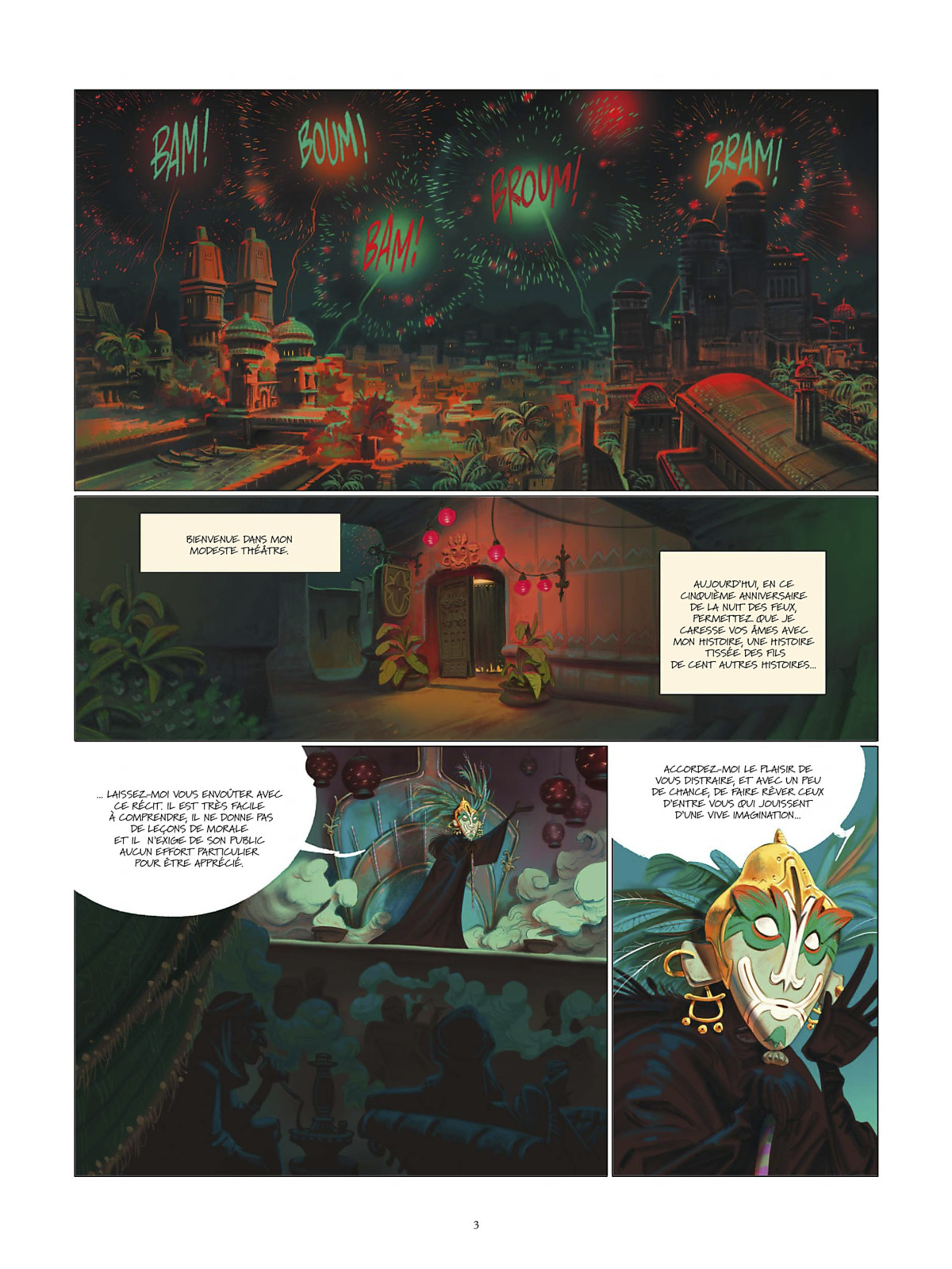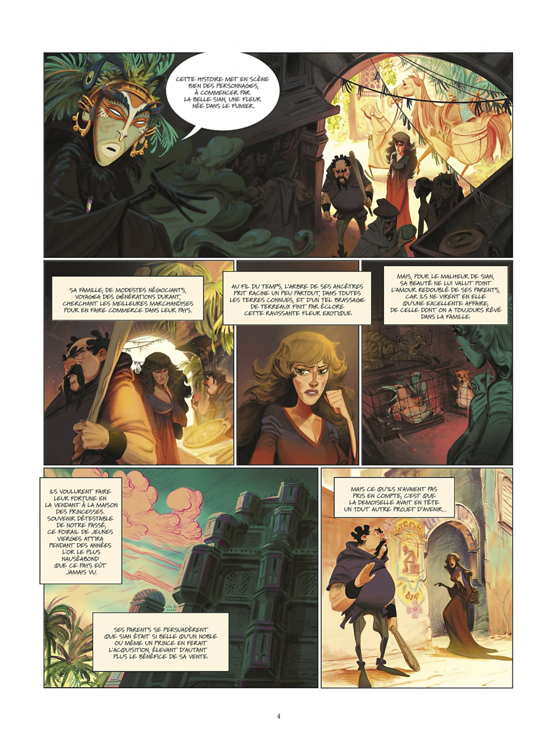 « Permettez que je caresse vos âmes avec mon histoire, tissée des fils de cent autres histoires… ». C’est ainsi que commence, pour notre plus grand plaisir, le récit d’un habile conteur masqué. Son histoire, c’est d’abord celle de la belle Sian, une fleur née dans le fumier, et d’Irvi, un étrange jeune homme qui a la capacité de traverser la ville sans jamais poser les pieds au sol. Sian doit être emmenée dans la maison des princesses, foirail de jeunes vierges mises en vente par leurs parents. Irvi compte bien entendu s’y opposer ! Mais le destin en a décidé autrement… Et c’est alors que commence une épopée pleine de rebondissements tous plus drôles, émouvants et palpitants les uns que les autres !