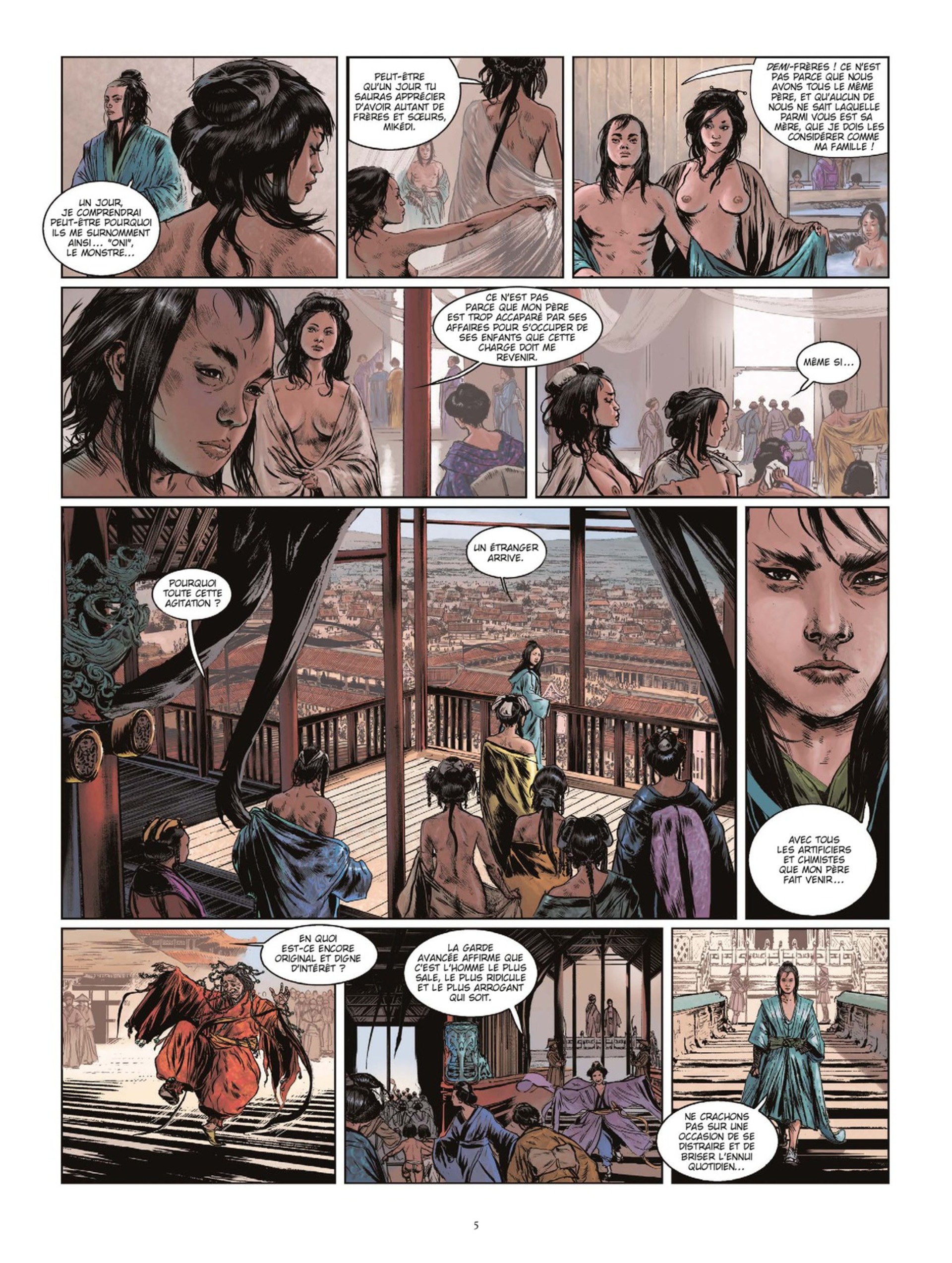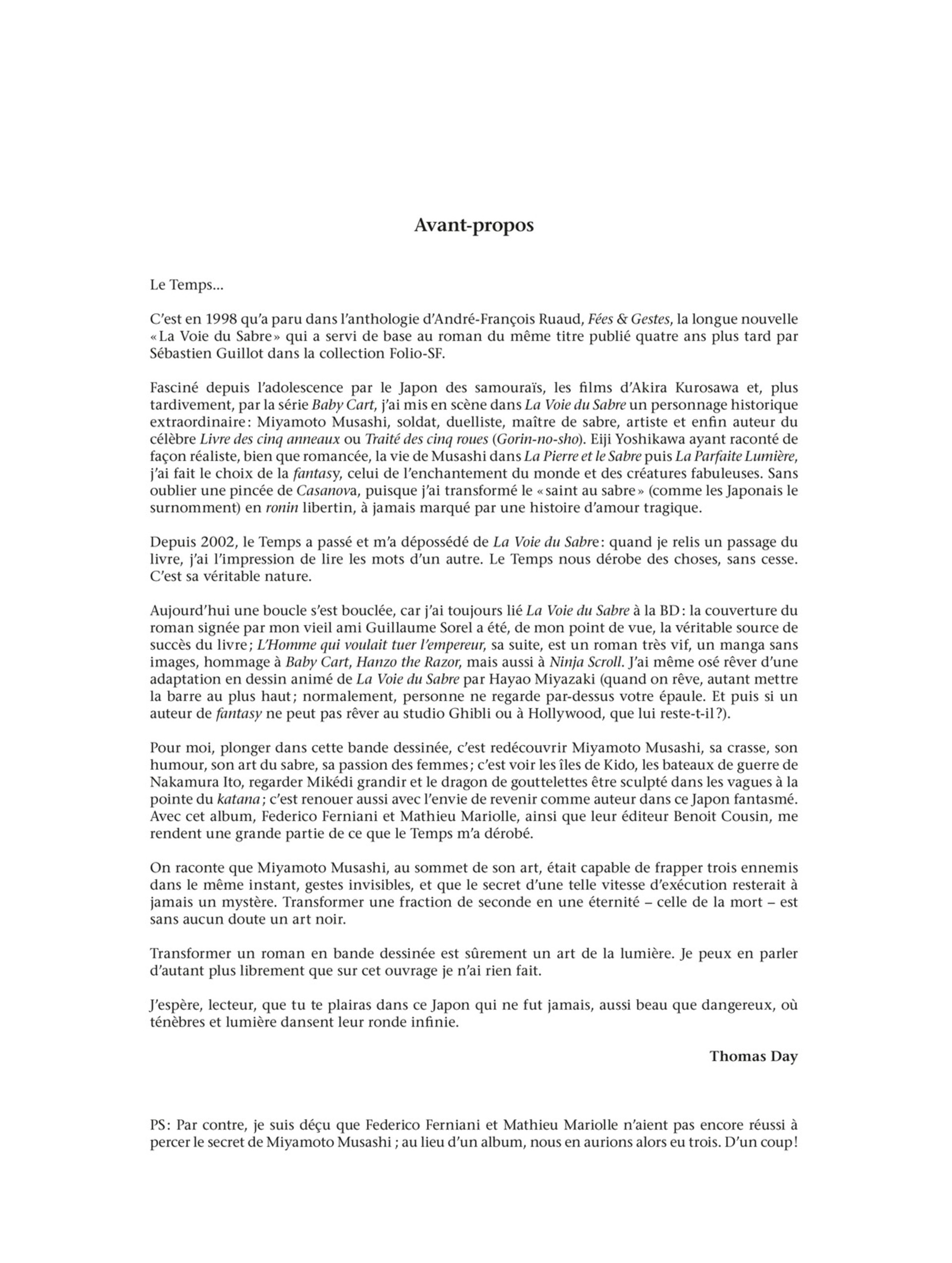 La vie du jeune Mikédi, fils du chef de guerre Nakamura, est bouleversée lorsque débarque dans la forteresse où il vit un samouraï de légende, Miyamoto Musashi. Cet homme, puissant et repoussant à bien des égards, est pourtant le plus grand maître de sabre qu’ait connu l’Empire. Nakamura souhaite en faire son premier samouraï, mais Musashi préfère reprendre la route en prenant Mikédi comme élève. La Voie du Sabre ne s’offre néanmoins pas au premier venu, et auprès de Musashi l’apprentissage de Mikédi aura souvent un goût amer…