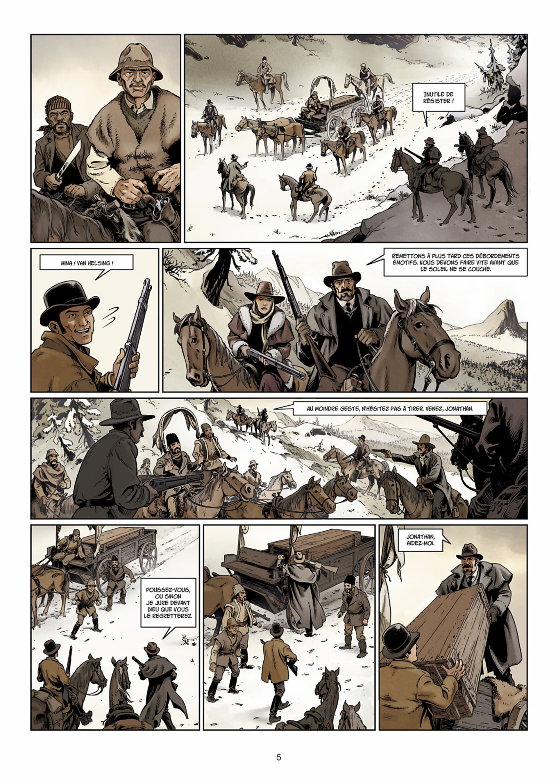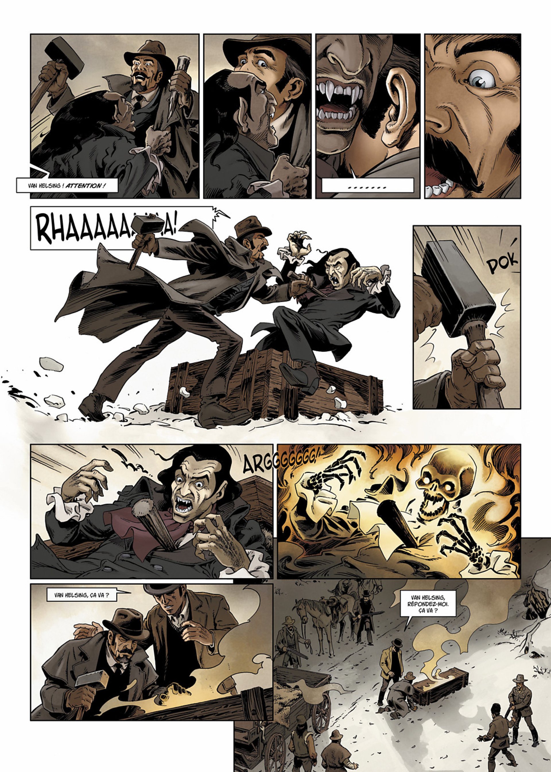 Sur un superbe dessin, point fort de cet ouvrage, les auteurs nous racontent la traque par Van Helsing (qui a tué Dracula d’un pieu dans le cœur selon le roman) et son ami commissaire de Scotland Yard, de Jack L’Éventreur. L’histoire a un parfum de déjà vu mais elle est correctement traitée. Quant au dessin, c’est une profusion d’images kaléidoscopiques et envoutantes, scènes rougeoyantes et oni...