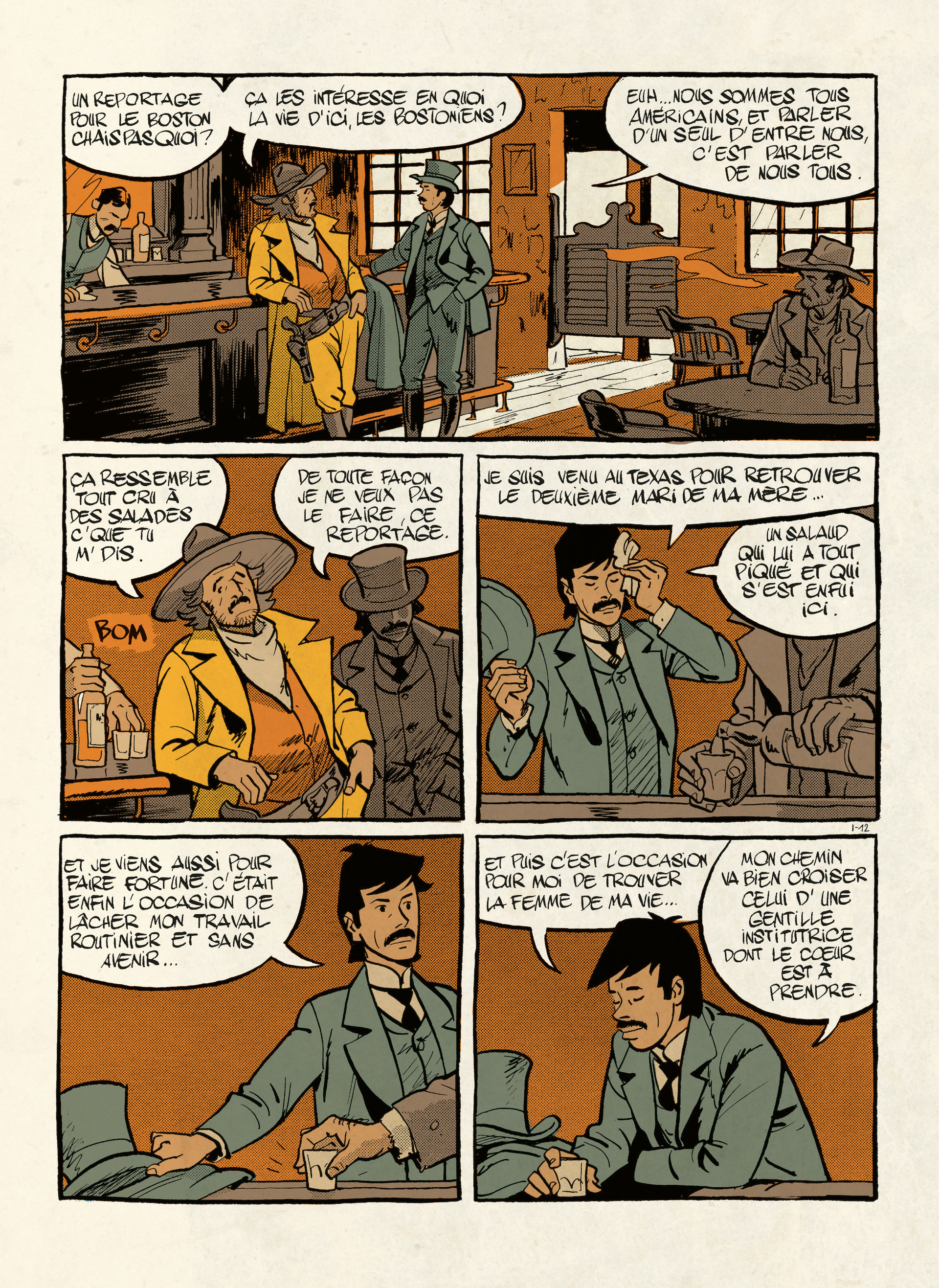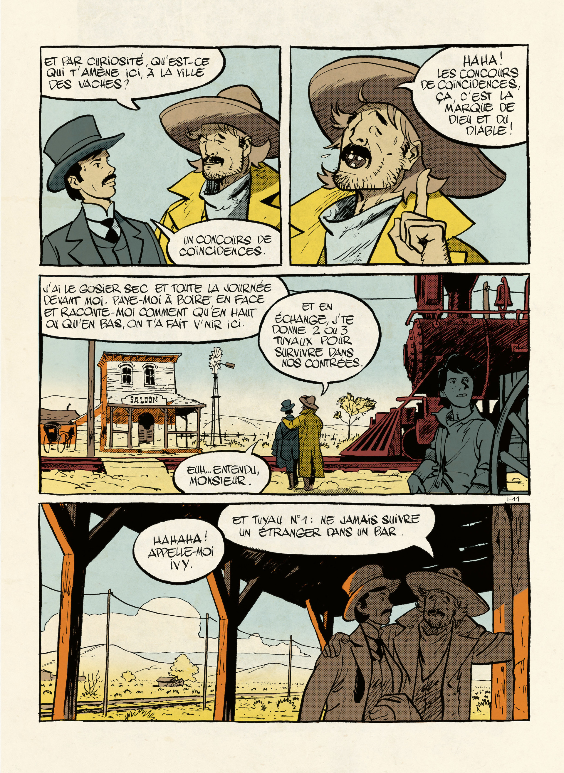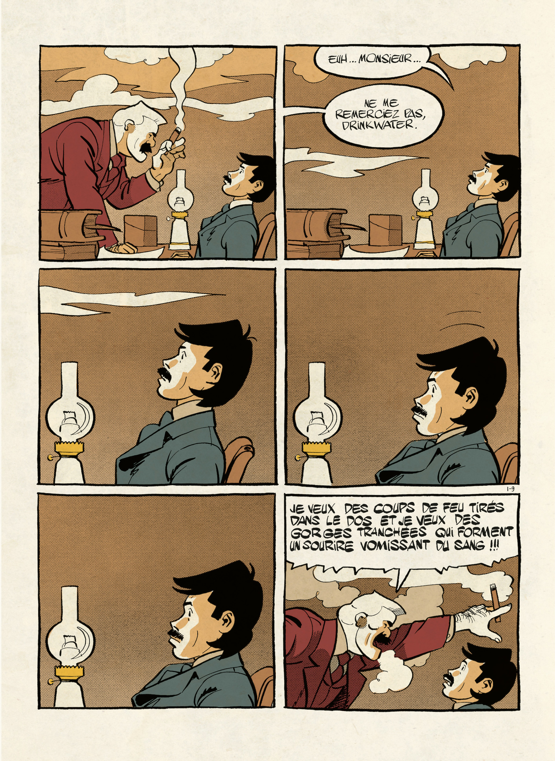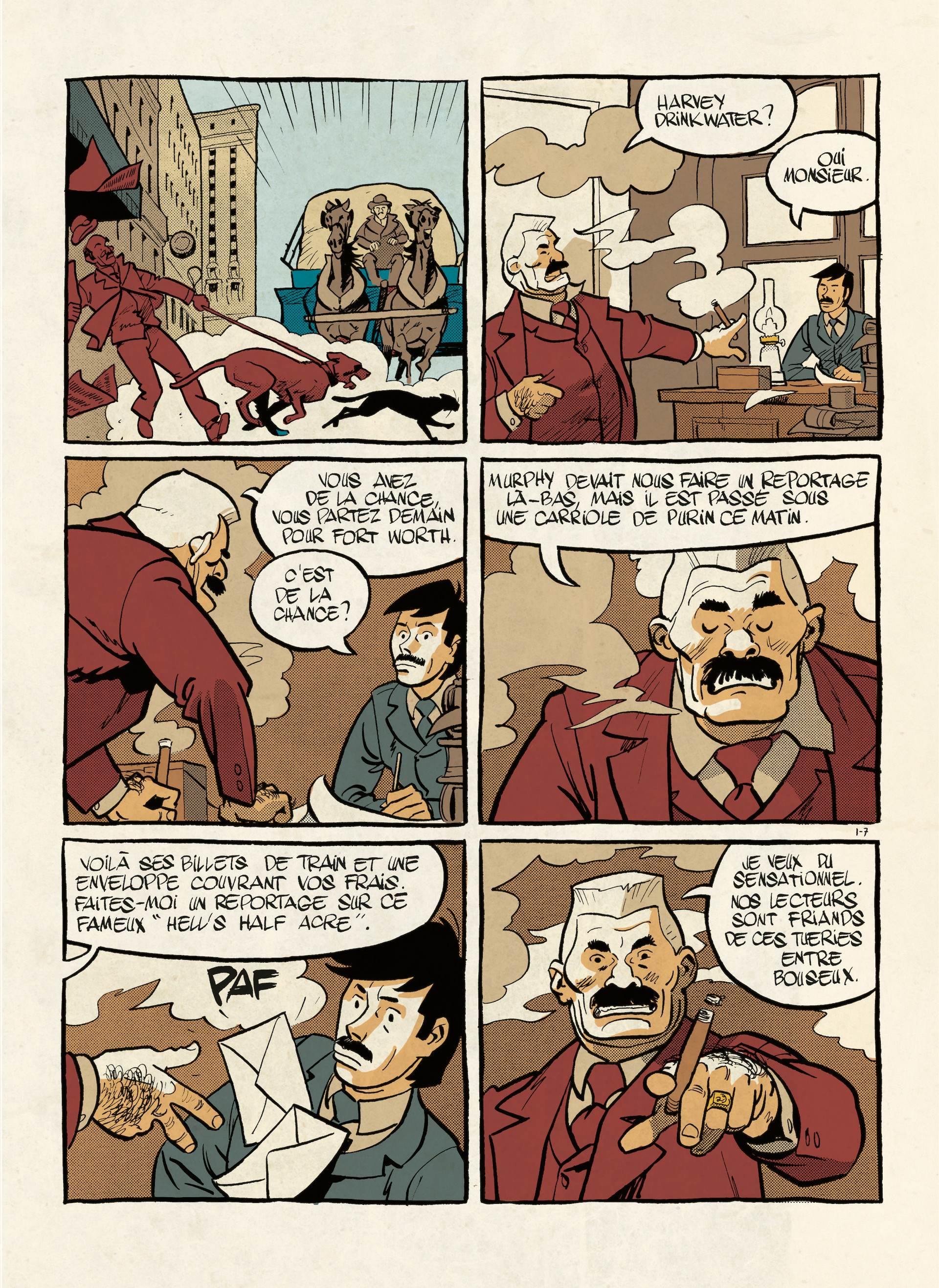 7Cela ressemble aux vielles BD de cowboys de notre enfance, style Kit Carson, au format agenda souple de poche, plein de coups de feu, de villes du far West et de bandits très méchants que le bon finissait toujours par vaincre. Nous suivons les aventures de Harvey Drink Water (au nom un rien décalé dans ce monde de soiffards) dans le lieu où il va faire son métier de journaliste remplaçant : un qu...