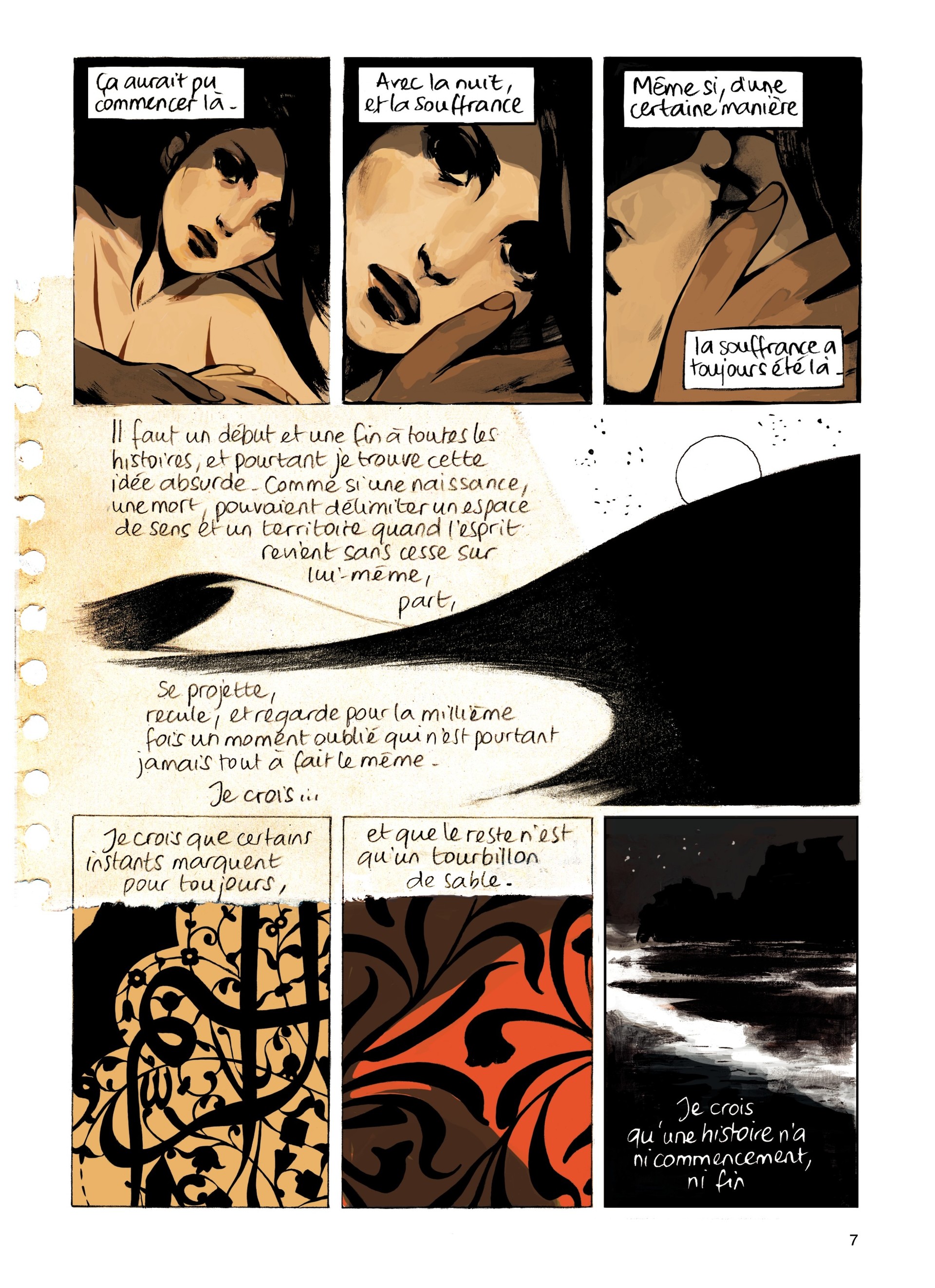 5Il y a quelques moments forts et baux dans cet ouvrage. Ceux des dessins simples, parfois aplats doux ou torturés, qui touchent, jaillissement de traits, de branches ou angoisse des visages. Il y a des couleurs qui éclatent en alternance avec des paysages noirs et blancs angoissants. Il y a de la poésie parfois, qui suggère un peu de la folie, un peu de l’angoisse et de la douleur devant la d...
