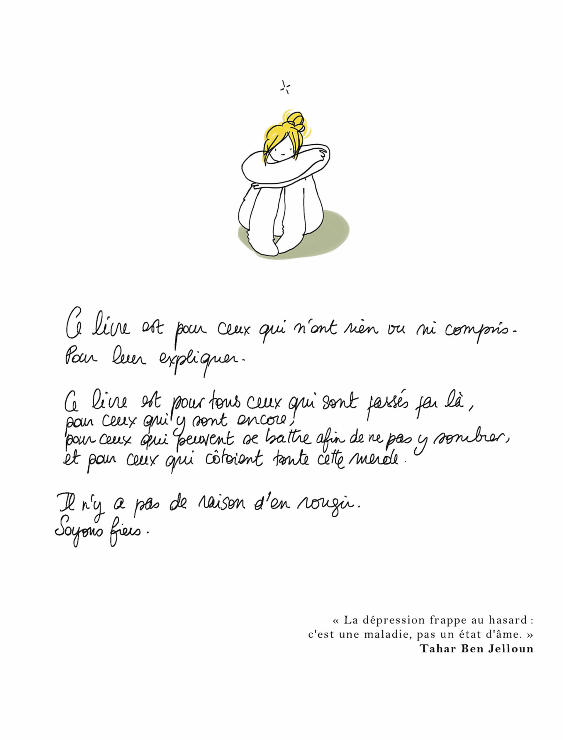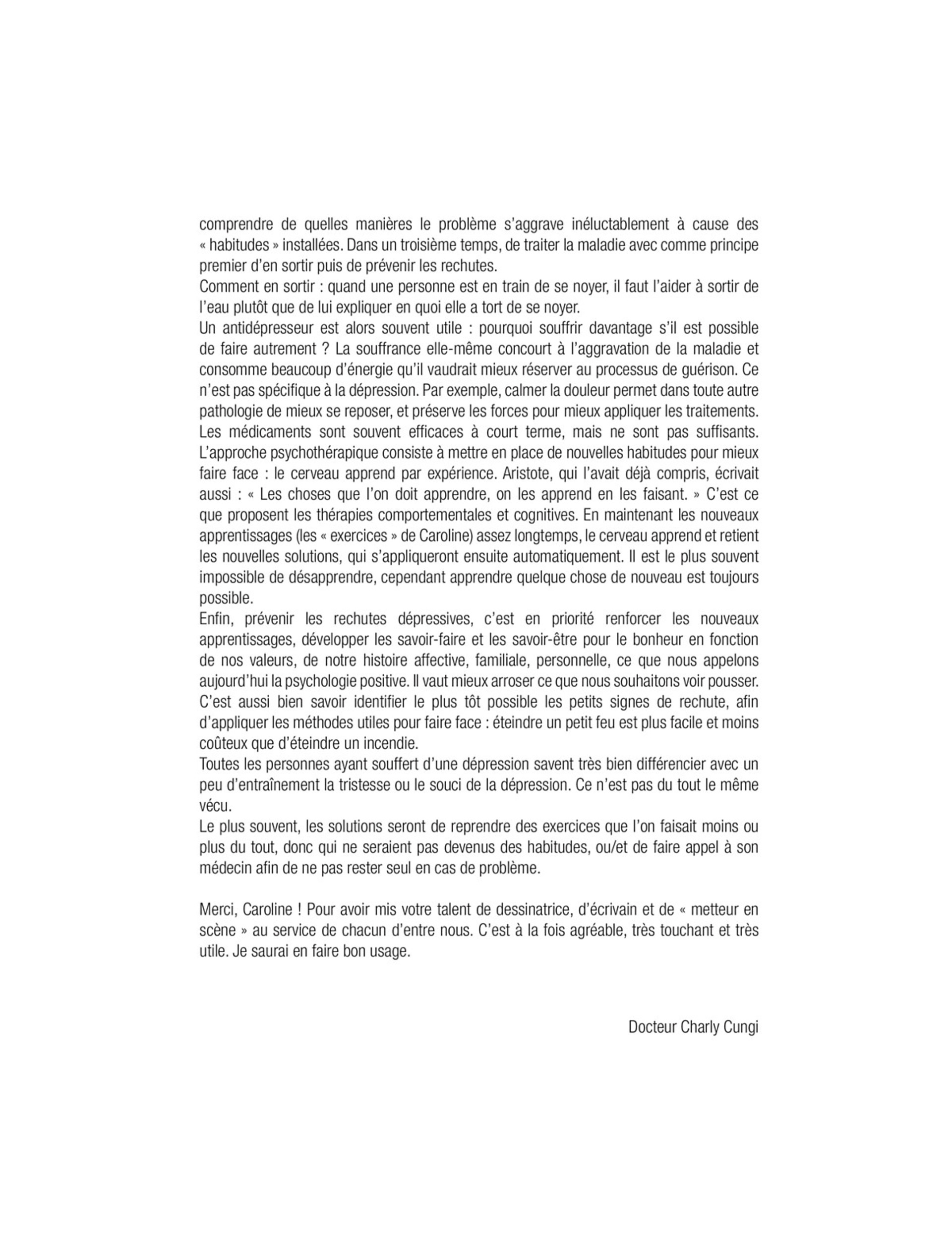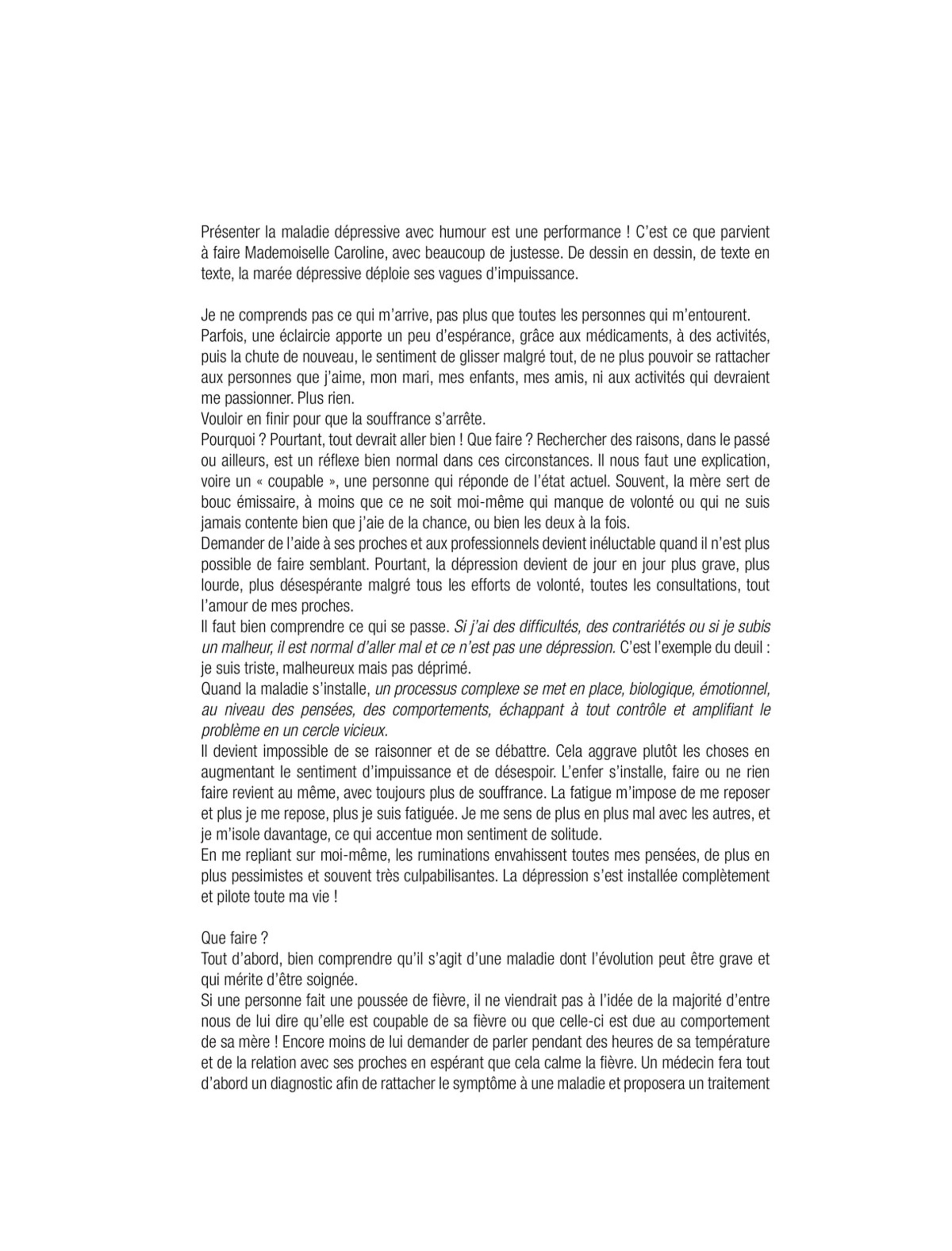 Caroline sombre dans la dépression après la naissance de son premier enfant. Elle est happée par cette maladie qui s'invite à trois reprises dans sa vie. Du protocole médicamenteux à la rechute, elle apporte un témoignage pour déculpabiliser ceux qui sont tombés dedans et donner des clés de compréhension à l'entourage... Des Carnets du gouffre troublants, mais aussi drôles et émouvants.
