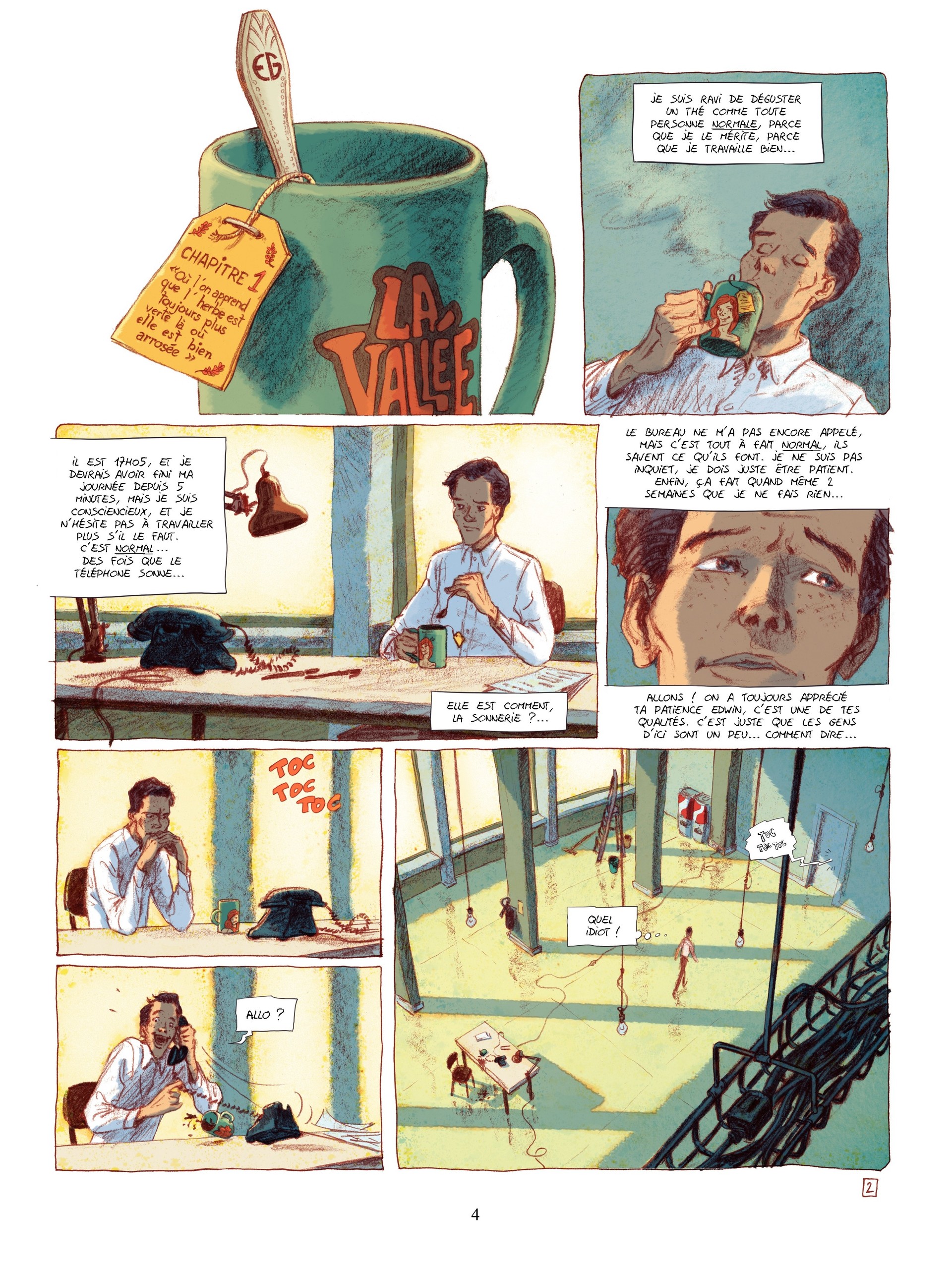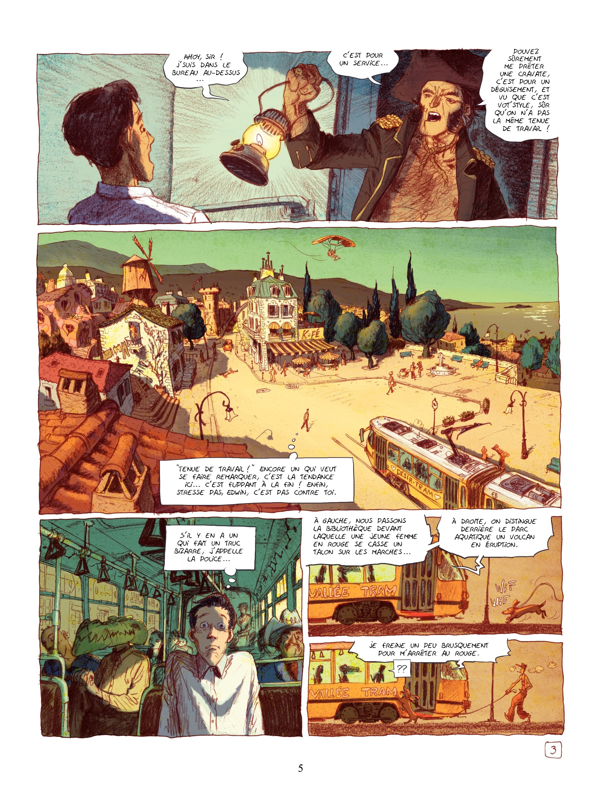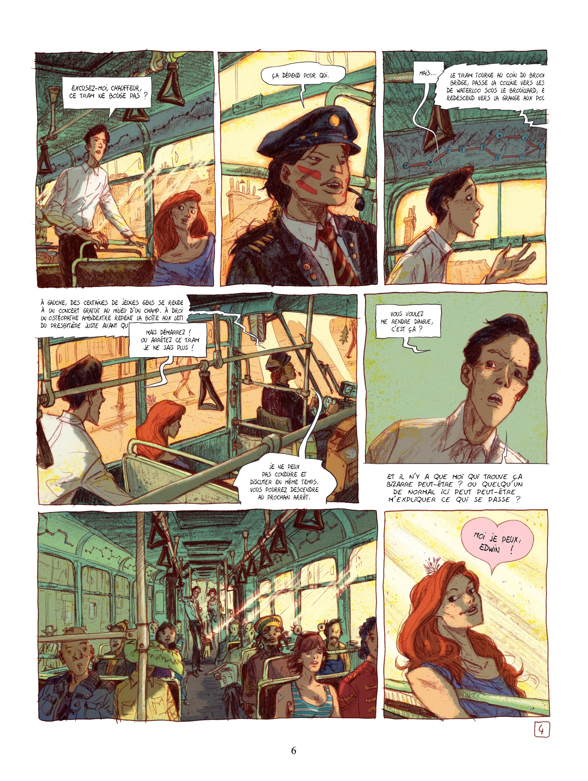 7Je ne suis pas totalement d'accord avec les allusions aux Monty Python ou à Tex Avery. En comparaison de ces monstres de l'absurde, j'ai trouvé l'histoire un peu trop sage côté scénario. Heureusement, il y a les dessins de Martin Trystram qui nous entraînent dans un décalage quasi permanent avec des couleurs douces (merci Ruby), des cases irrégulières et des clins d'oeil (et hommages) successifs à...