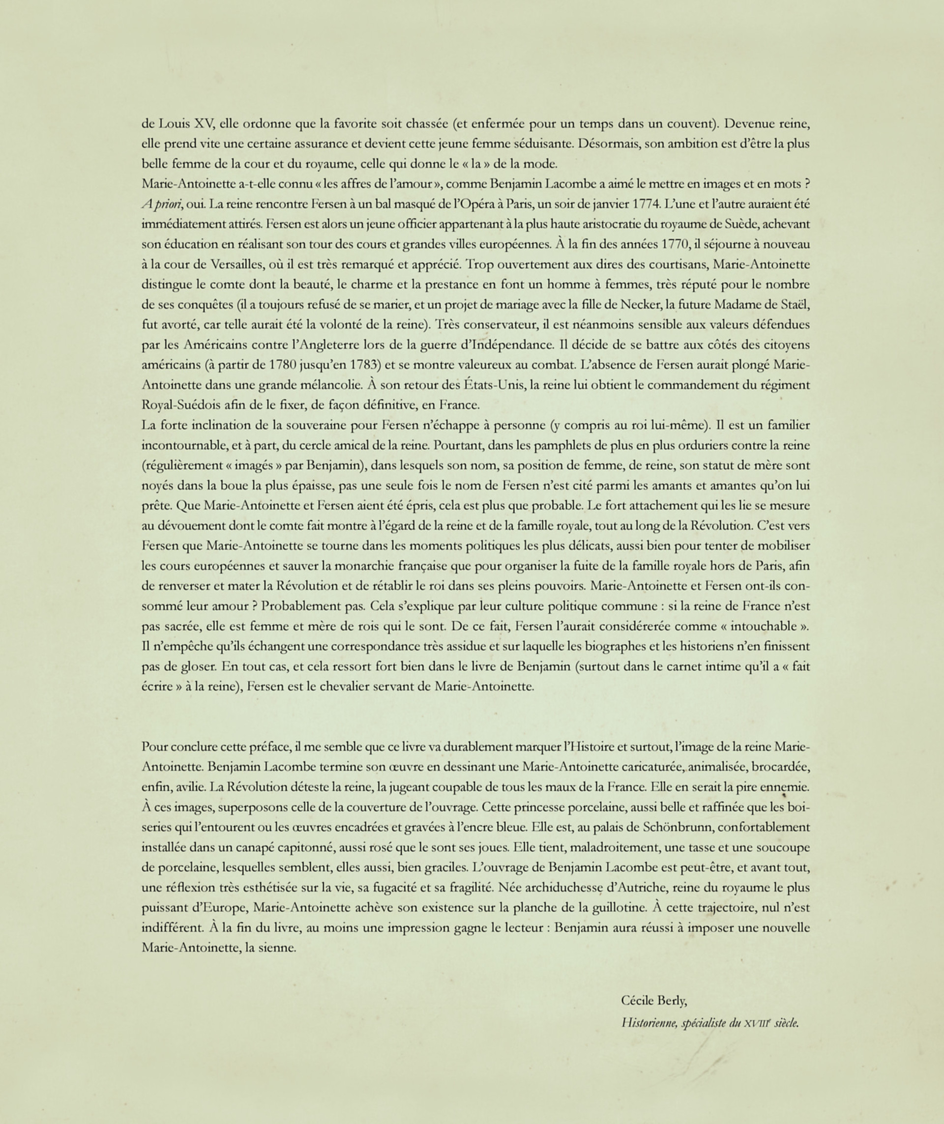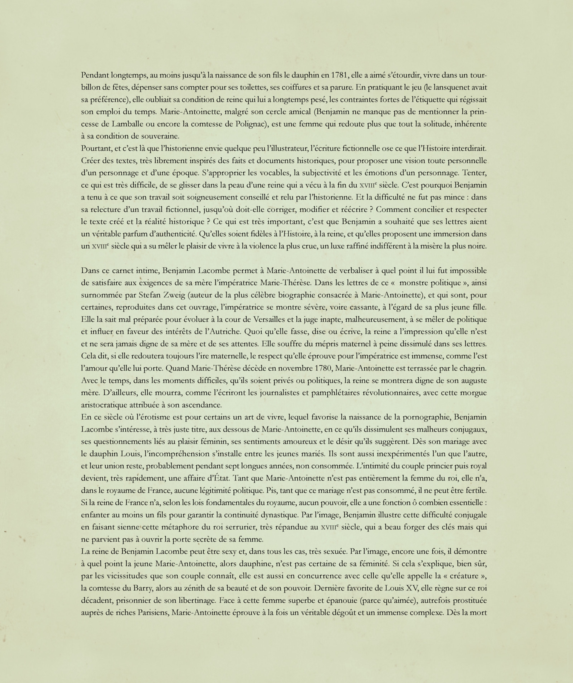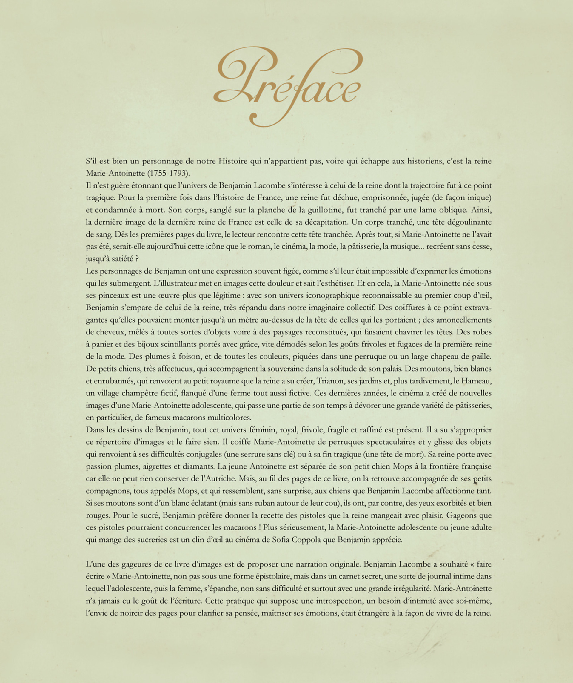Qui n'a jamais rêvé de s'immerger dans l'intimité de Marie-Antoinette, archiduchesse d'Autriche, dernière reine de France et de Navarre, femme célèbre et controversée devenue un véritable mythe ? Sous la forme d'une belle édition a la fabrication soignée, nous vous proposons de découvrir son journal intime. Porté par Benjamin Lacombe, accompagné par le regard de Cecile Berly, historienne, spécialiste de Marie-Antoinette, ce carnet d'une richesse graphique inouïe (peintures, aquarelles, crayonnes) mêlera certaines des lettres authentiques de Marie-Antoinette, à celles, fictives, du Comte Fersen avec lequel elle entretenait une relation privilégiée.