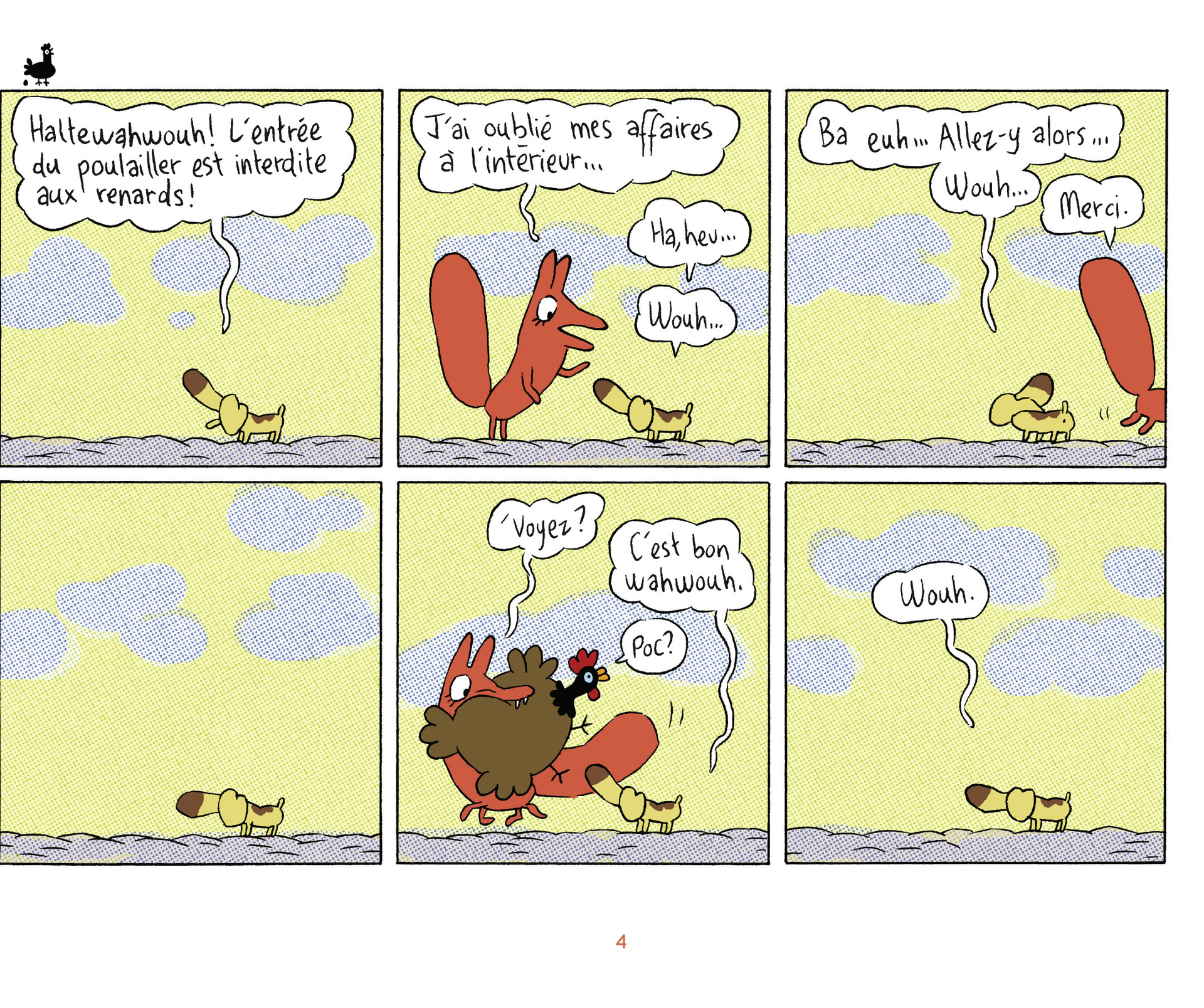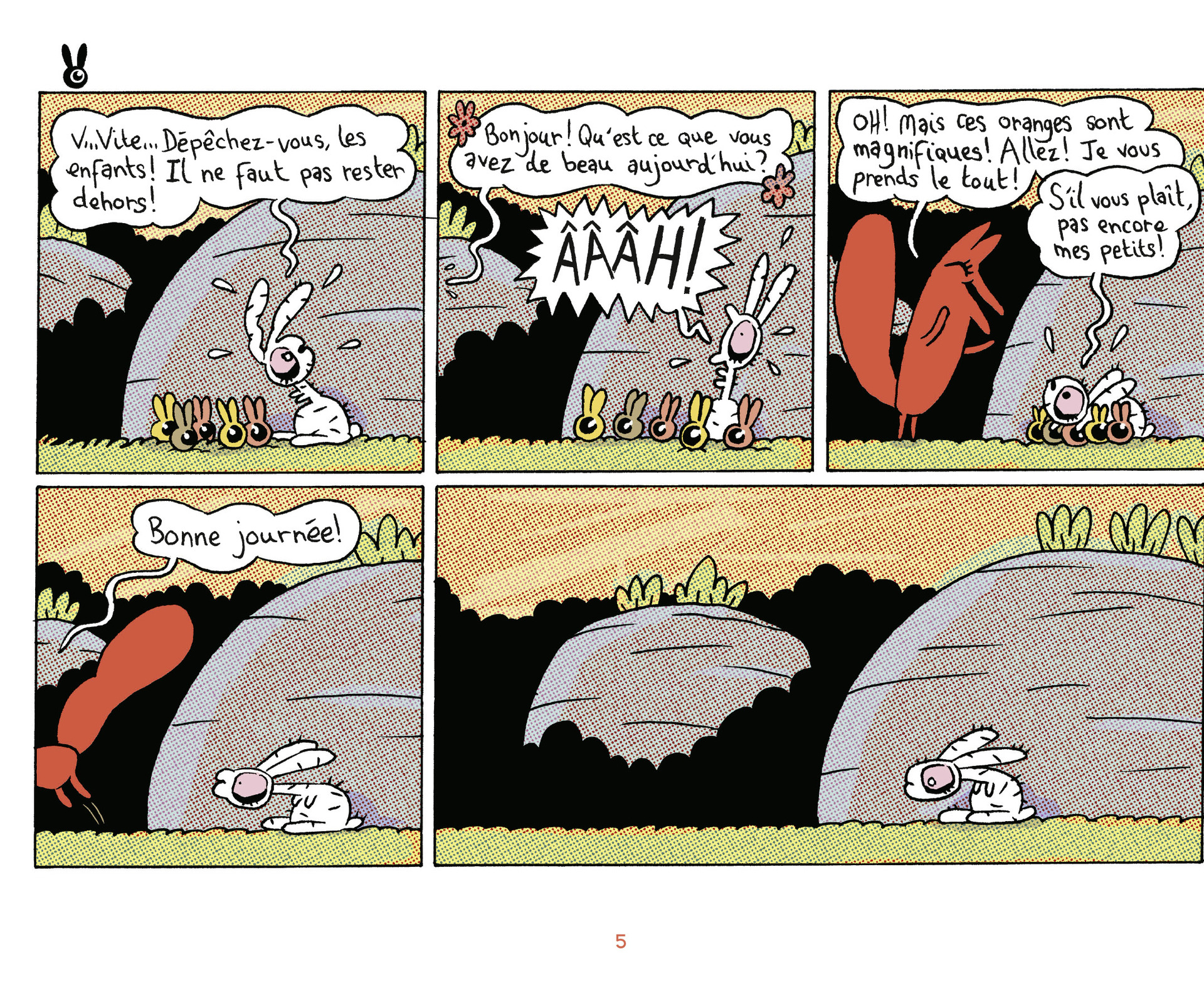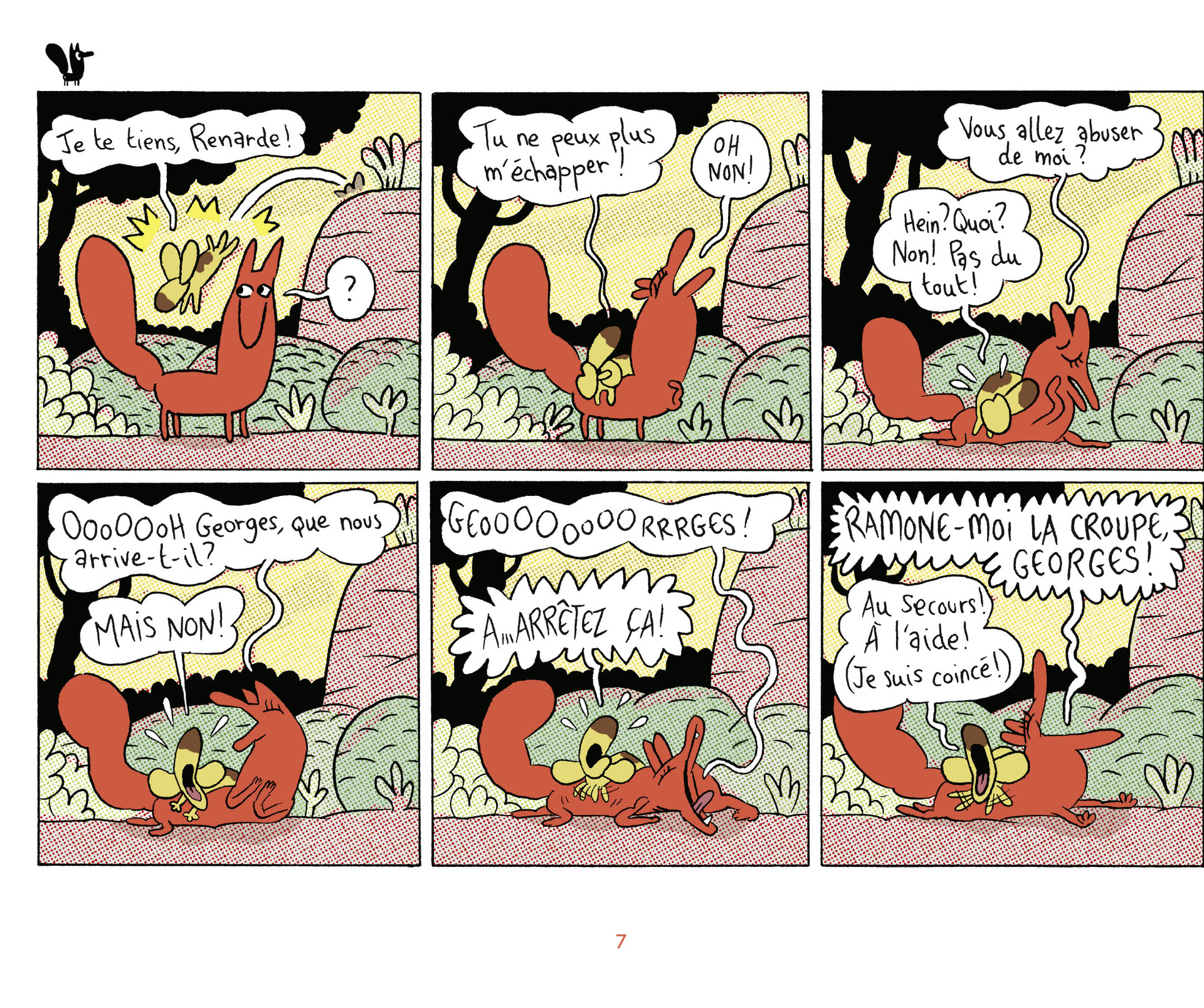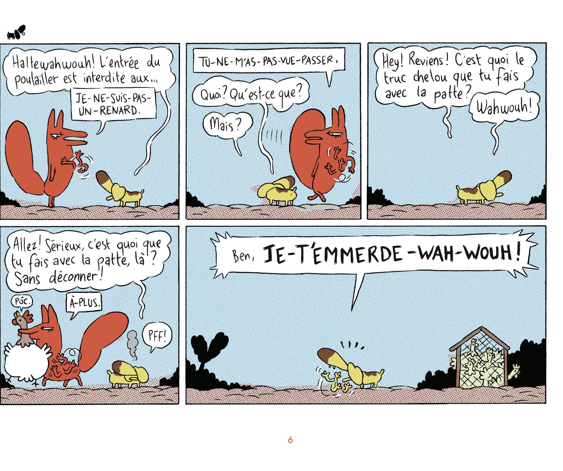 Amoureux des lapereaux mignons, des fermiers sympathiques ou des chiens de garde efficaces, cet album n'est pas pour vous. Car la Renarde, monstre de drôlerie, obtient toujours ce qu'elle veut, quoi qu'il en coûte à ses adversaires ! Cette pro de l'arnaque au pelage chatoyant met sens dessus dessous la petite communauté rurale qui l'entoure. Elle mange les bébés de madame lapine, bouffe les poules du fermier et les fait tous tourner en bourrique... même Kevin le cheval. Un personnage à la malice méphistophélique qui aligne les gags à la mécanique parfaite.