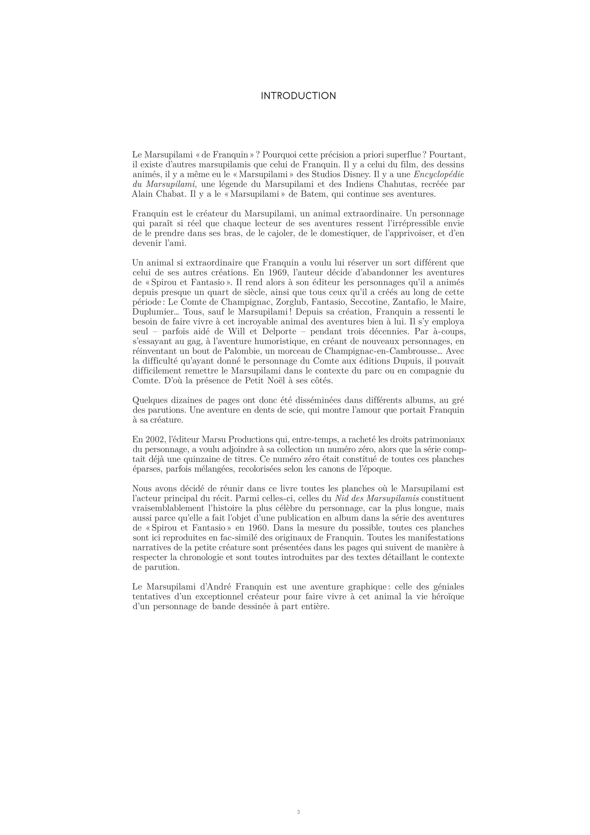 Le Marsupilami d'André Franquin est une aventure graphique : celle des géniales tentatives d'un pionnier pour faire vivre à cet animal la vie héroïque d'un personnage de bande dessinée à part entière.