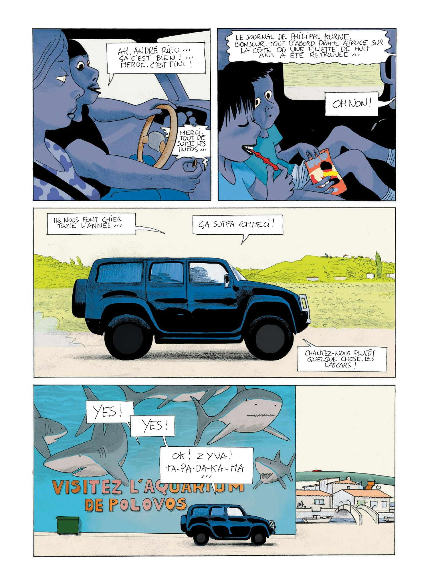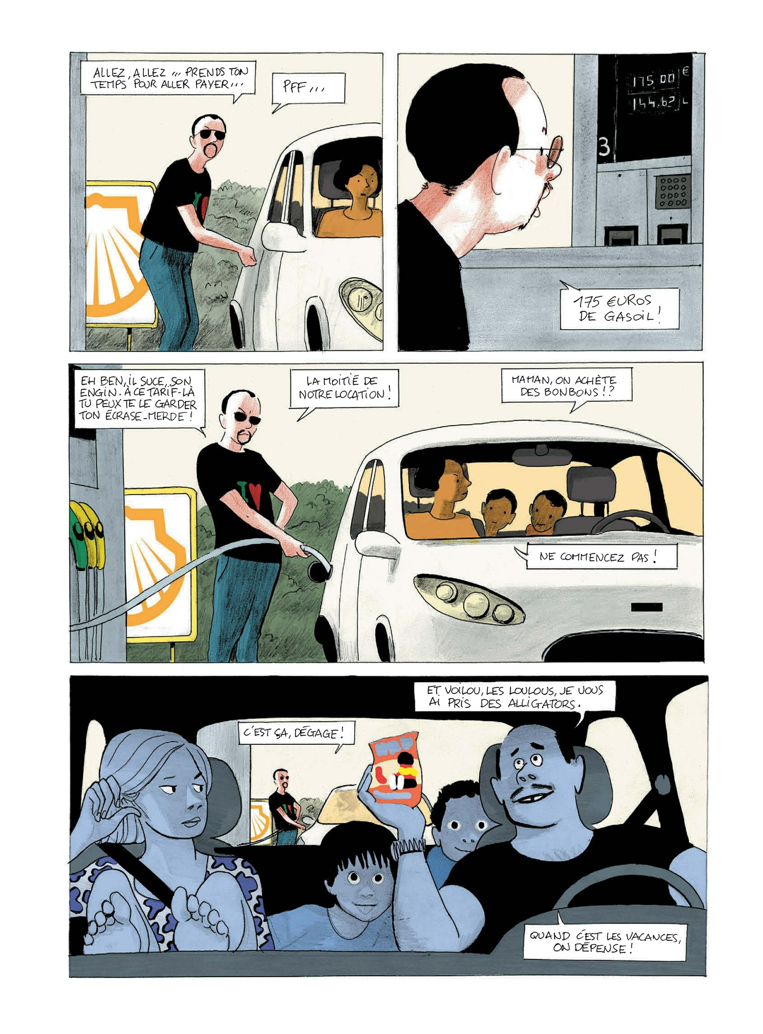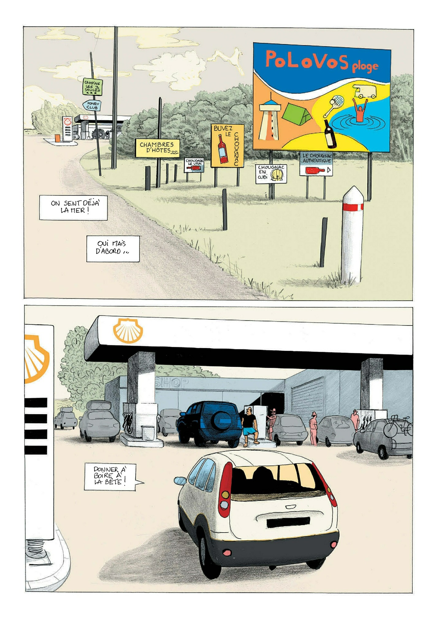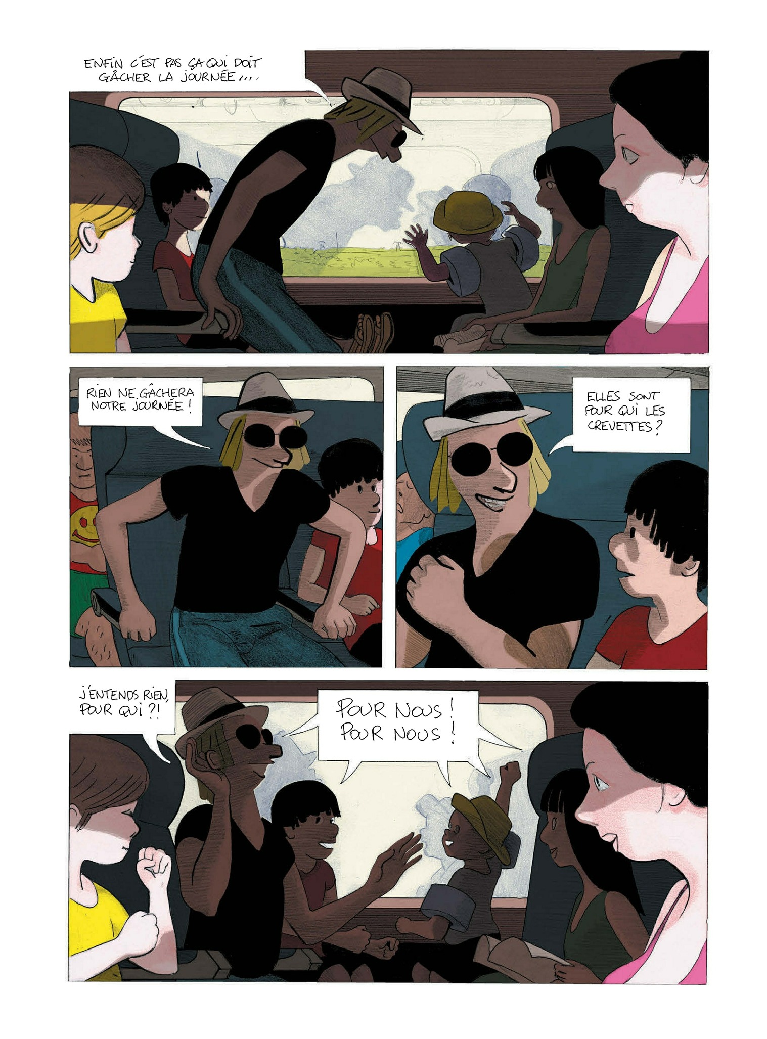 Madame enfile son maillot à l’abri de sa serviette avant de se faire bronzer « seins nus ou pas seins nus ? Allez, seins nus. » Monsieur prépare son matériel de pêche tel un guerrier conquérant. Les enfants sont déjà dans l’eau, le chien à leur trousse, au matin on pense au repas du soir sans oublier de prévoir une case apéro. La plage est un formidable terrain de jeux où « les adultes rêvent et restent les enfants qu’ils ont toujours été », un observatoire de la trivialité humaine dans son plus simple appareil – ou presque. Prudhomme et Rabaté sont allés eux aussi à la mer. Avec un grand souci du détail, ils orchestrent un ballet d’estivants en déroulant autant de figures typiques. Un portrait chorale drôle, tendre, qui gratte à peine. Comme du sable dans les sandales.