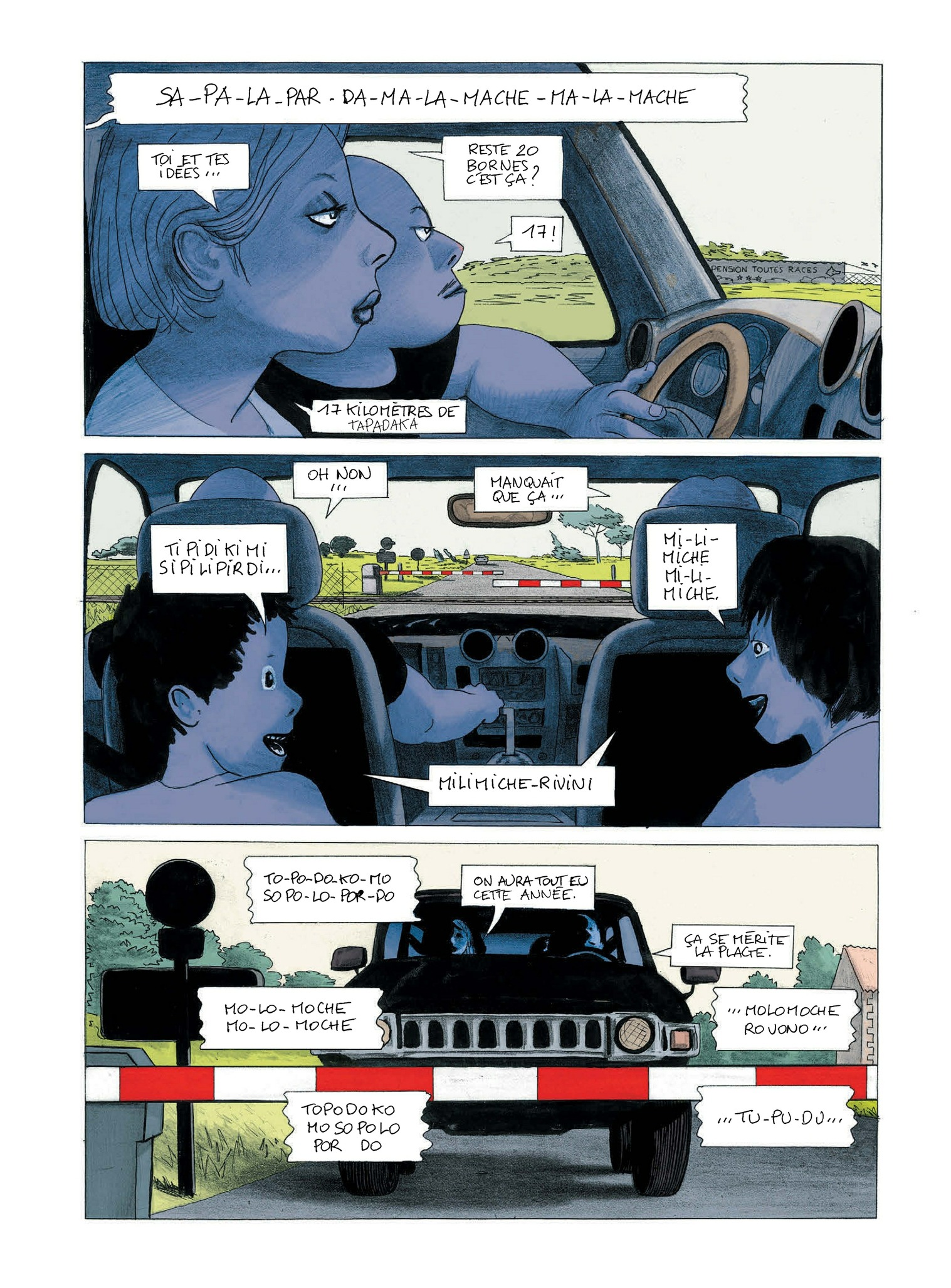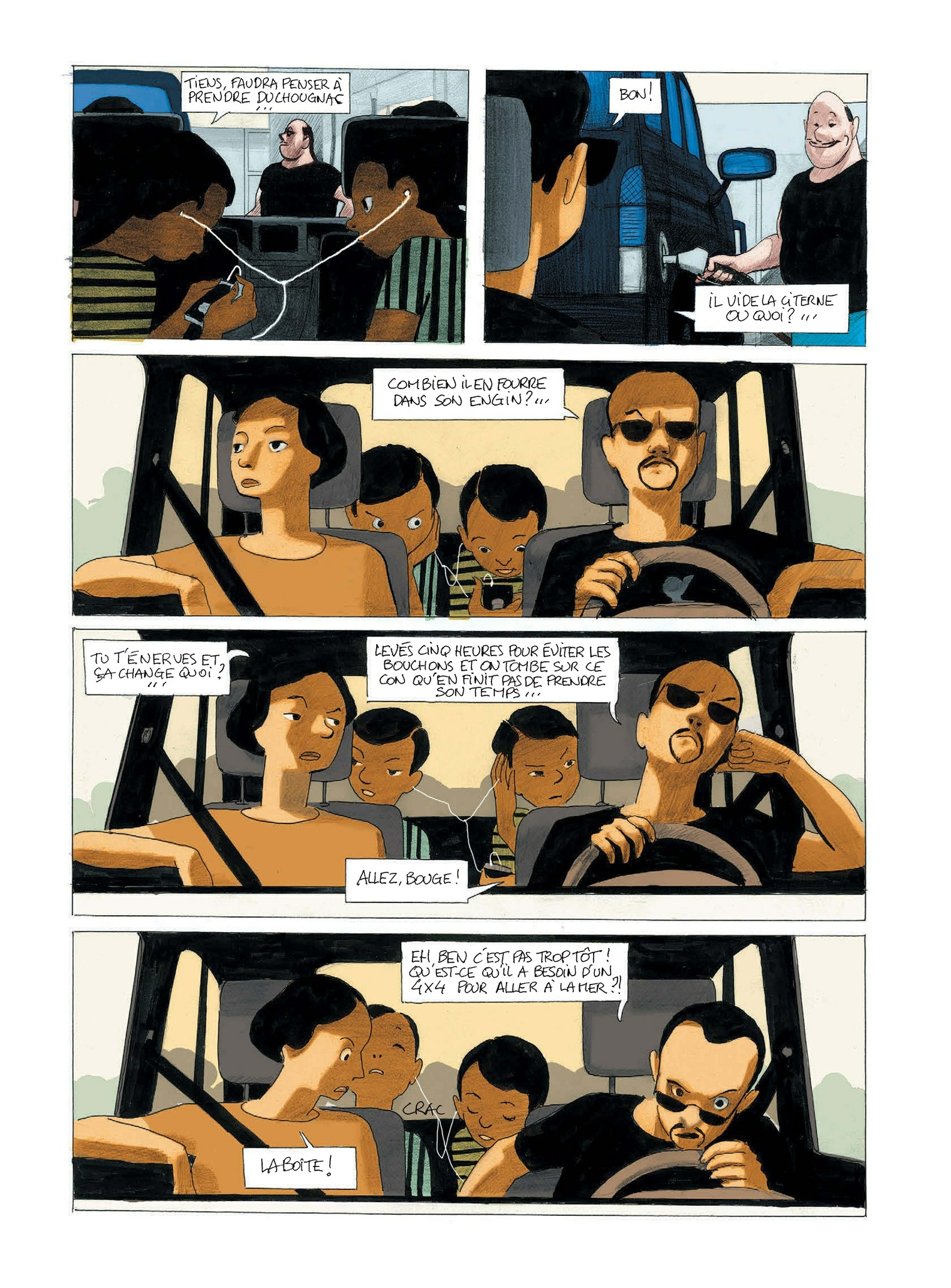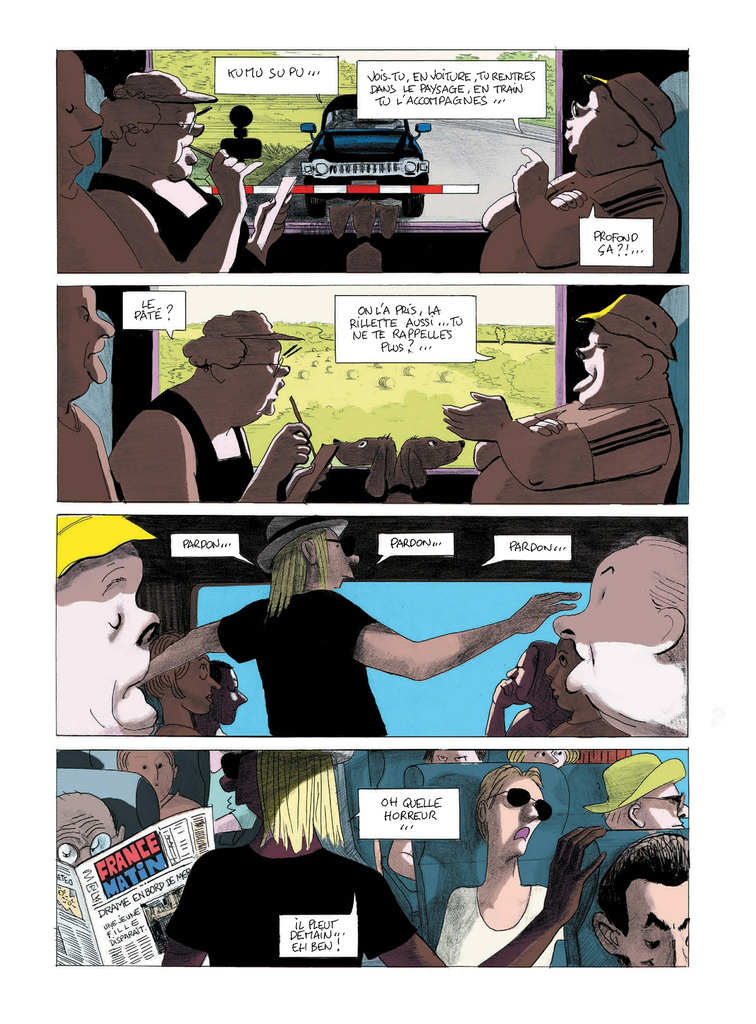 8Voici un album écrit « à deux têtes et deux mains, une gauche et une droite » comme le revendiquent les auteurs en page de titre. On va y découvrir quelques échantillons d’humanité en partance pour la plage : voyage en train ou en voiture, en famille ou en couple, pour la journée ou pour plus longtemps… Les conversations vont bon train : remarques acerbes sur les autres vacanciers, « engueulades...