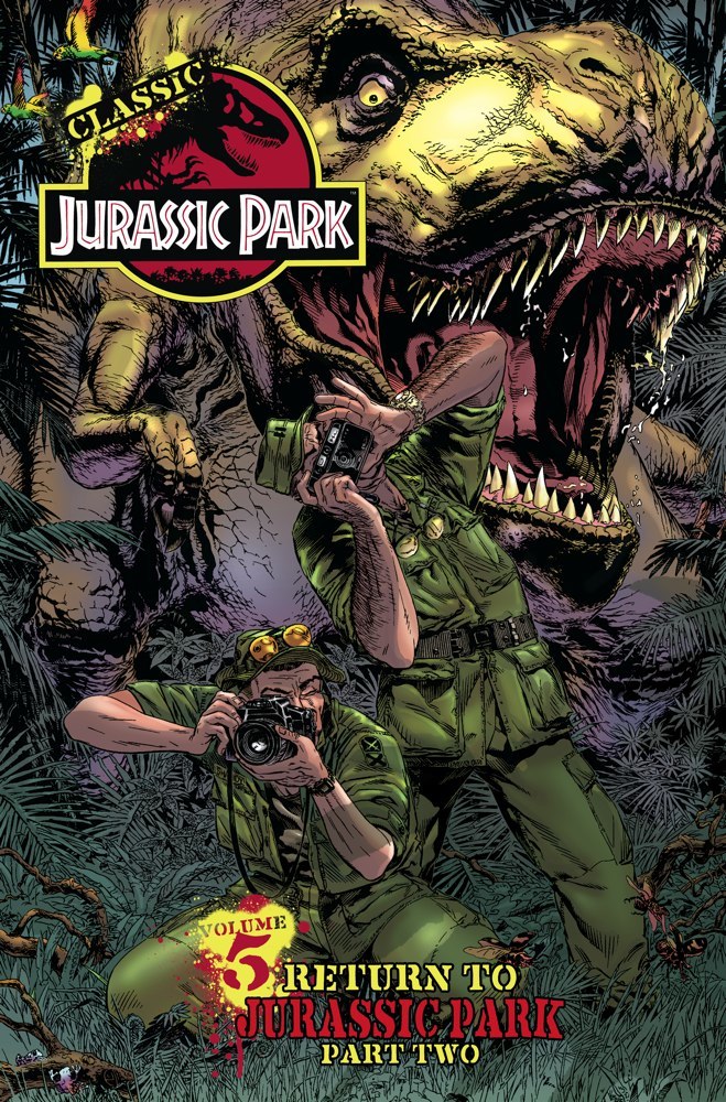 Classic Jurassic Park Volume 5 continues the Return to Jurassic Park series with issues #5–9. Contains the stories "Heir To The Thunder" and "Photo Finish", which detail researchers Derek and Abby's brush with an insane scientist and the aftermath of his plot to speed up the evolution of the newly-reintroduced dinosaurs. Also contains the "Jurassic Jam" issue with over 30 artists taking a turn including John Byrne, Michael Golden, Walter Simonson, and many more.
