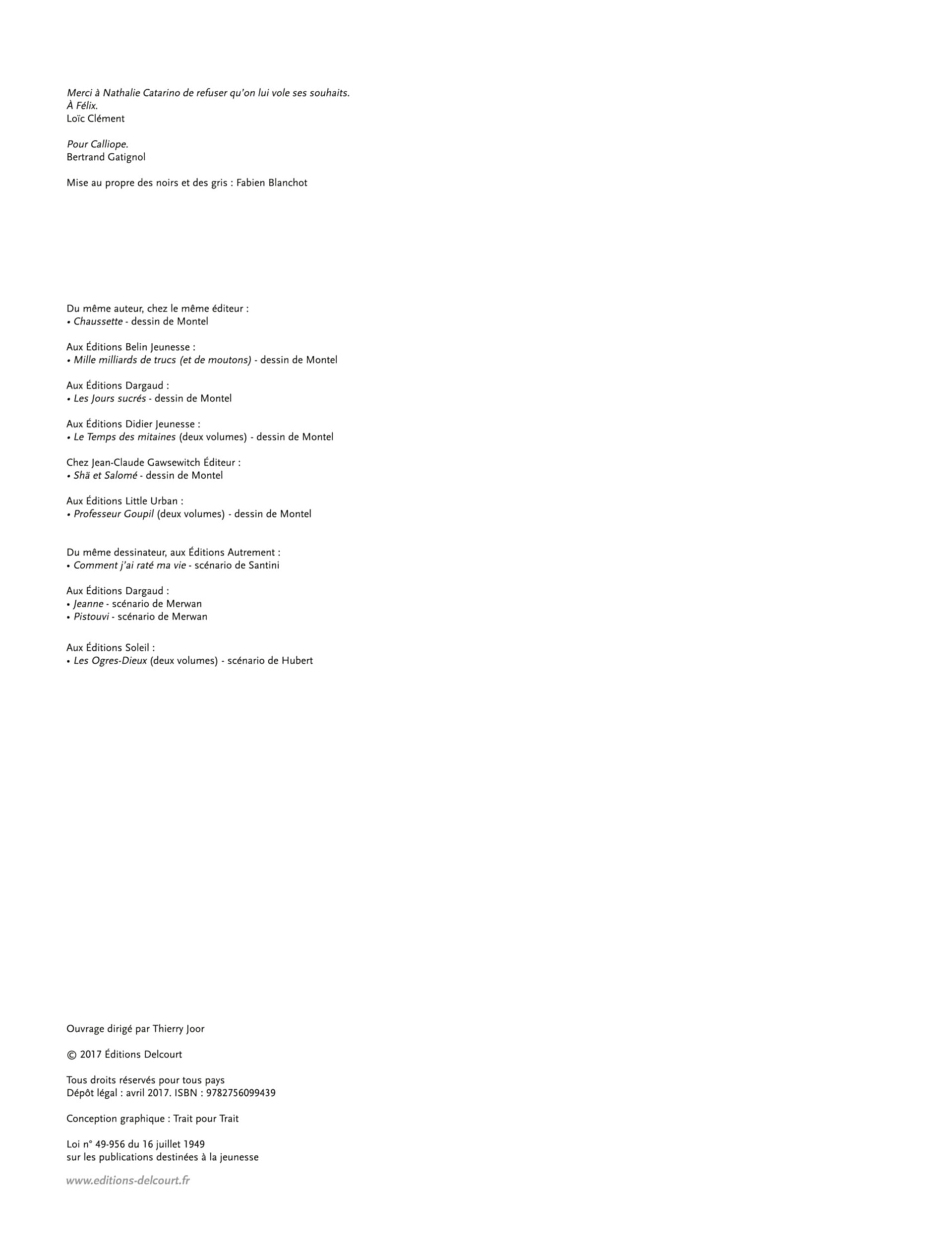 8Félix ruse pour voler les souhaits des personnes qui éternuent et les mettre en bocaux… Mais il va rencontrer Calliope qui n'a aucun souhait. Est-ce réellement possible? Loïc Clément, au scénario, et Bertrand Gatignol, aux dessins et couleurs, ont mélangé période actuelle et magie pour ce conte fantastique qui permet de réfléchir sur l'importance des vœux que chacun porte en lui. Un joli con...