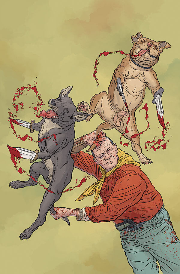 Bullets, claws, and fists fly when the evil congress of King Crab and the Revengers play their final trump card and attempt to pass a ban on the Shaolin Cowboy, who filibusters heads in the most dogged way possible. Who has the stronger constitution? Find out in issue #4!!!!!!