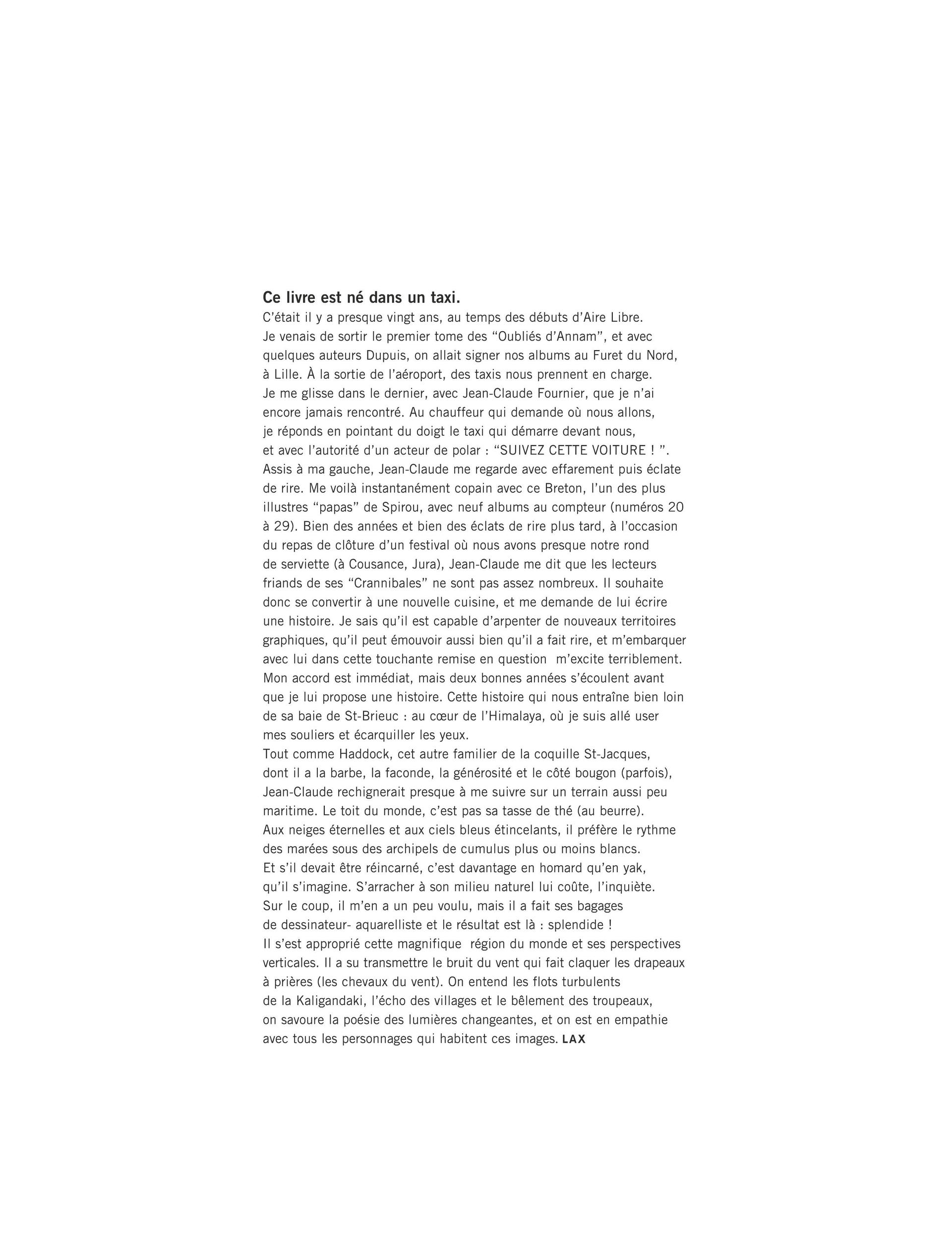 Allégorie de l'âme humaine, drapeaux de prière multicolores ondulant sous la brise, "Les chevaux du vent" de Lax et Fournier emportent leur lecteur au grand galop parmi les cimes enneigées de l'Himalaya. À travers le destin tragique d'une famille séparée par l'amour, les maux et la guerre, cette fresque resplendissante invite à s'interroger sur le sens de nos vies, sur l'importance de nos décisions et la force de nos sentiments. C'est toute l'histoire de l'humanité qui se retrouve ici condensée, depuis la lutte entre deux frères pour une même femme jusqu'au périple entamé par le père afin de réparer ses erreurs et de chasser les remords qui l'accablent, alors même que les conquêtes militaires et la méfiance meurtrissent le paysage comme les hommes.