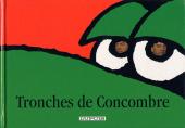 Autour et dans le cactus blockhaus dressé au milieu du désert, s’agitent des personnages récurrents, Chourave, fidèle copain, un soleil à gros nez, des éléphants ou un réveil souvent tabassé. Après Les aventures potagères du Concombre Masqué, ce sera Le retour du concombre masqué avec Archimède qui habite le cerveau du légume. Celui-ci démasqué et vieilli racontera Comment devenir maître du monde avant d’être chef de gare dans La vie quotidienne du Concombre Masqué guettant le passage de baleines des sables. Une carte au trésor laissée par son aïeul l’amènera À la poursuite du Broutchlague Mordoré génie sorti d’une lampe à souder. Il luttera contre un cinglé transformant ses adversaires en patates et le vaincra dans le Concombre contre le Grand Patatoseur . Un héros devenu mythique pour ses fans, à découvrir pour les plus jeunes. " Bretzel liquide ! ", " Keskeucé ? " et autres expressions favorites du légume, un jeu subtil avec les mots, un langage réinventé.
