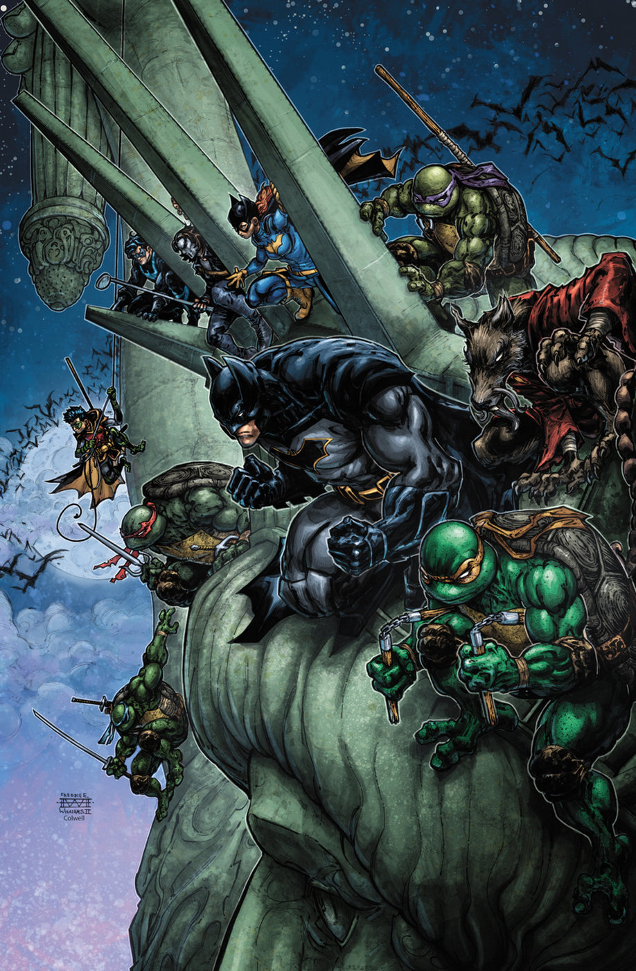 It’s the final battle as the Bat-family and the Turtles face off against Bane and the Foot Clan on Liberty Island. With America’s great symbol of freedom watching over them, the Dark Knight and the Heroes on a Half-Shell must bring Bane’s tyrannical rule over New York to an end. And don’t forget about Shredder. What role will that deadly villain have to play in all of this? It’s all-out action in this exciting series conclusion.